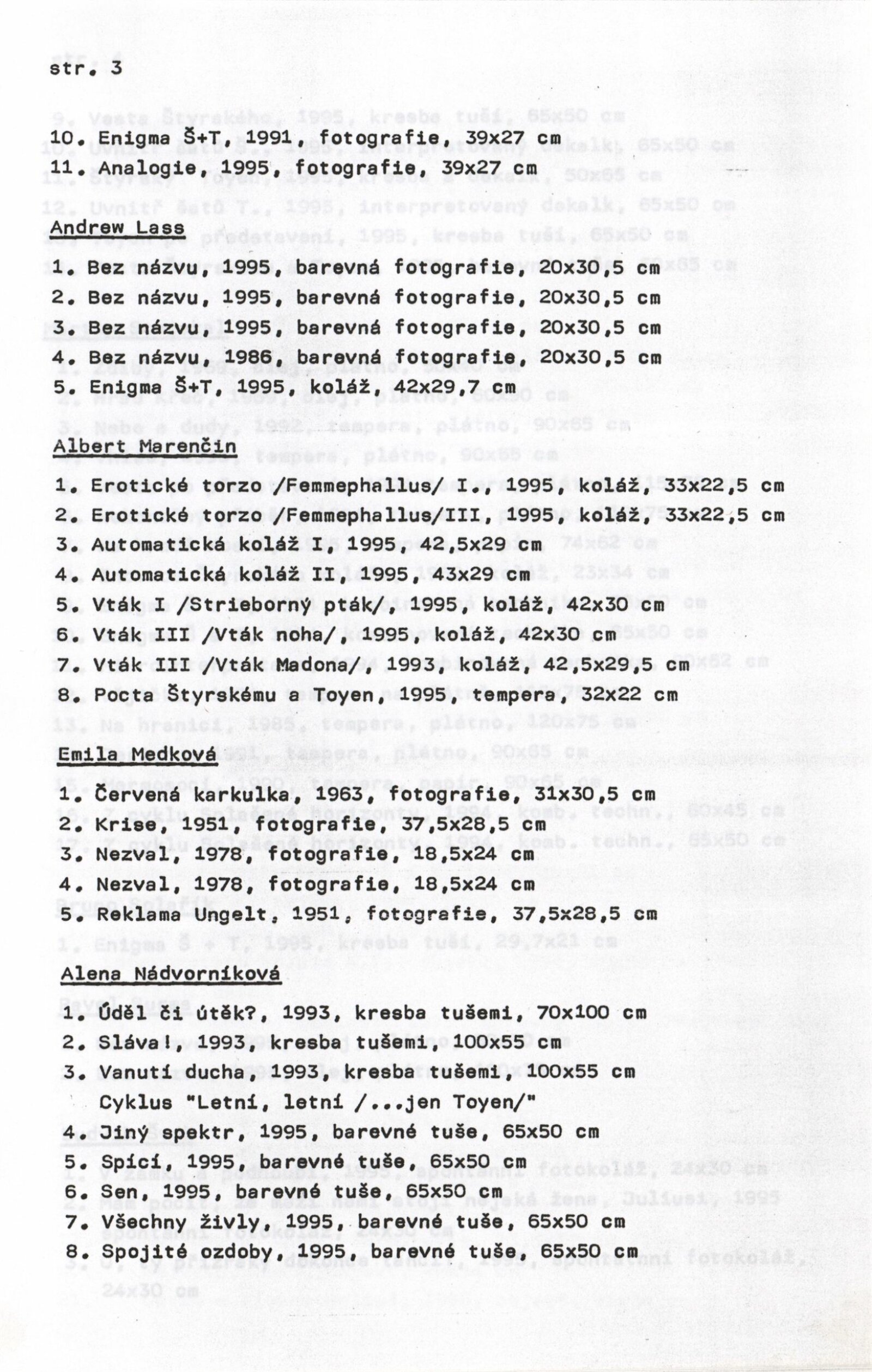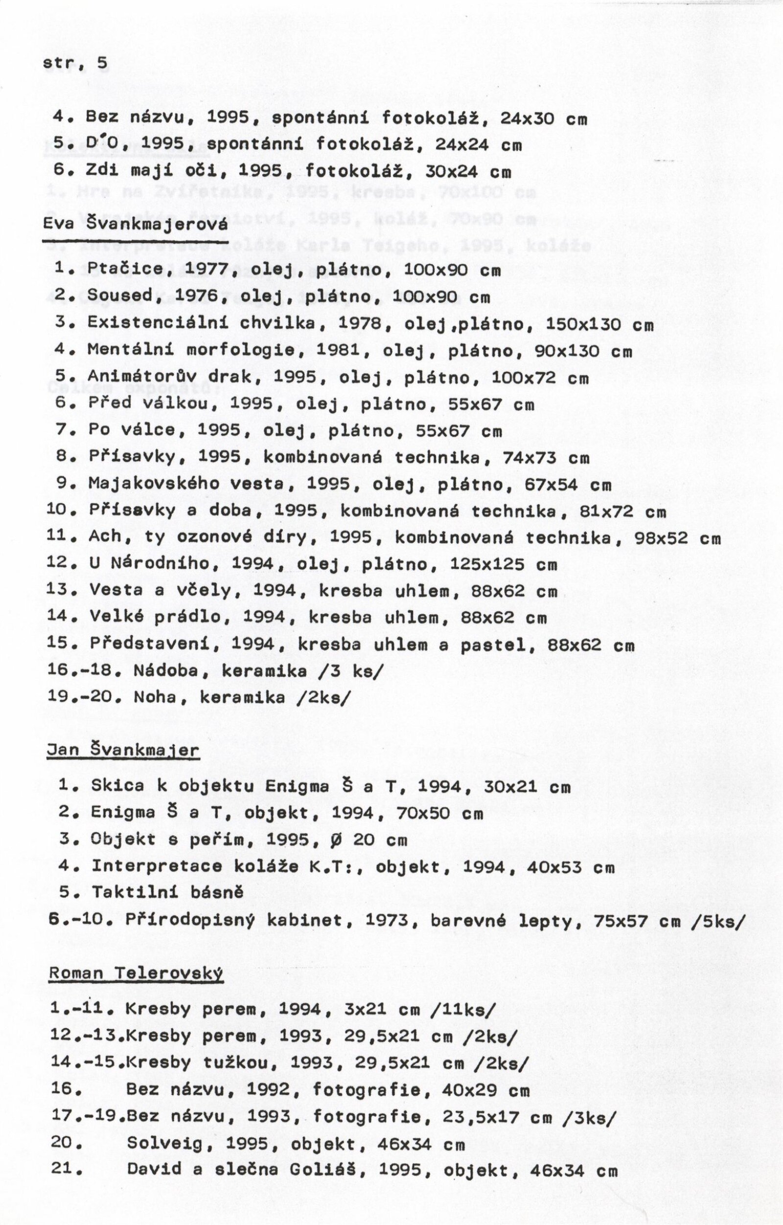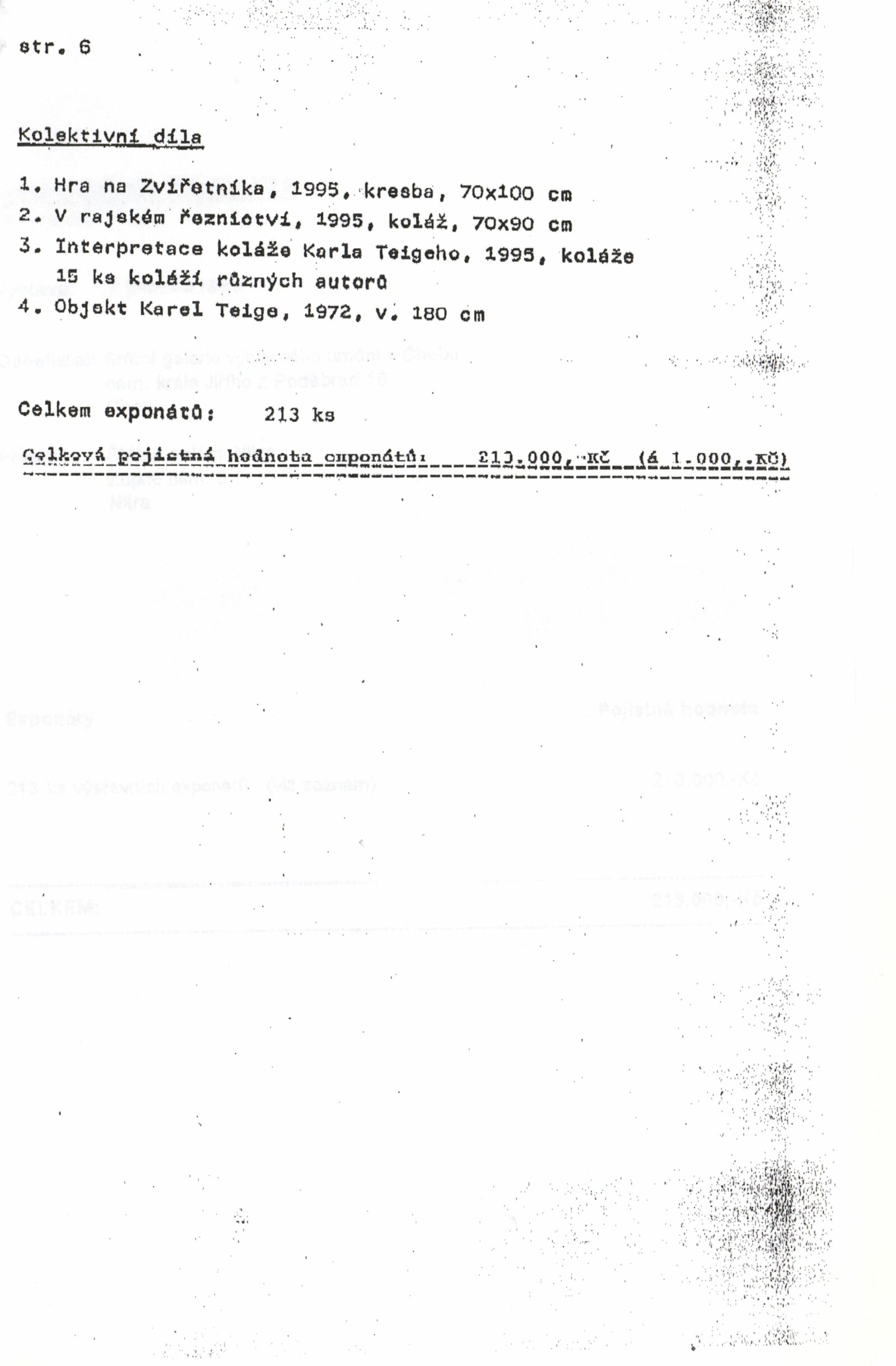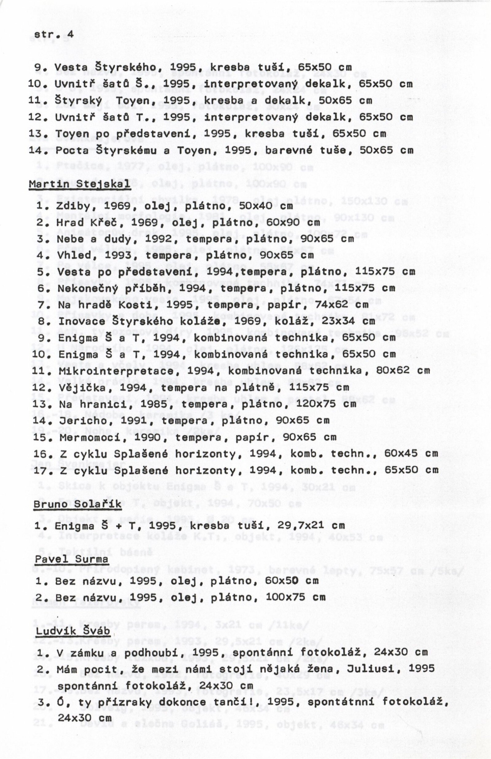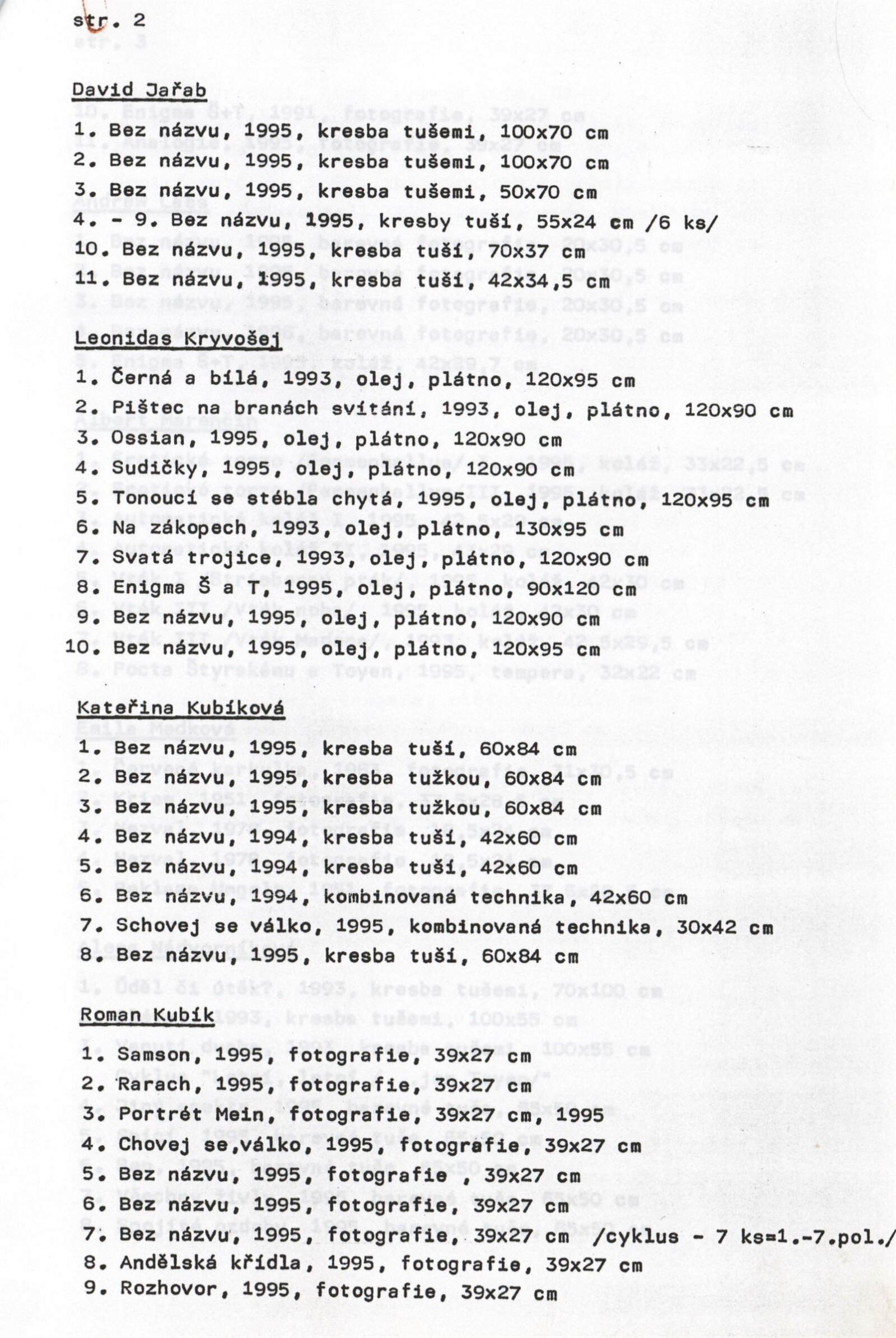 pozvánka, katalog, fotografie z vernisáže, seznam vystavených děl, provozní korespondence, korespondence o realizaci výstavy, potvrzení pro celní zprávu, osvědčení o registraci, žádost o výstavu, recenze v tisku, pozvánka Staroměstská radnice, Praha 1997