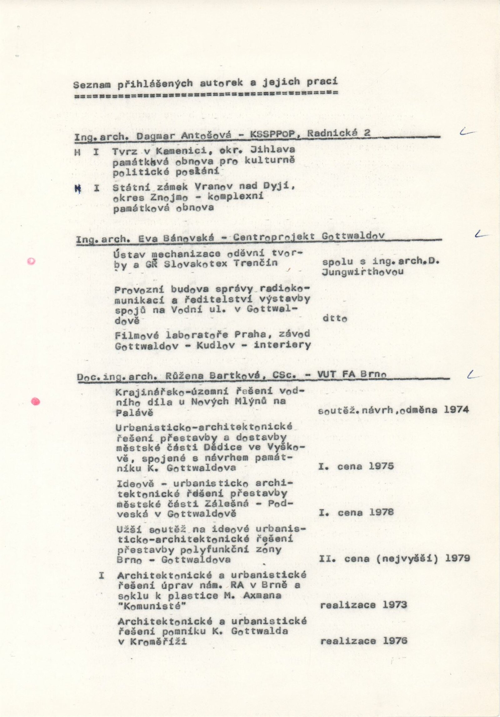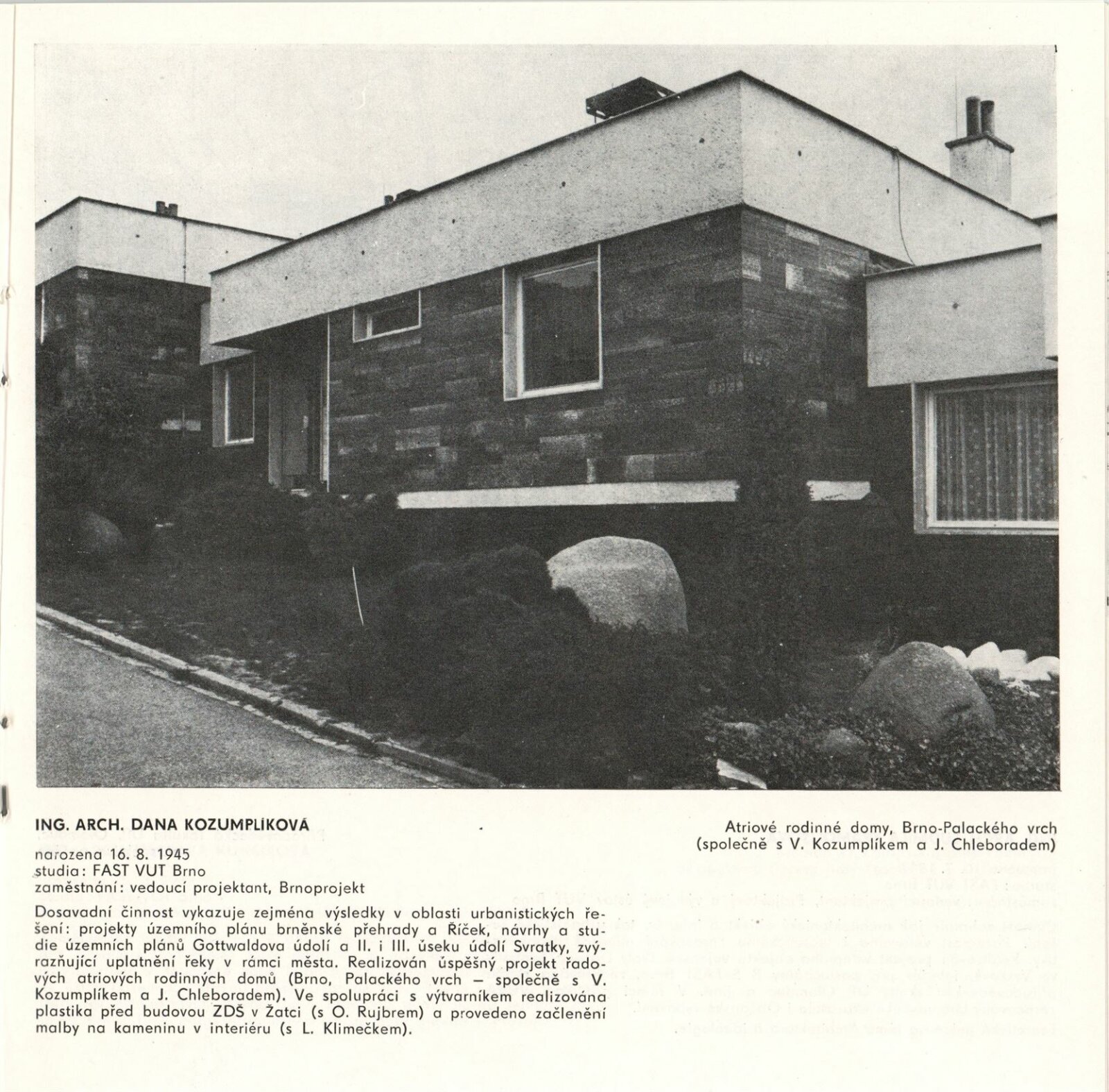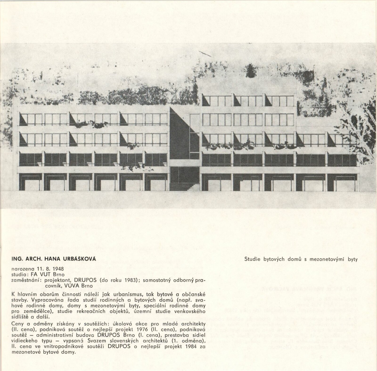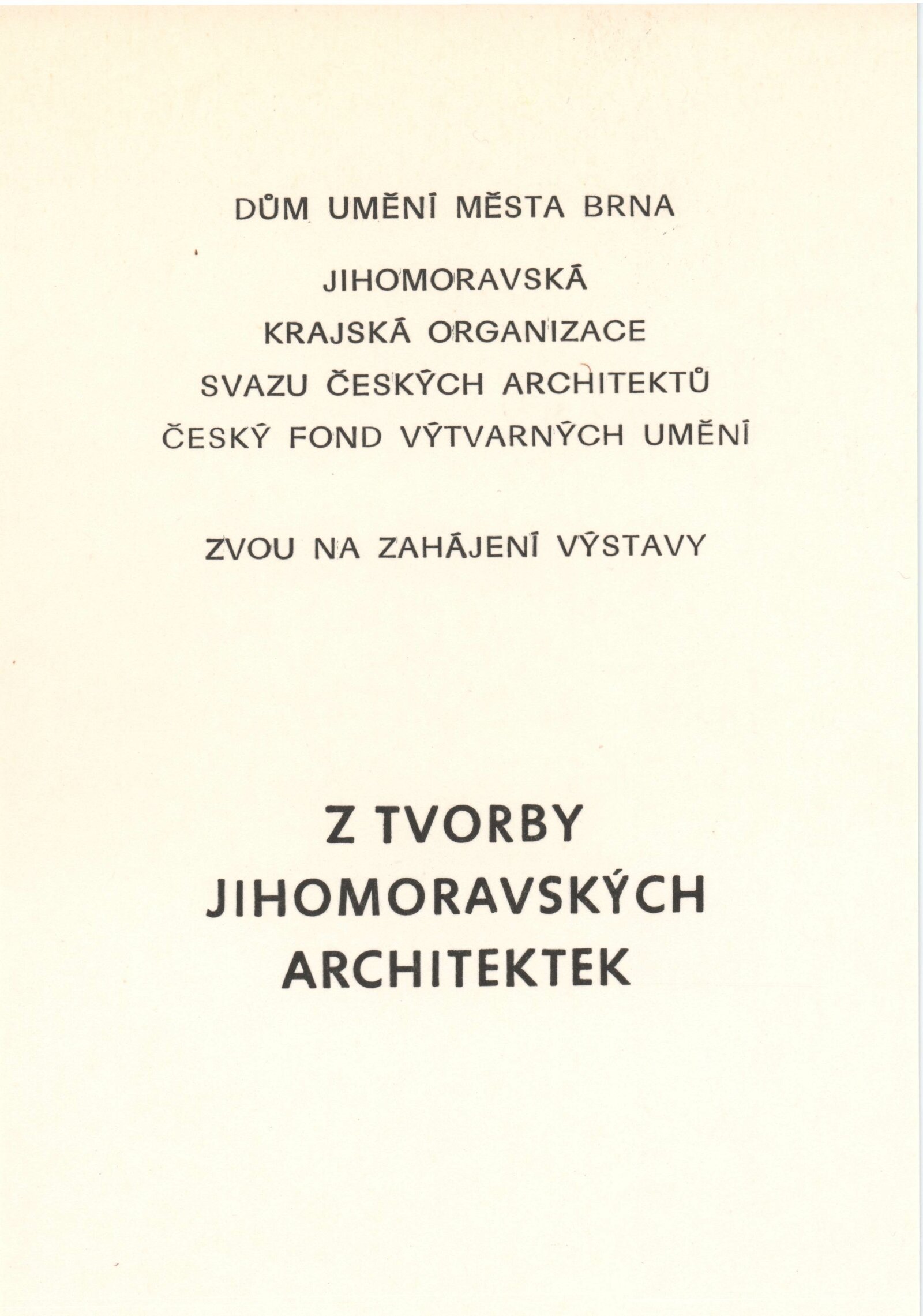 Z tvorby jihomoravských architektek. Výstava jihomoravské krajské organizace Svazu českých architektů: Dům umění, hala, 19. 2. – 31. 3. 1985 / Text: Nina Dvořáková. – Brno: DUmB, 1985. – 32 s., obr., životopisy, DU 791. – MZK; MG; MMB