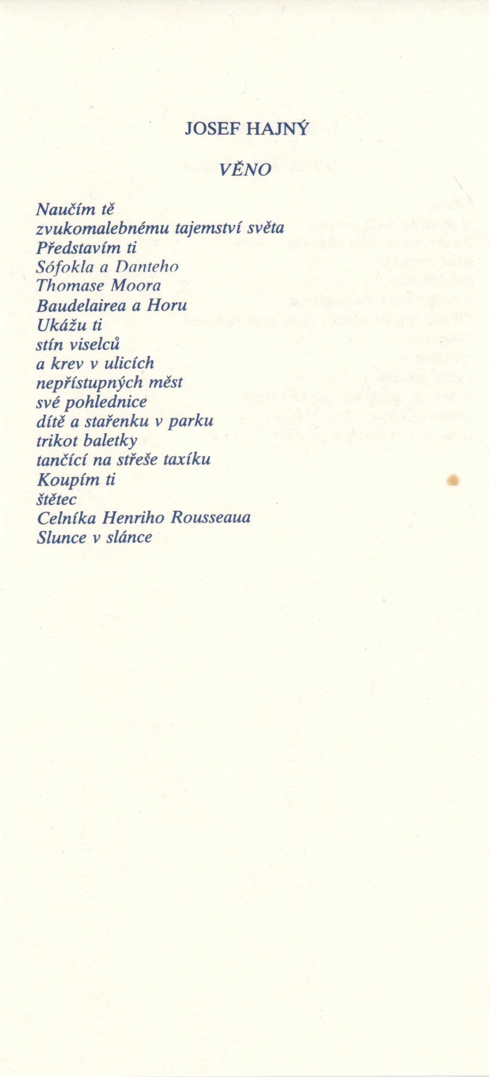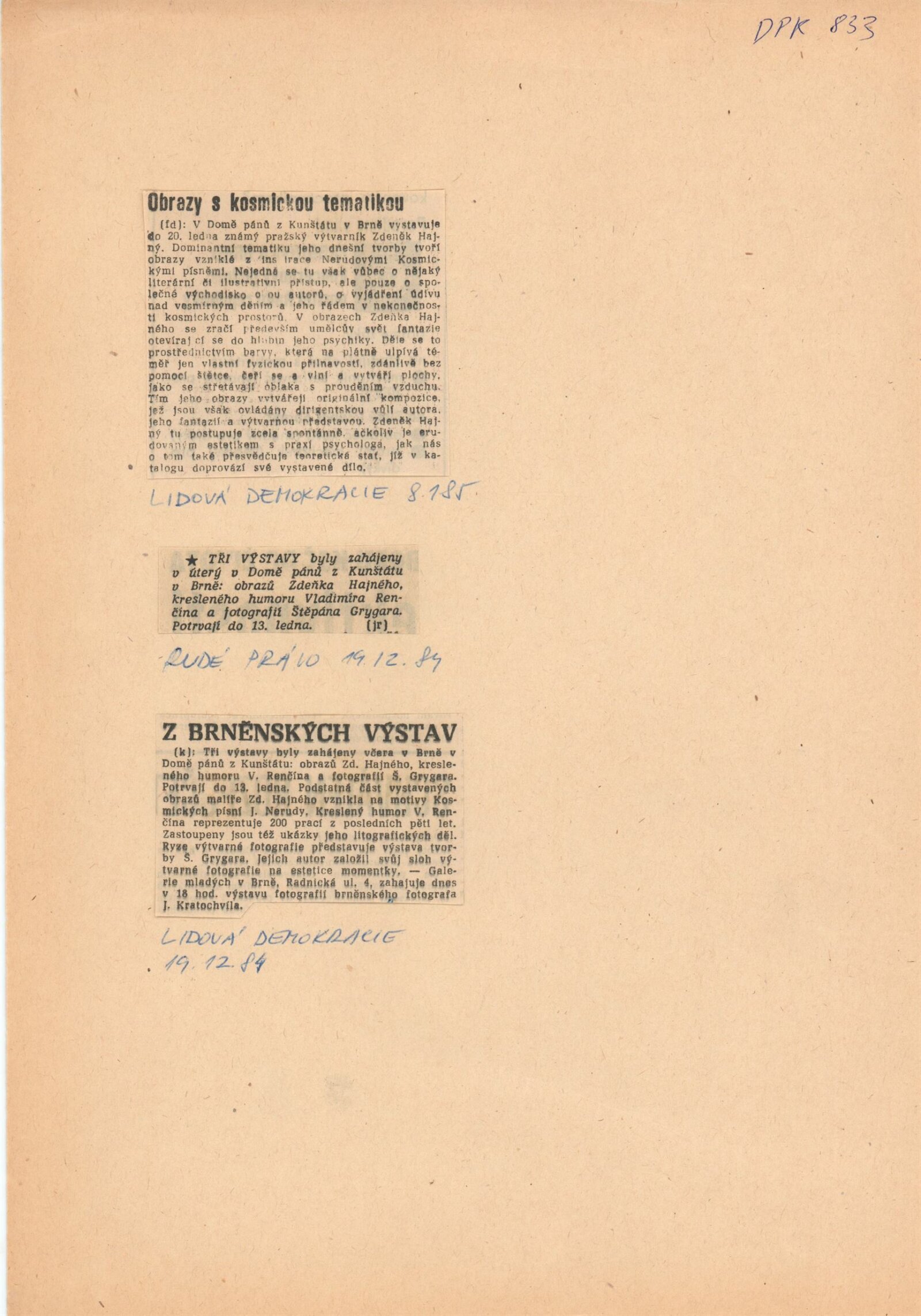 Zdeněk Hajný. Obrazy: Dům umění / Dům pánů z Kunštátu, 1. patro, 18. 12. 1984 – 13. 1. 1985 / Text: František Dvořák, autor. – Praha: Střední grafická škola, 1984. – 12 s., obr., 2 l. bar. obr. příl., portrét, životní data, výstavy, bibliografie, DPK 833