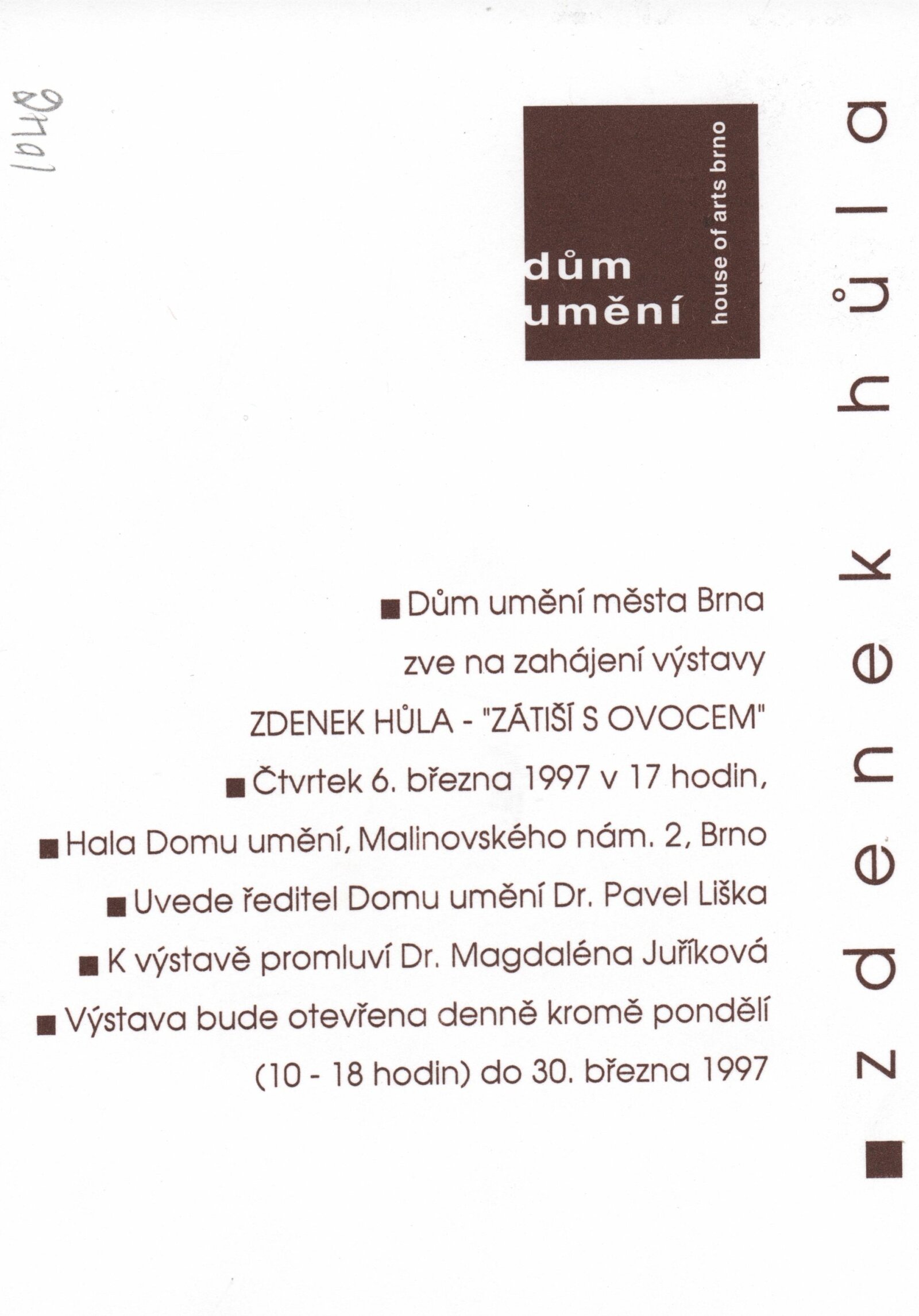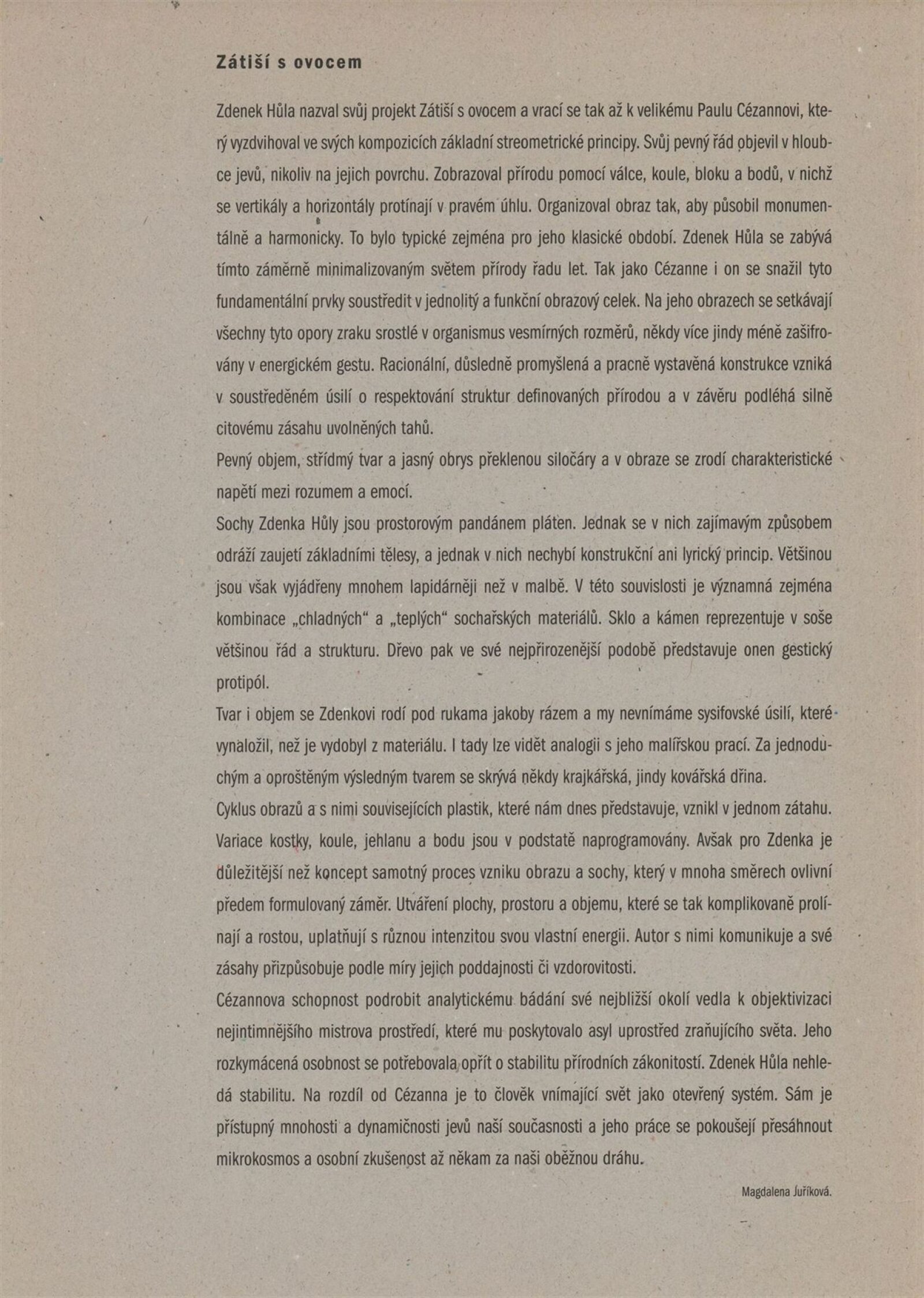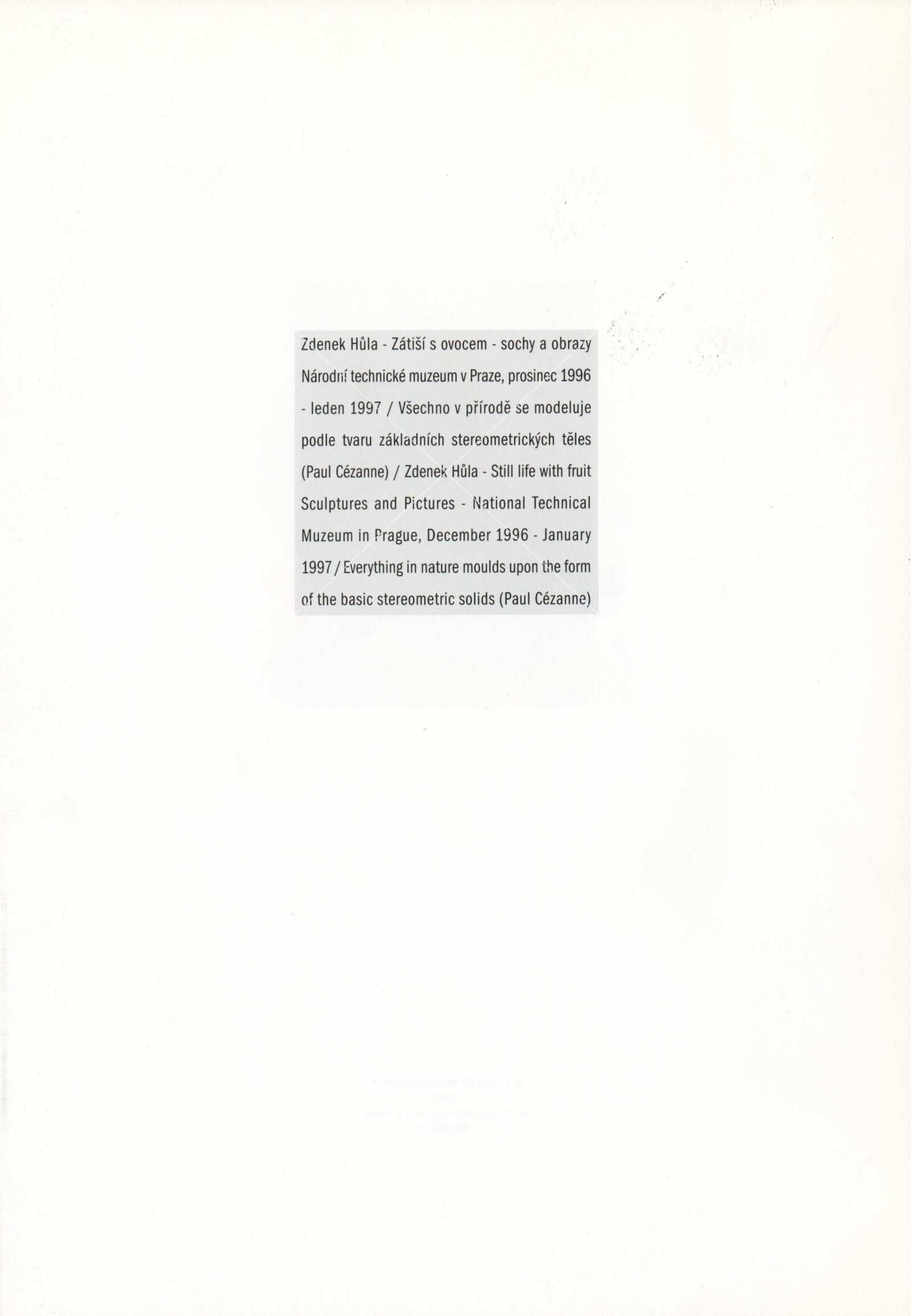 Zdeněk Hůla. Sochy a obrazy. Zátiší s ovocem: Dům umění, Brno, 4. 3. [spr. 6. 3.] – 30. 3. 1997/ Text: Magdalena Juříková. – Praha: Národní technické muzeum, 1997. – [4] s., obr., text na obalu, DU 1046