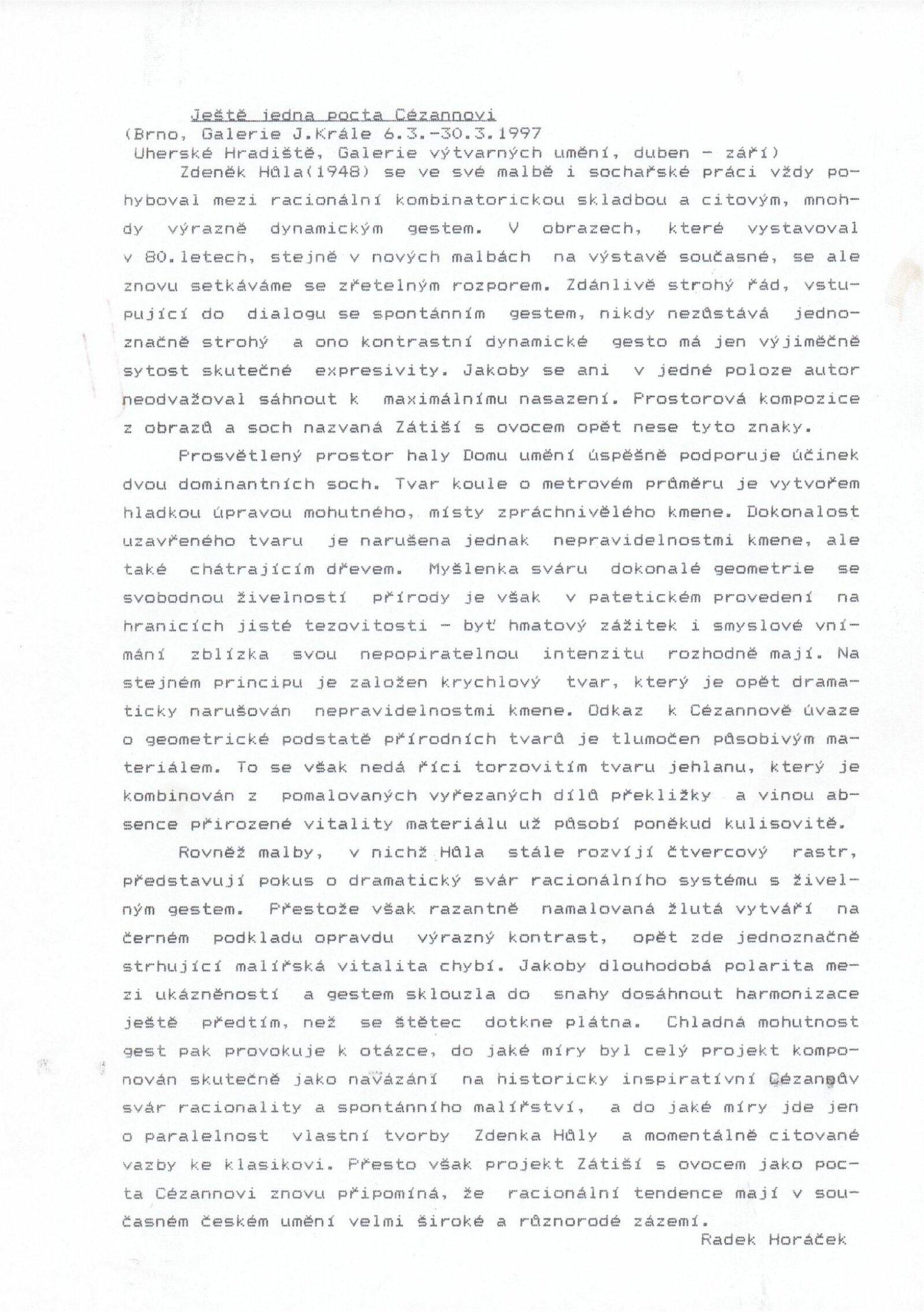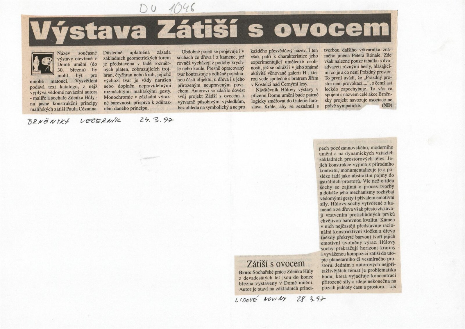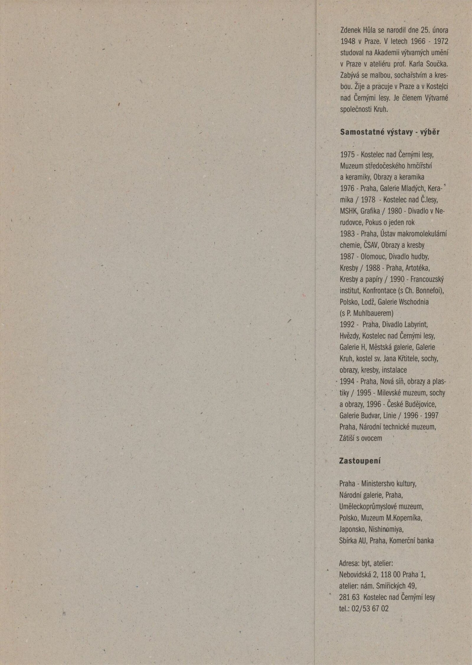 Zdeněk Hůla. Sochy a obrazy. Zátiší s ovocem: Dům umění, Brno, 4. 3. [spr. 6. 3.] – 30. 3. 1997/ Text: Magdalena Juříková. – Praha: Národní technické muzeum, 1997. – [4] s., obr., text na obalu, DU 1046