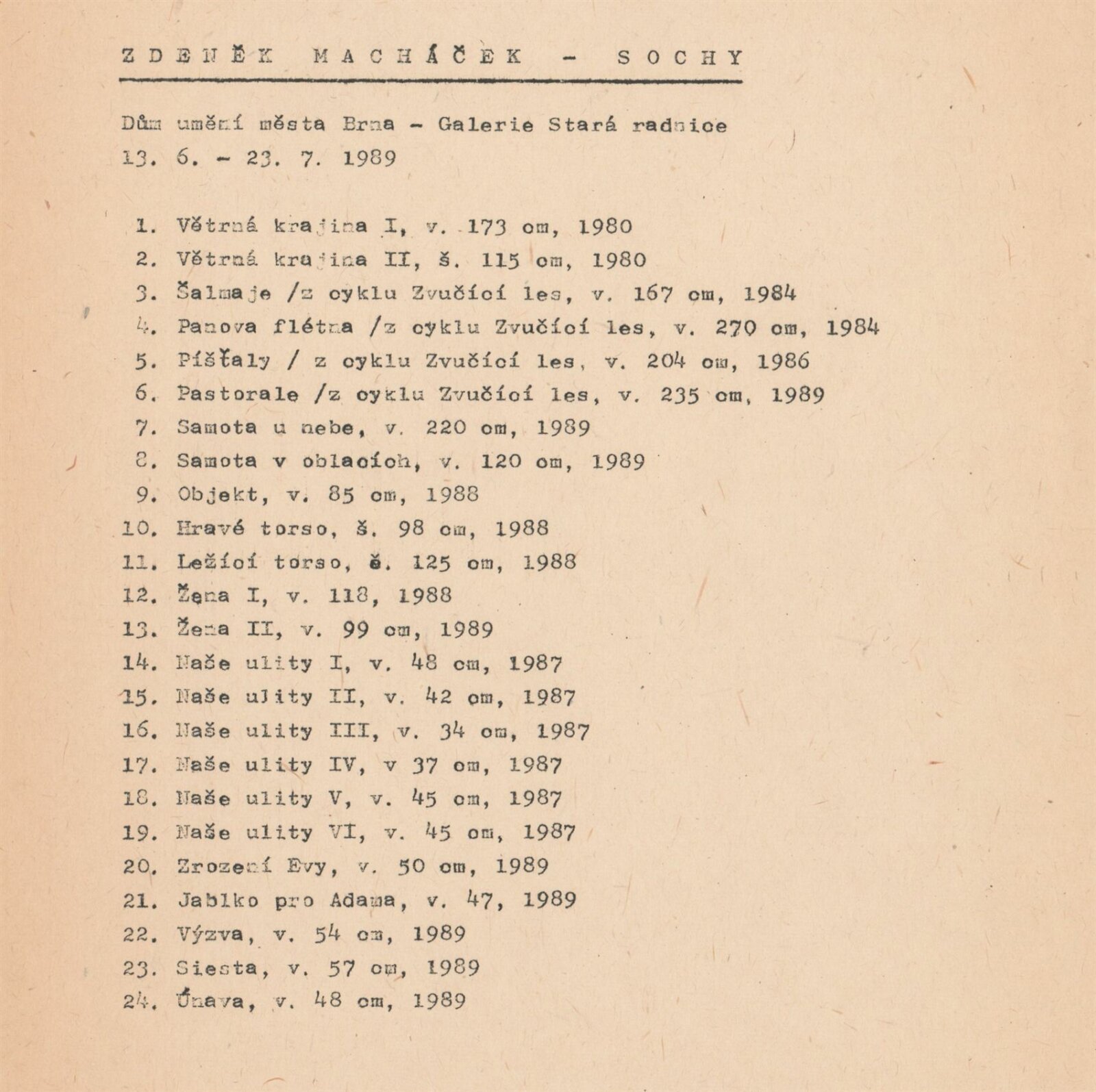 Zdeněk Macháček. Sochy: Galerie Stará radnice, 3. patro, 13. 6. – 23. 7. 1989 / Text: Nina Dvořáková. – Brno: DUmB, 1989. – [13] s., obr., seznam vystavených prací [1] s., životní data, výstavy, zastoupení ve sbírkách, GSR 50. – MZK; MG; MMB