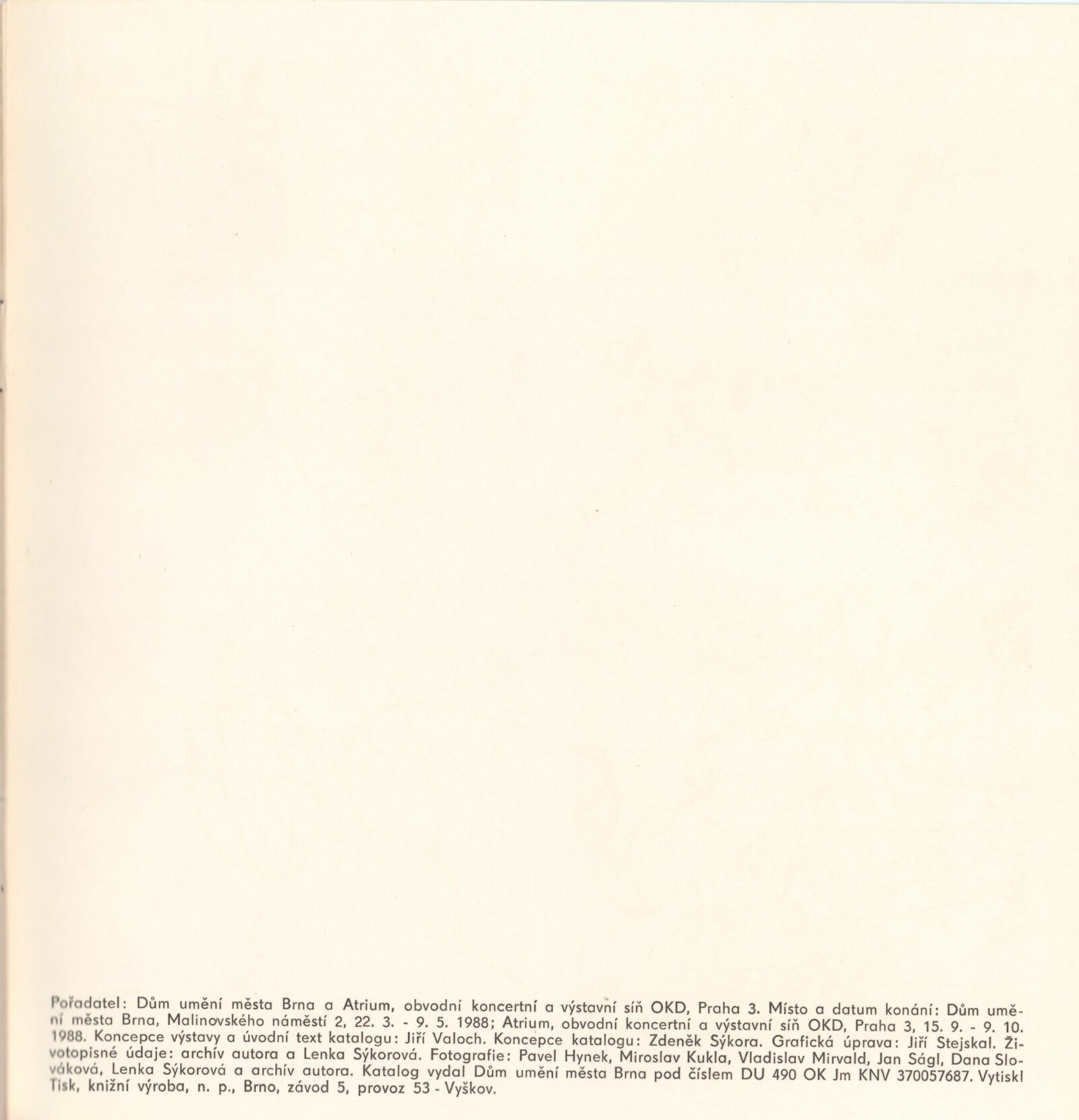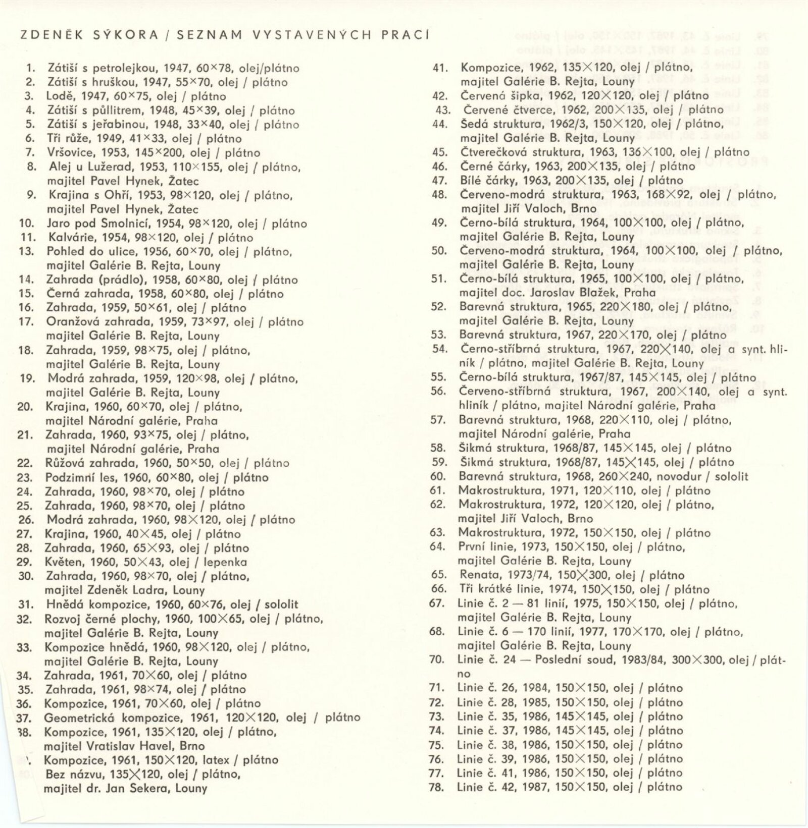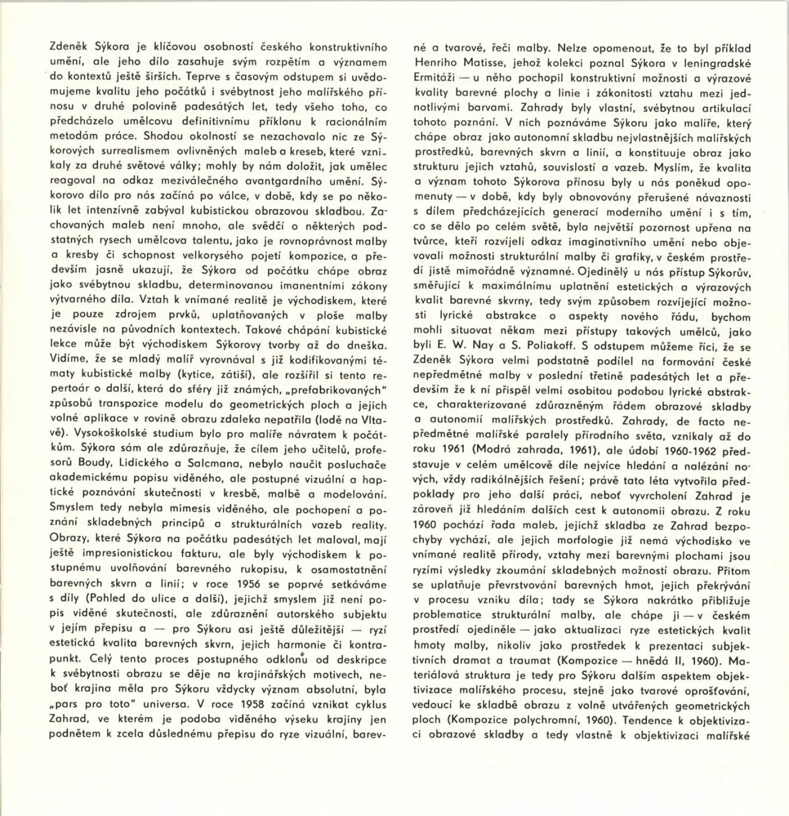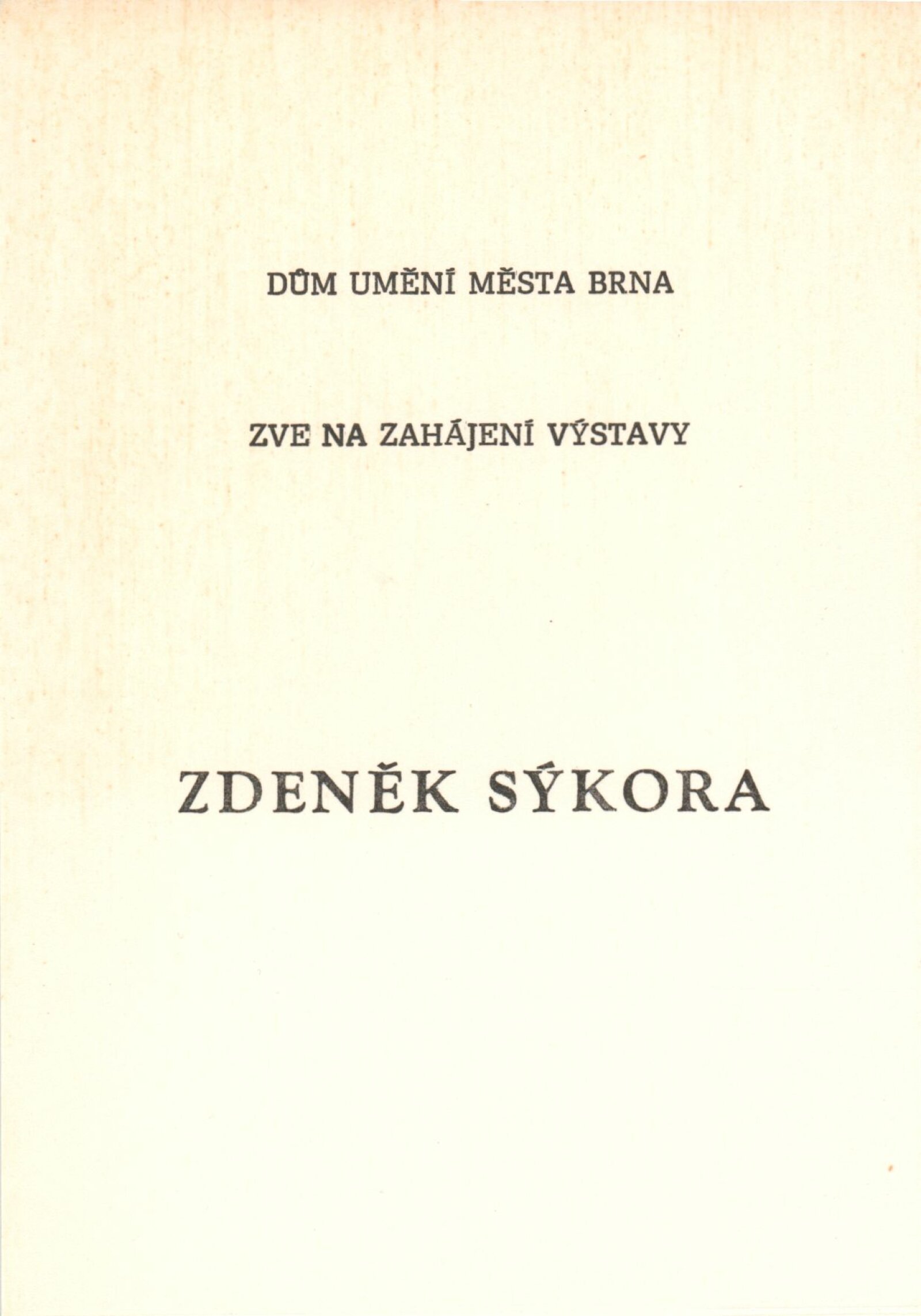 Zdeněk Sýkora: Dům umění města Brna, 22. 3. – 9. 5. 1988 / Text: Jiří Valoch. – Brno: DUmB, 1988. – [36] s., obr., seznam vystavených prací [2] s., životopis, výstavy, zastoupení ve sbírkách, bibliografie, DU 851. – MZK; MG; MMB