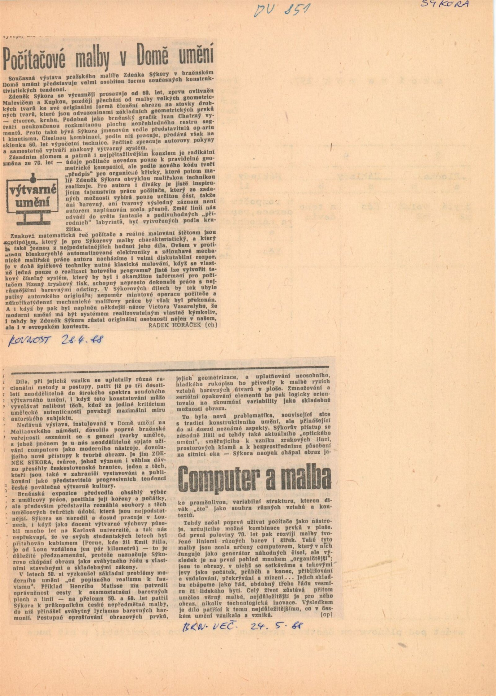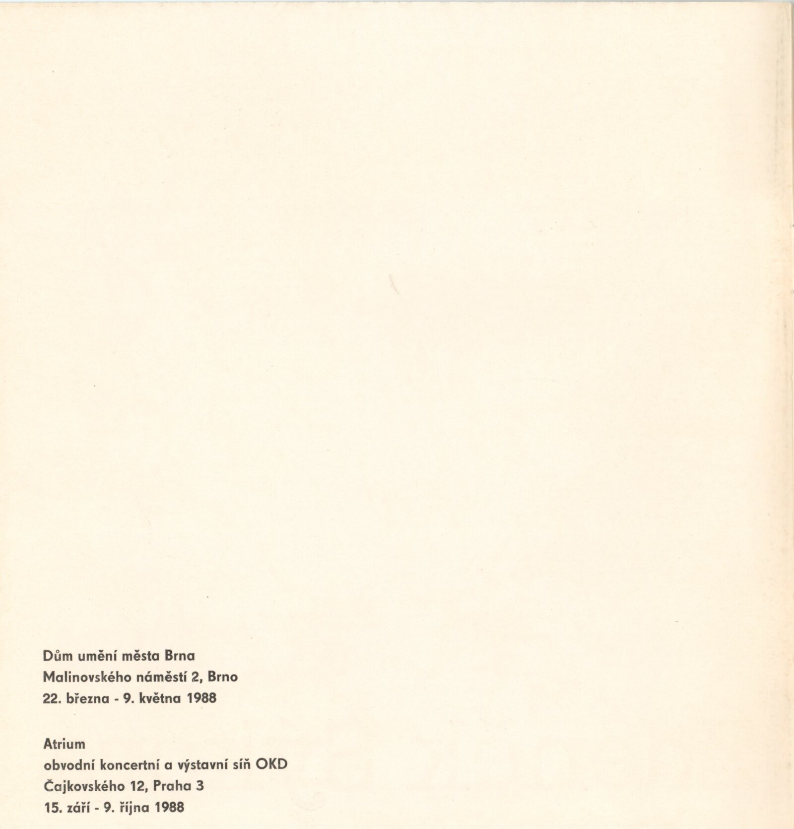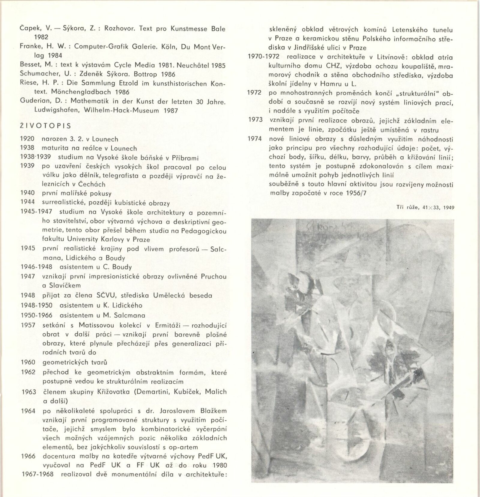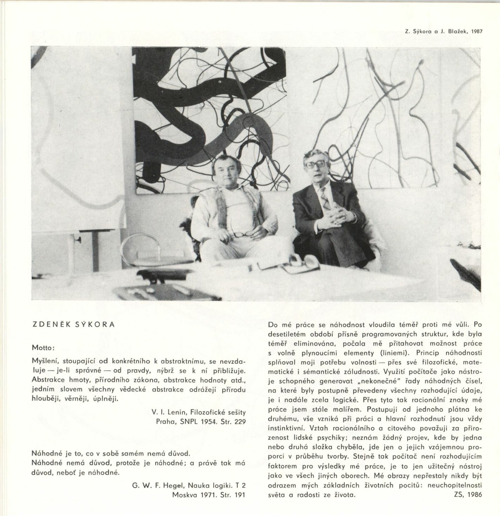 Zdeněk Sýkora: Dům umění města Brna, 22. 3. – 9. 5. 1988 / Text: Jiří Valoch. – Brno: DUmB, 1988. – [36] s., obr., seznam vystavených prací [2] s., životopis, výstavy, zastoupení ve sbírkách, bibliografie, DU 851. – MZK; MG; MMB