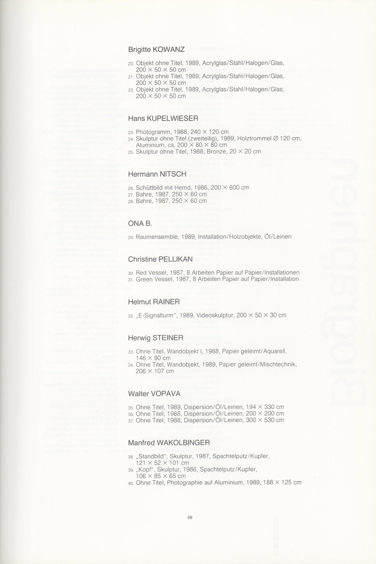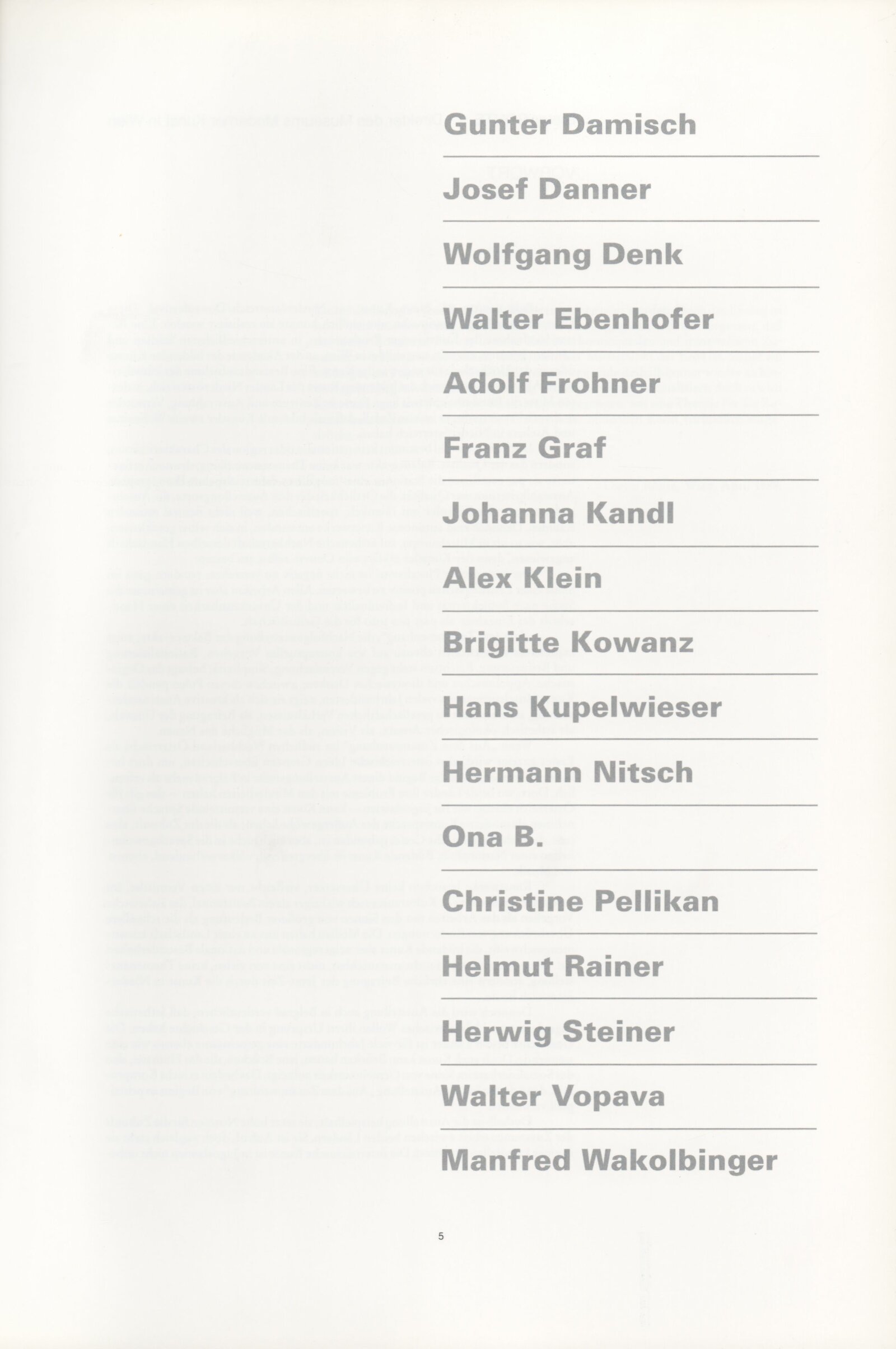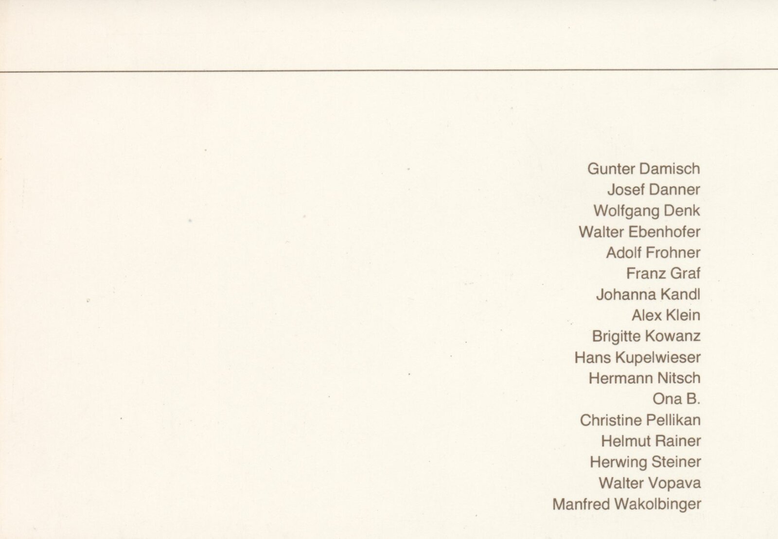 Gunter Damisch, Josef Danner, Wolfgang Denk, Walter Ebenhofer, Adolf Frohner, Franz Graf, Johanna Kandl, Alex Klein, Brigitte Kowanz, Hans Kupelwieser, Hermann Nitsch, Ona B., Christine Pellikan, Helmut Rainer, Herwing Steiner, Walter Vopava, Manfred Wakolbinger