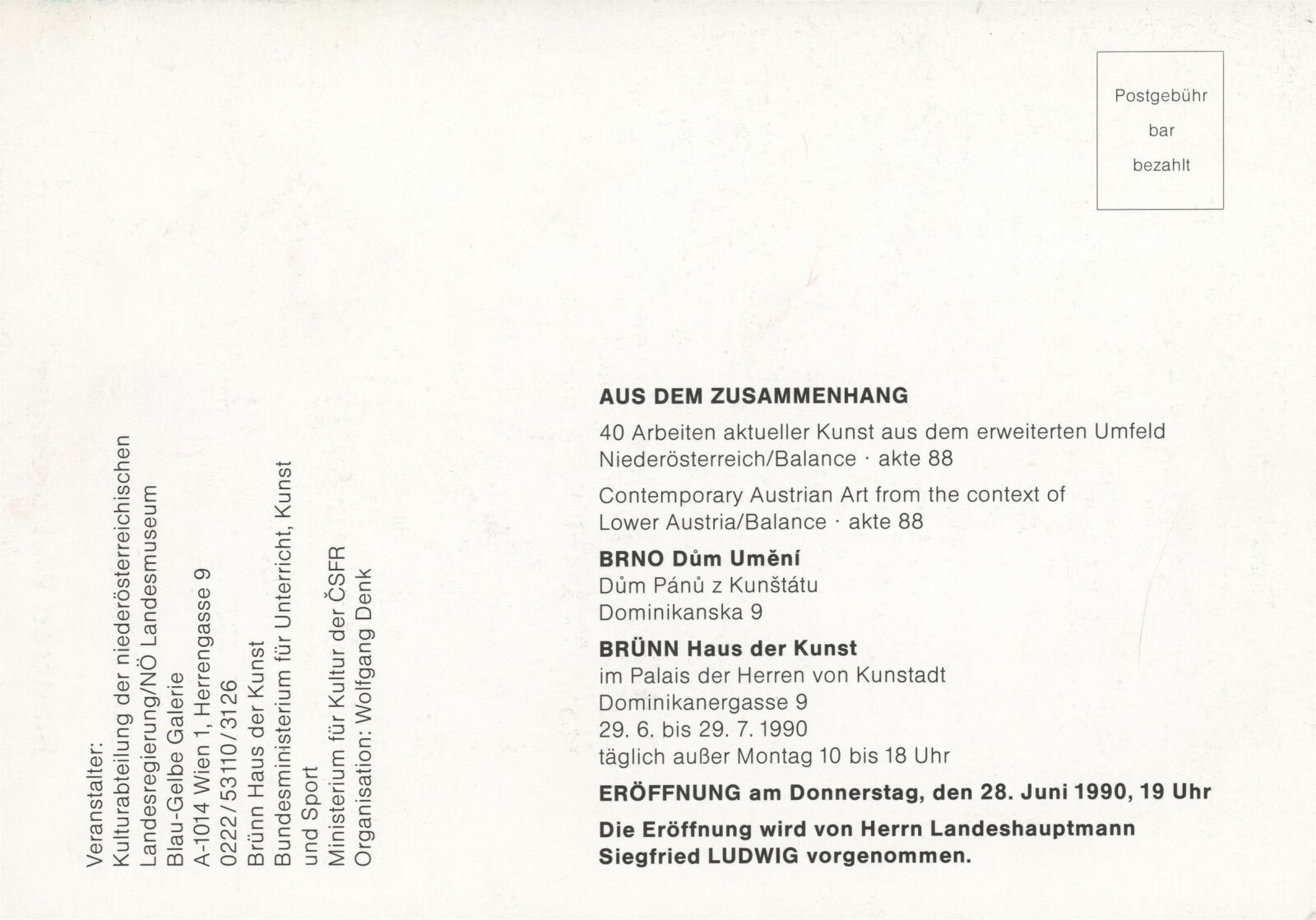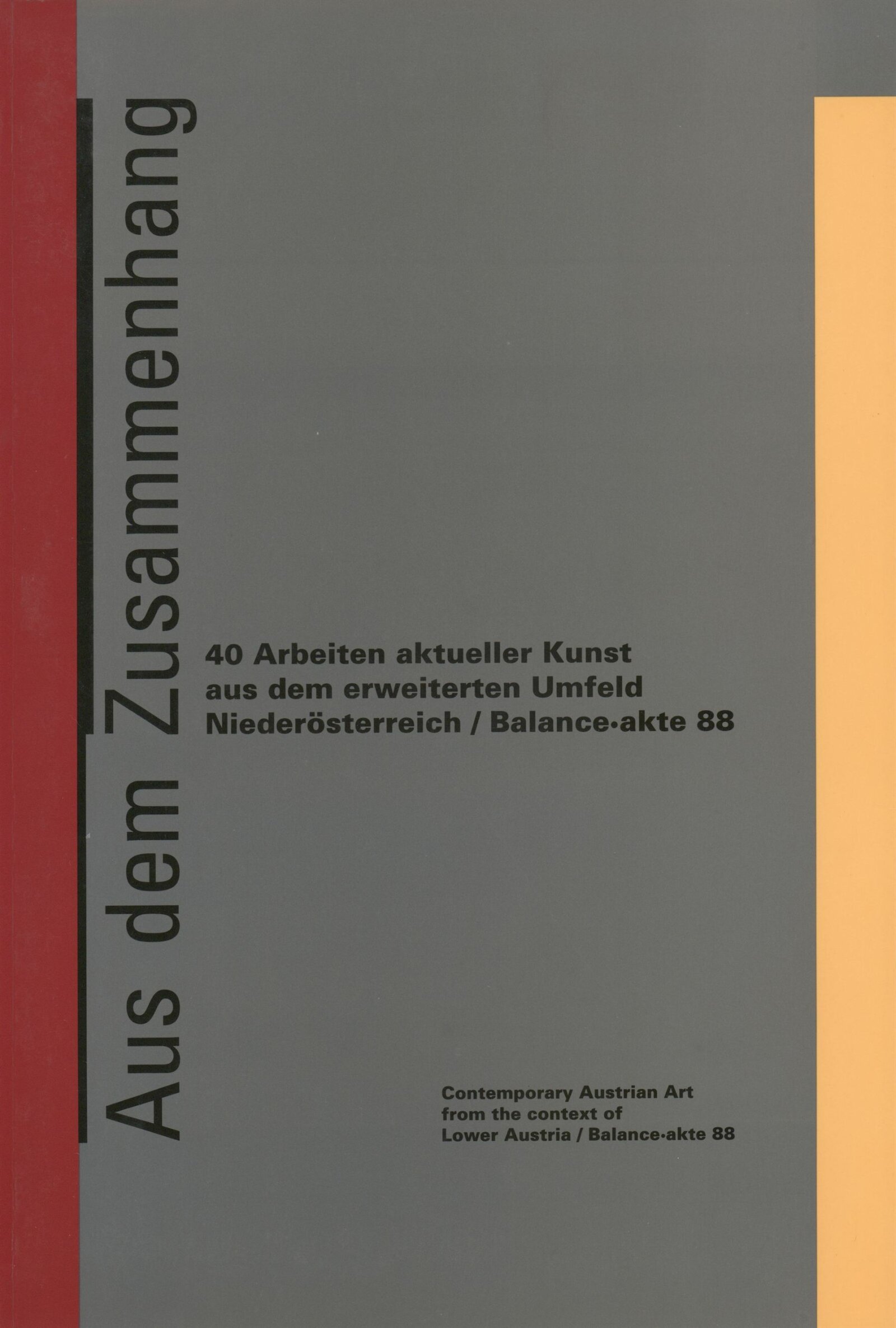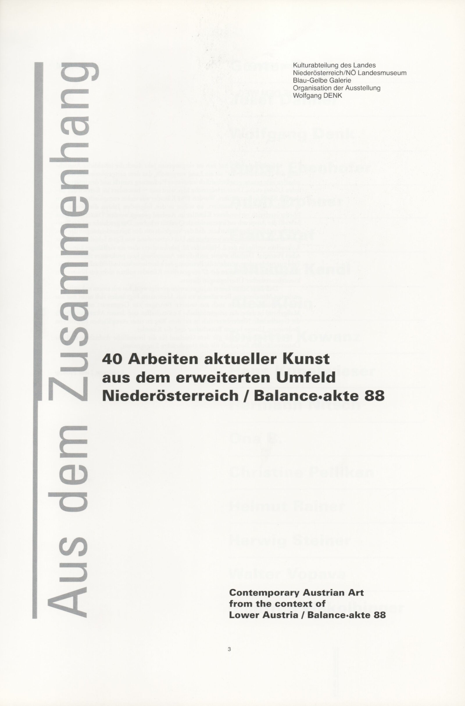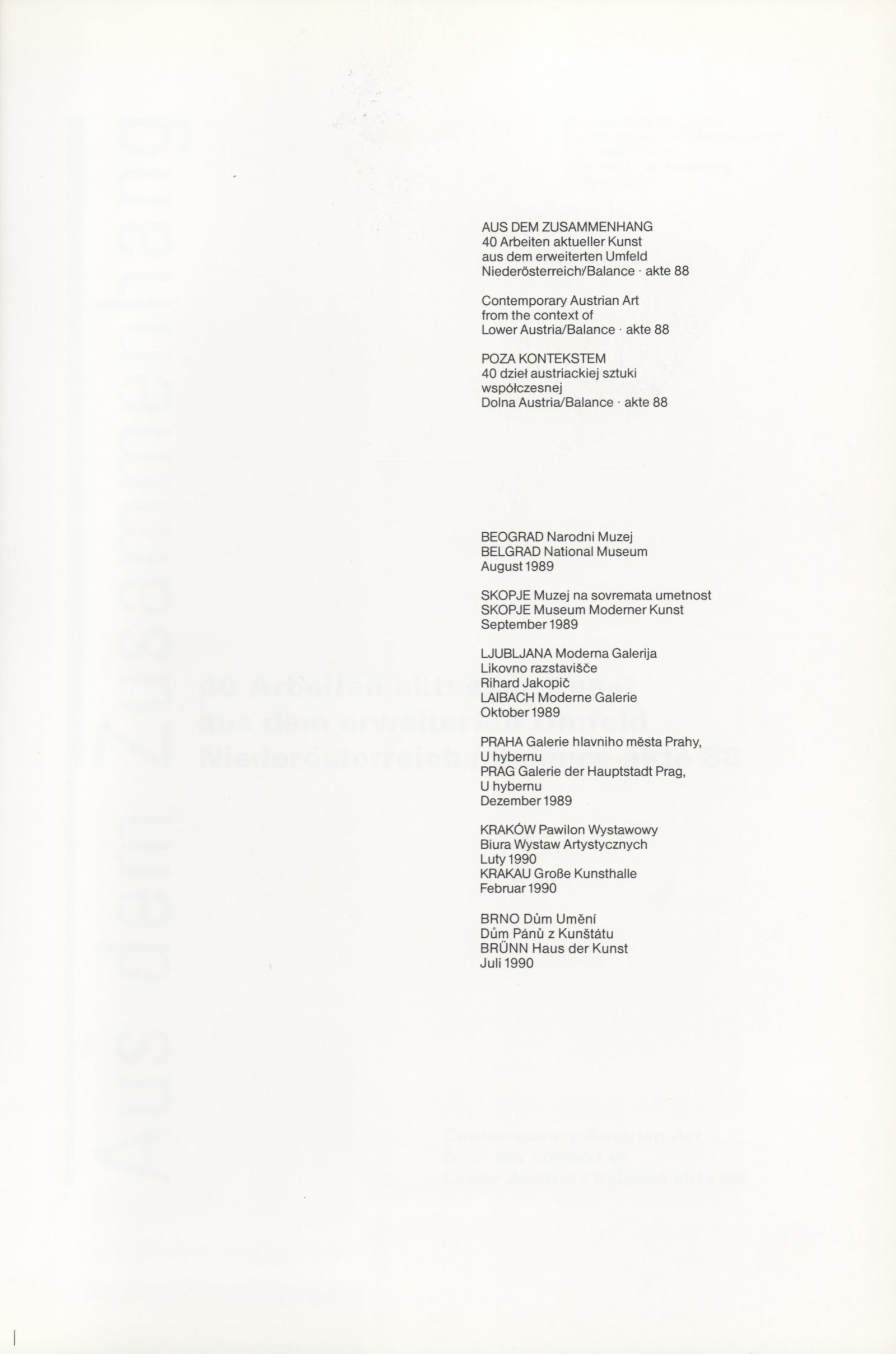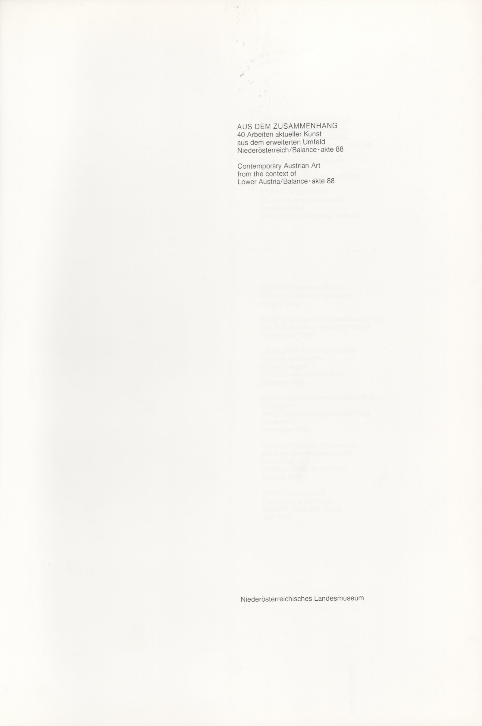 Ze souvislosti. Současné rakouské umění ze širší oblasti Dolního Rakouska: Dům umění města Brna / Dům pánů z Kunštátu, Kabinet grafiky, 1. patro, 28. 6. – 29. 7. 1990 / Společný katalog Aus dem Zusammenhang. 40 Arbeiten aktueller Kunst aus dem erweiterten Umfelt Niederösterreich Balance-akte 88. Texty Liese Prokop, Dieter Ronte, Wolfgang Denk, Peter Zawrel. – Wien, NO Landesregierung, 2.Aufl. – 80 s., obr., jako vložka český překlad textů [10] s., DPK 940. – MZK