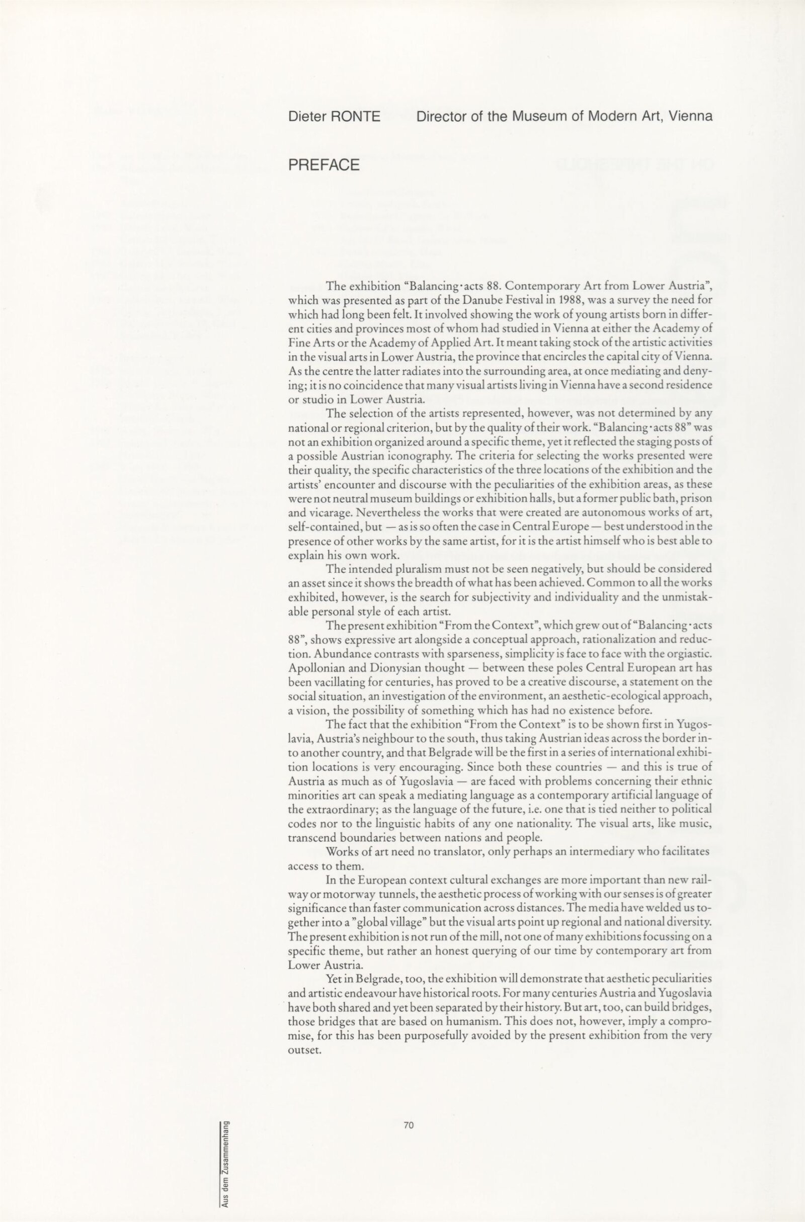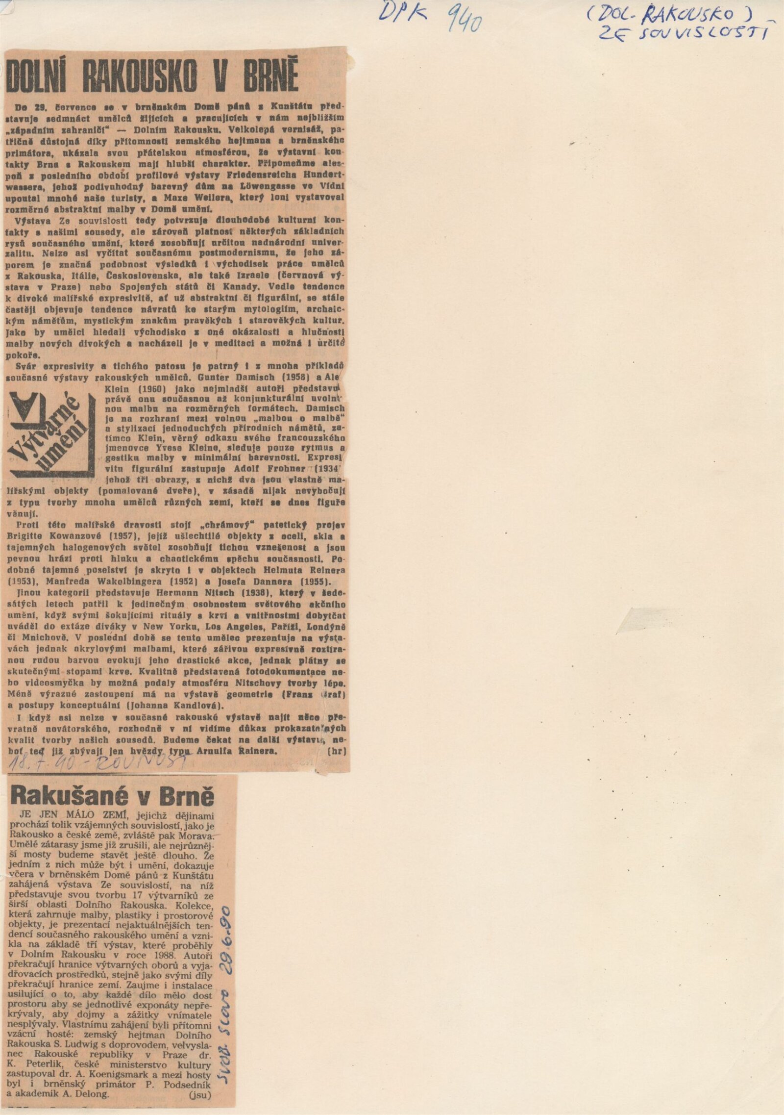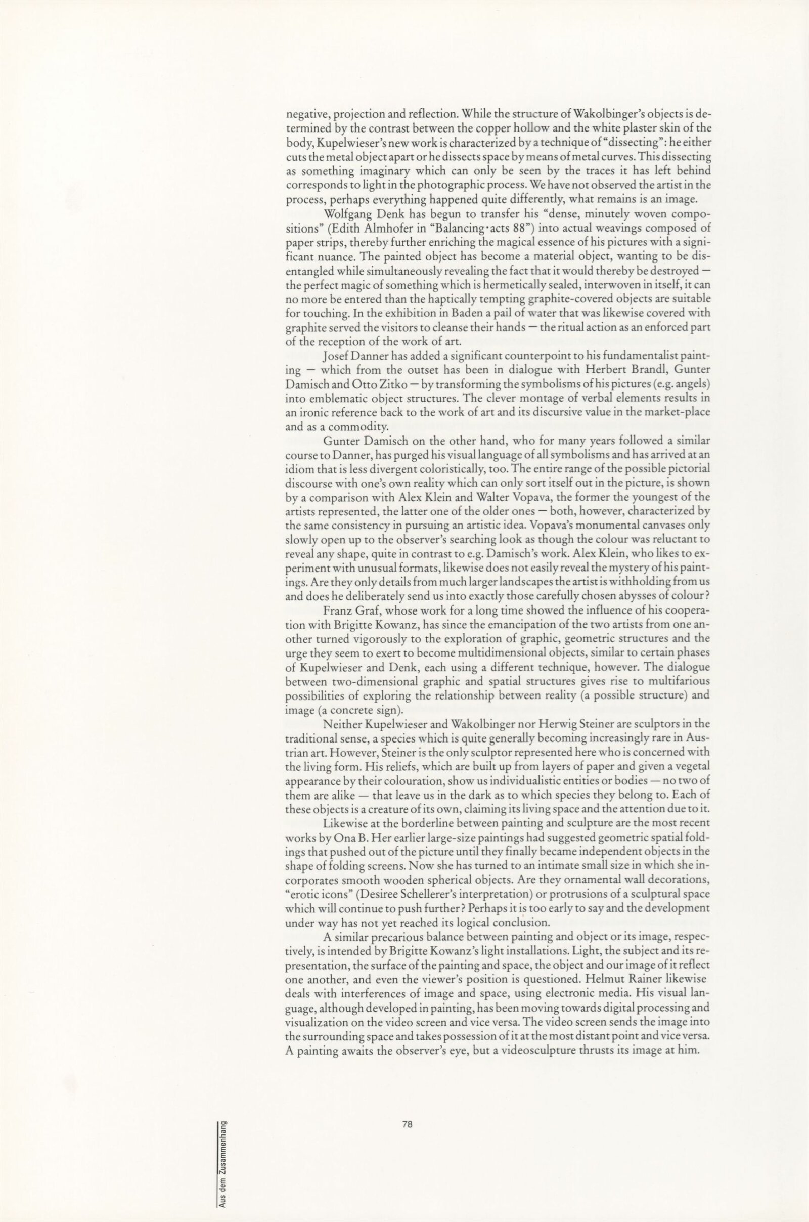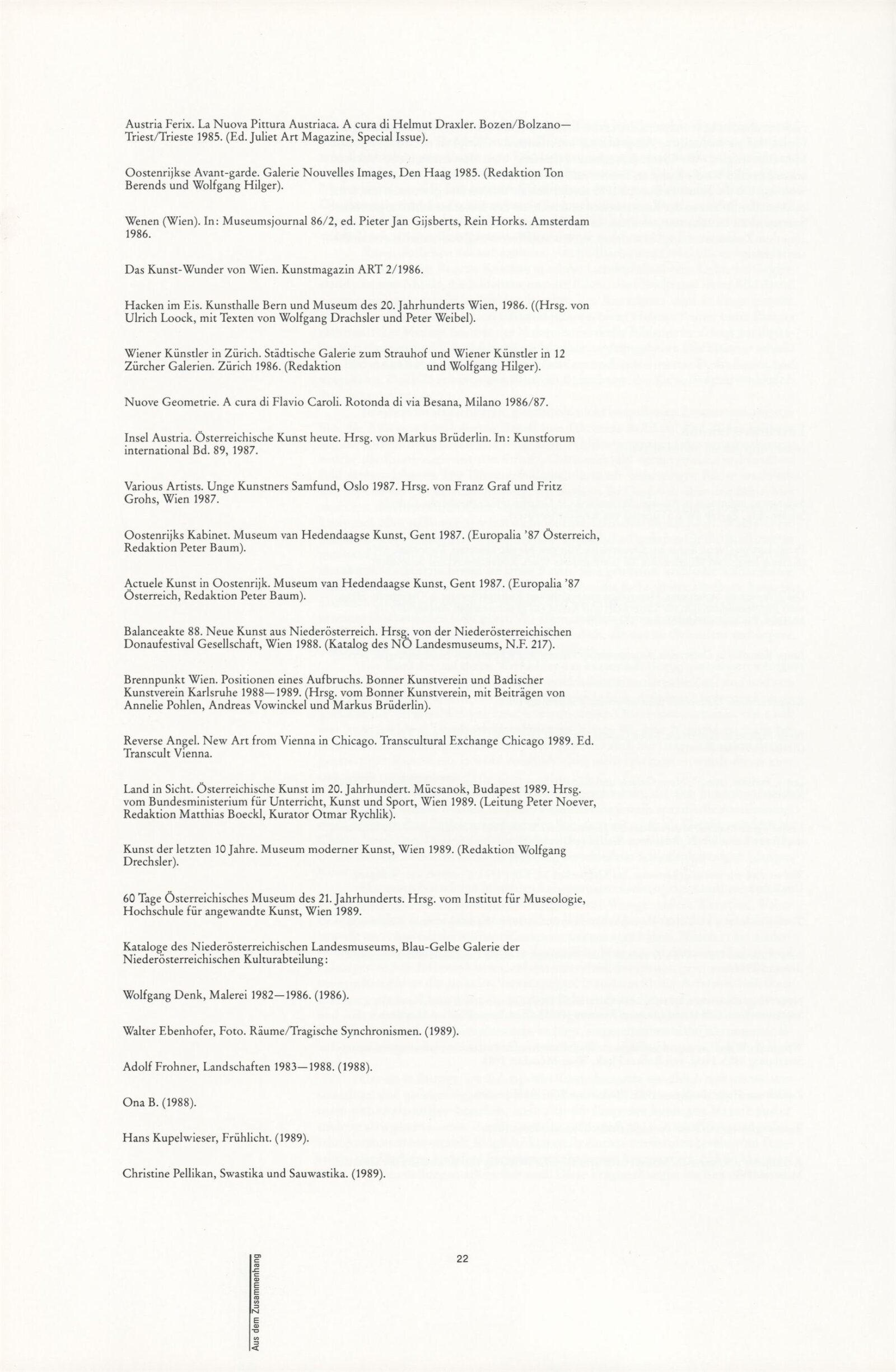 Ze souvislosti. Současné rakouské umění ze širší oblasti Dolního Rakouska: Dům umění města Brna / Dům pánů z Kunštátu, Kabinet grafiky, 1. patro, 28. 6. – 29. 7. 1990 / Společný katalog Aus dem Zusammenhang. 40 Arbeiten aktueller Kunst aus dem erweiterten Umfelt Niederösterreich Balance-akte 88. Texty Liese Prokop, Dieter Ronte, Wolfgang Denk, Peter Zawrel. – Wien, NO Landesregierung, 2.Aufl. – 80 s., obr., jako vložka český překlad textů [10] s., DPK 940. – MZK