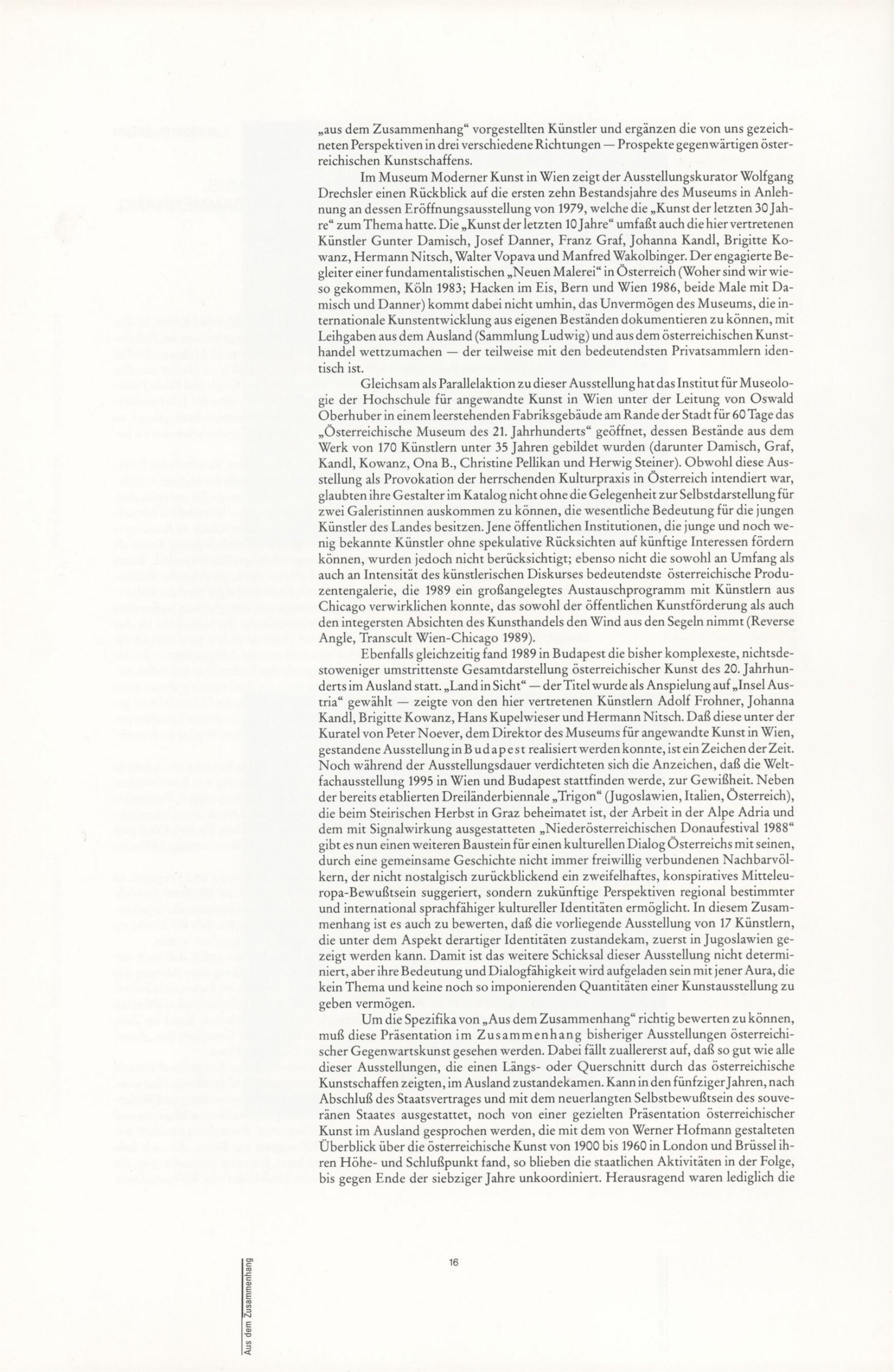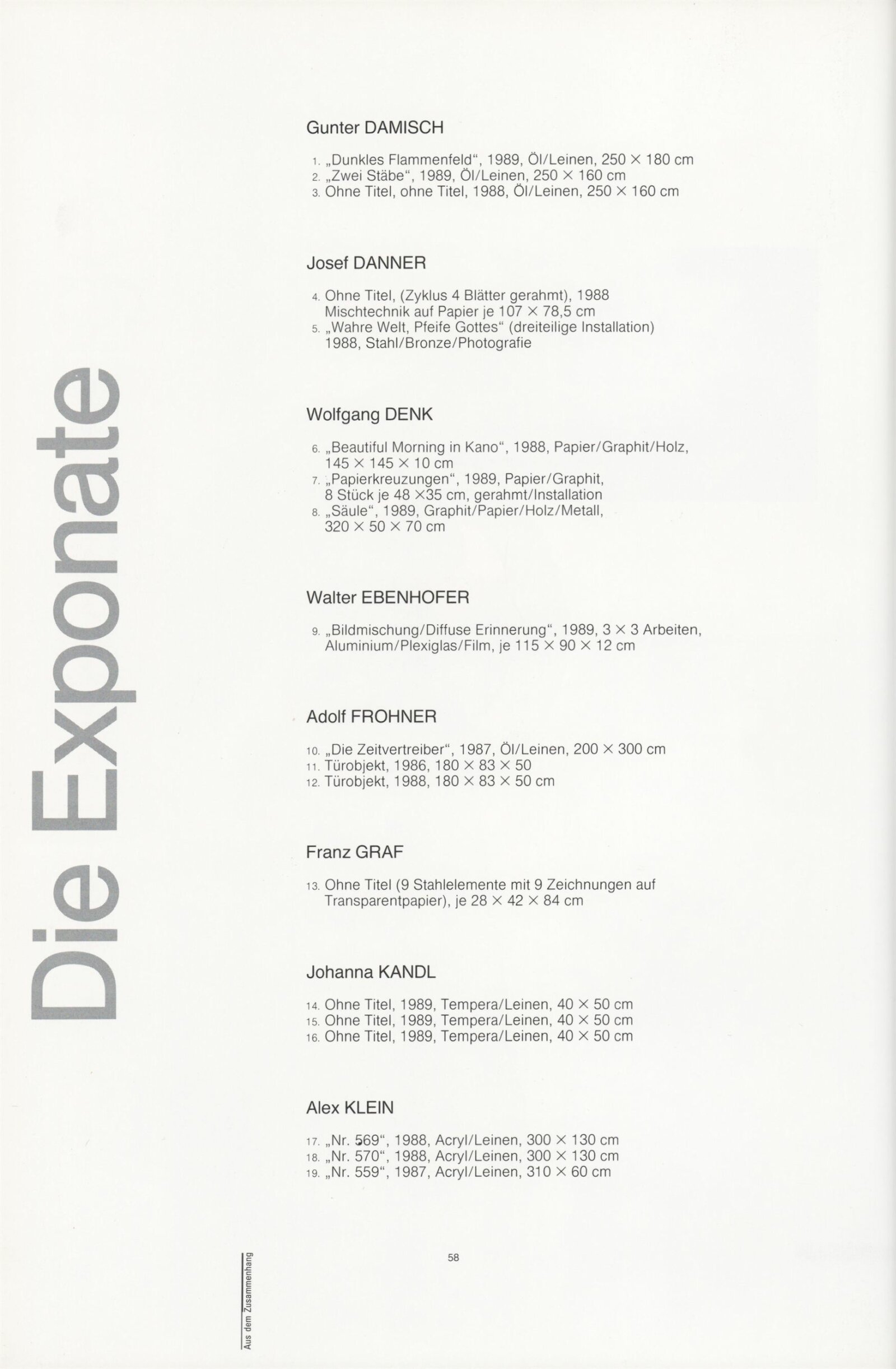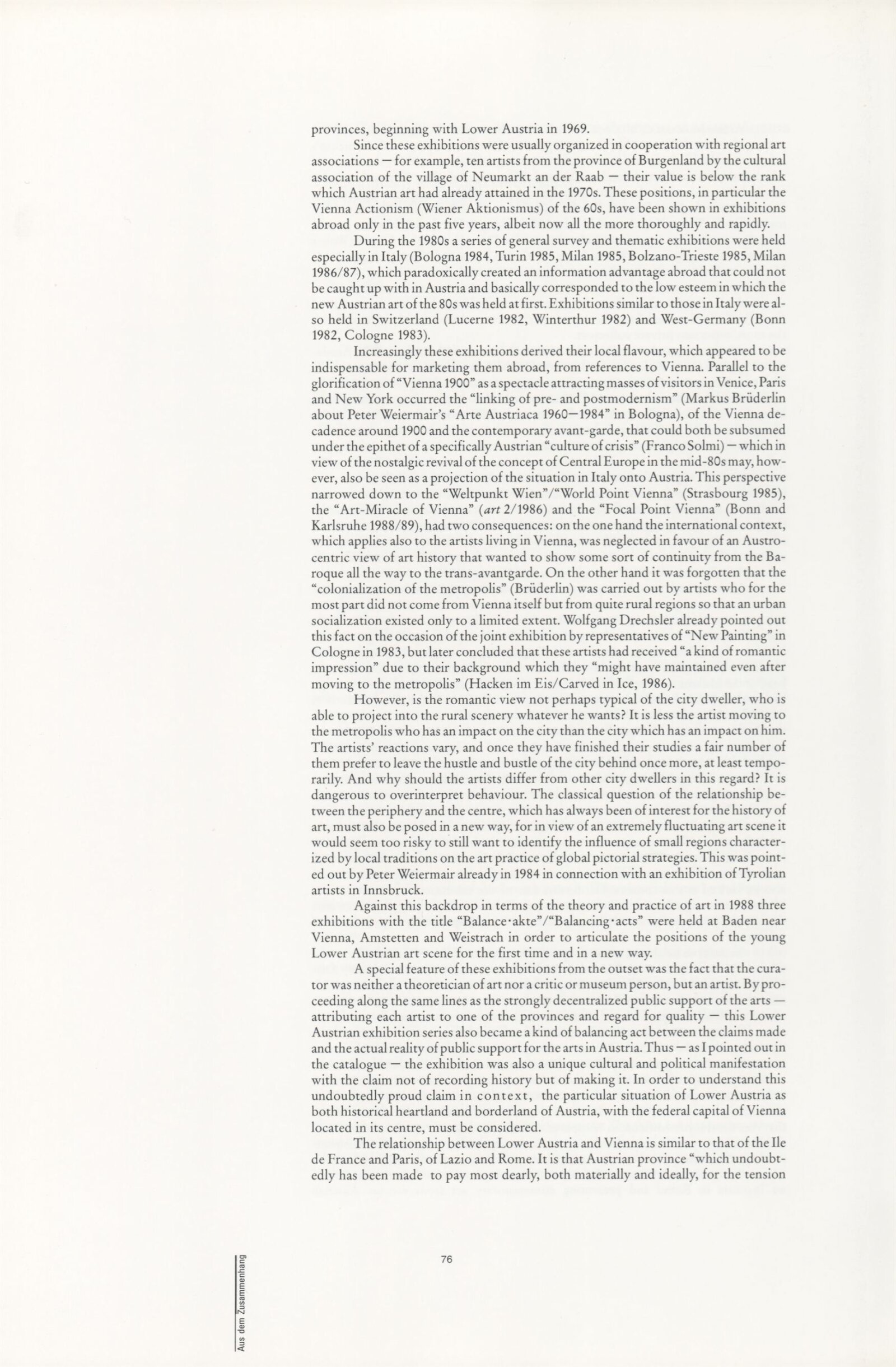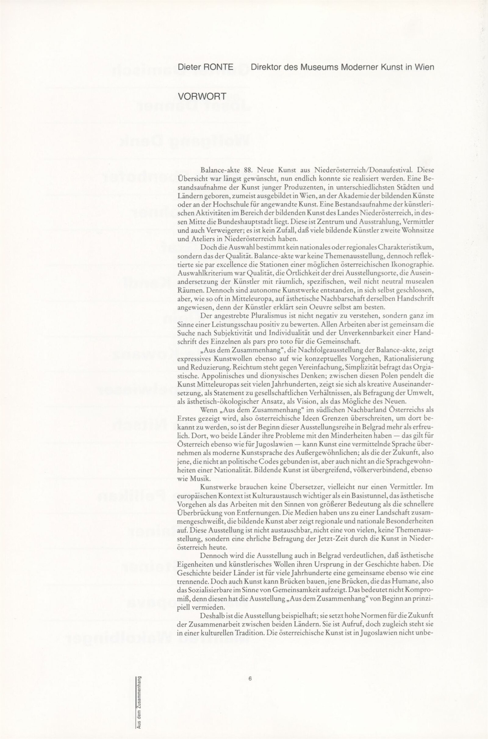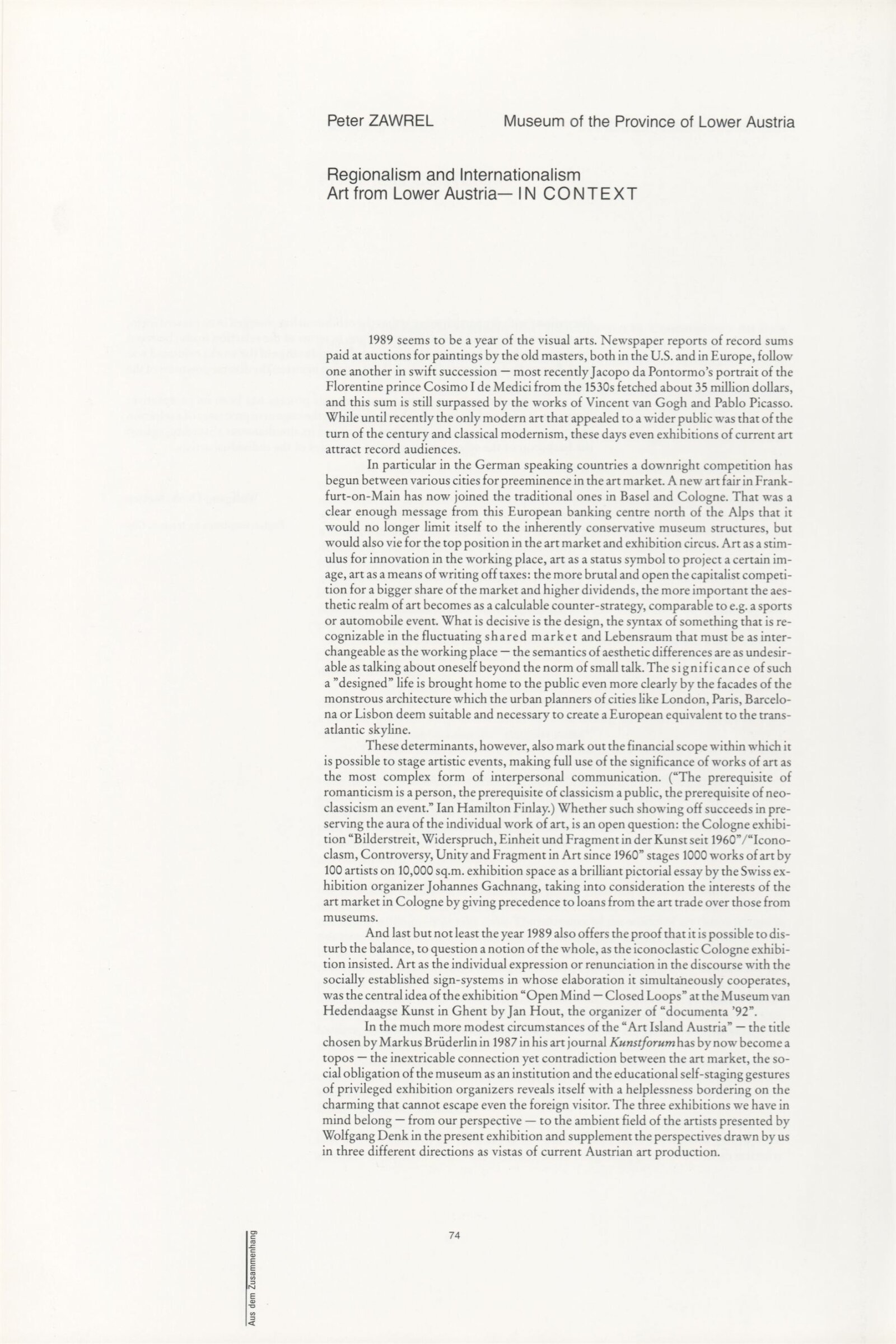 Ze souvislosti. Současné rakouské umění ze širší oblasti Dolního Rakouska: Dům umění města Brna / Dům pánů z Kunštátu, Kabinet grafiky, 1. patro, 28. 6. – 29. 7. 1990 / Společný katalog Aus dem Zusammenhang. 40 Arbeiten aktueller Kunst aus dem erweiterten Umfelt Niederösterreich Balance-akte 88. Texty Liese Prokop, Dieter Ronte, Wolfgang Denk, Peter Zawrel. – Wien, NO Landesregierung, 2.Aufl. – 80 s., obr., jako vložka český překlad textů [10] s., DPK 940. – MZK
