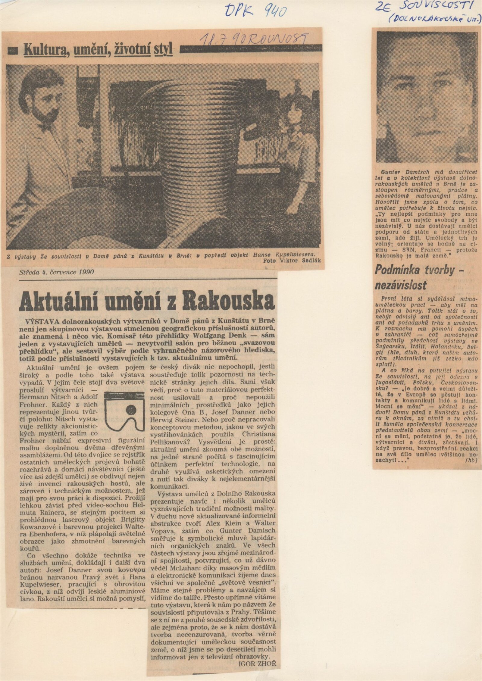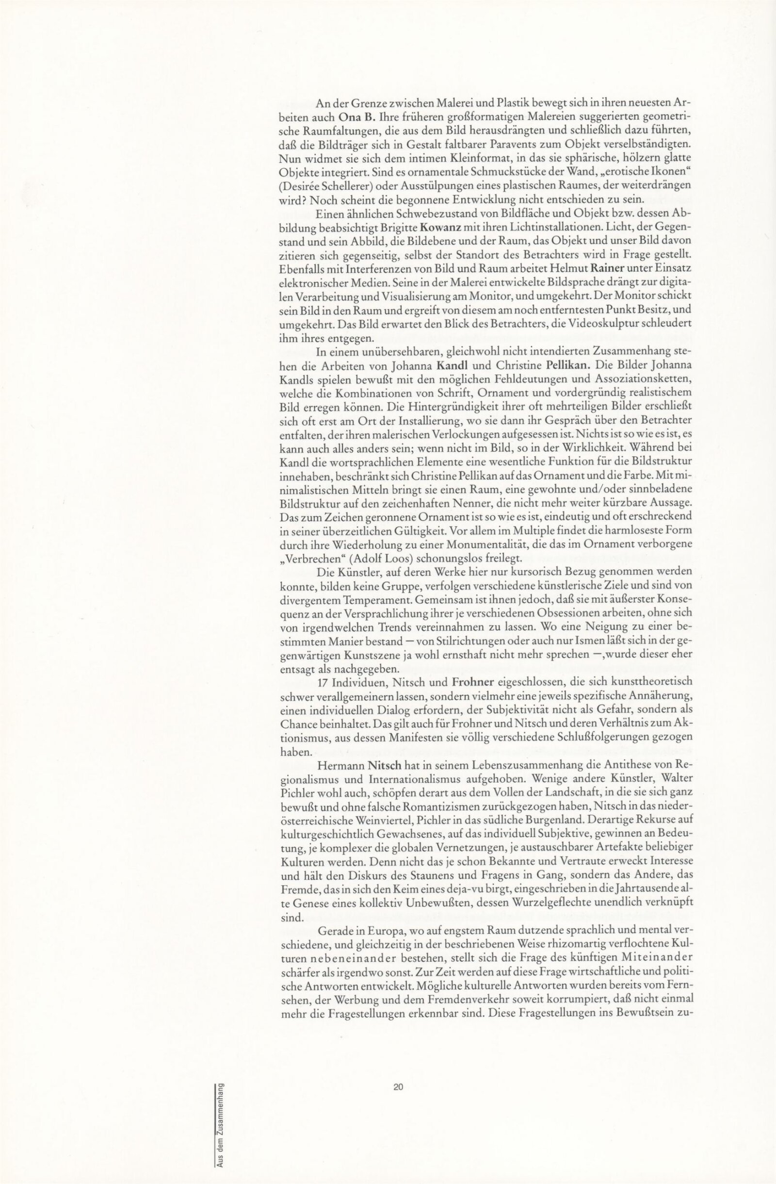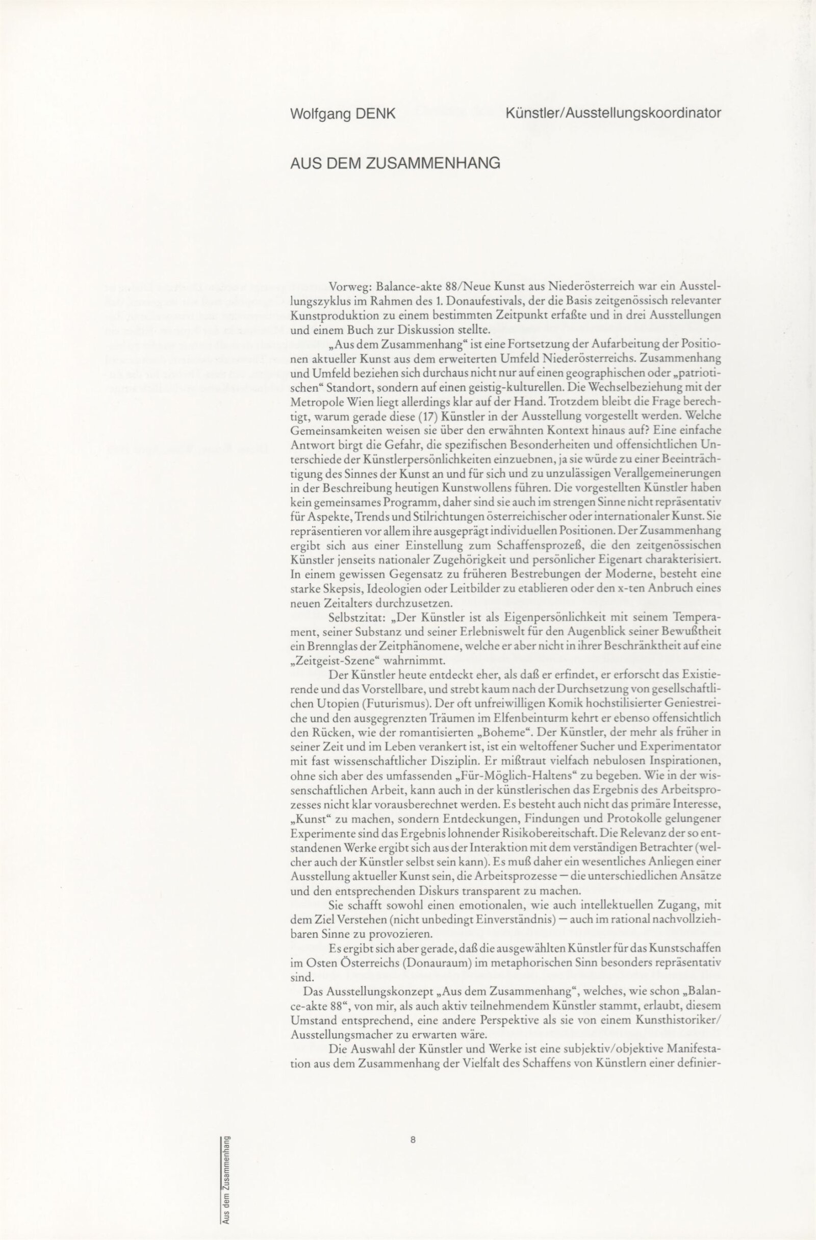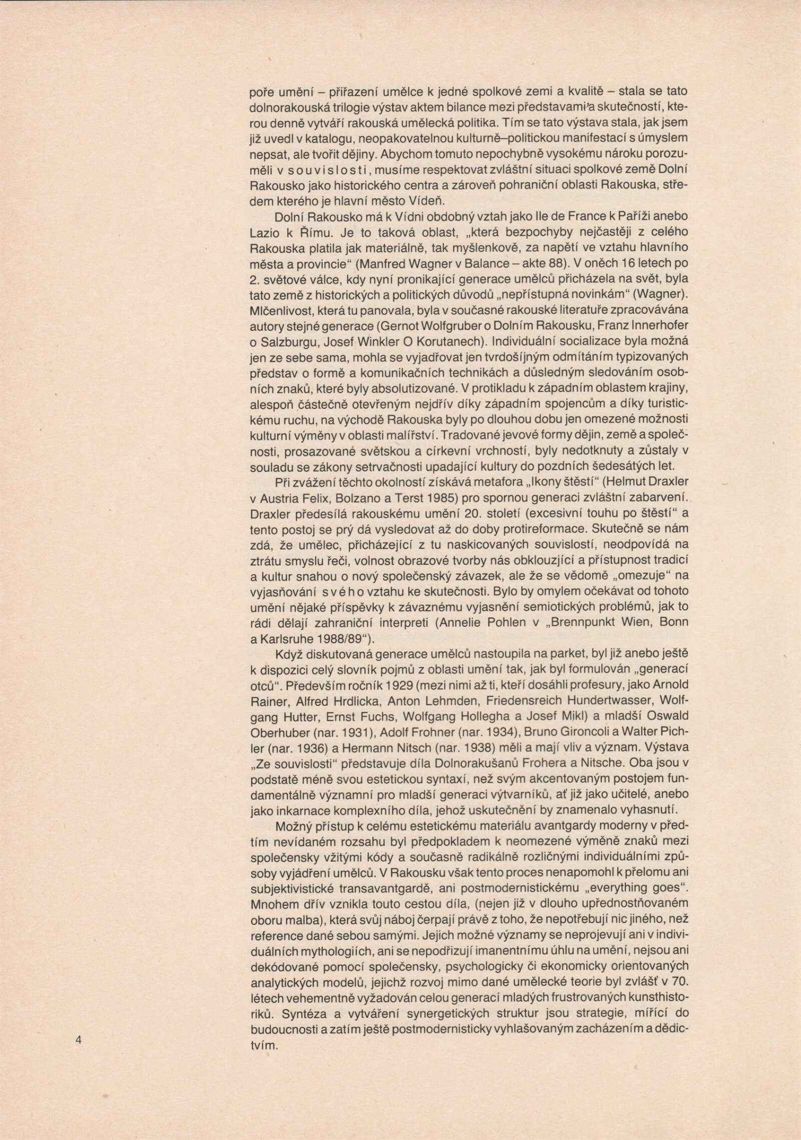 Ze souvislosti. Současné rakouské umění ze širší oblasti Dolního Rakouska: Dům umění města Brna / Dům pánů z Kunštátu, Kabinet grafiky, 1. patro, 28. 6. – 29. 7. 1990 / Společný katalog Aus dem Zusammenhang. 40 Arbeiten aktueller Kunst aus dem erweiterten Umfelt Niederösterreich Balance-akte 88. Texty Liese Prokop, Dieter Ronte, Wolfgang Denk, Peter Zawrel. – Wien, NO Landesregierung, 2.Aufl. – 80 s., obr., jako vložka český překlad textů [10] s., DPK 940. – MZK