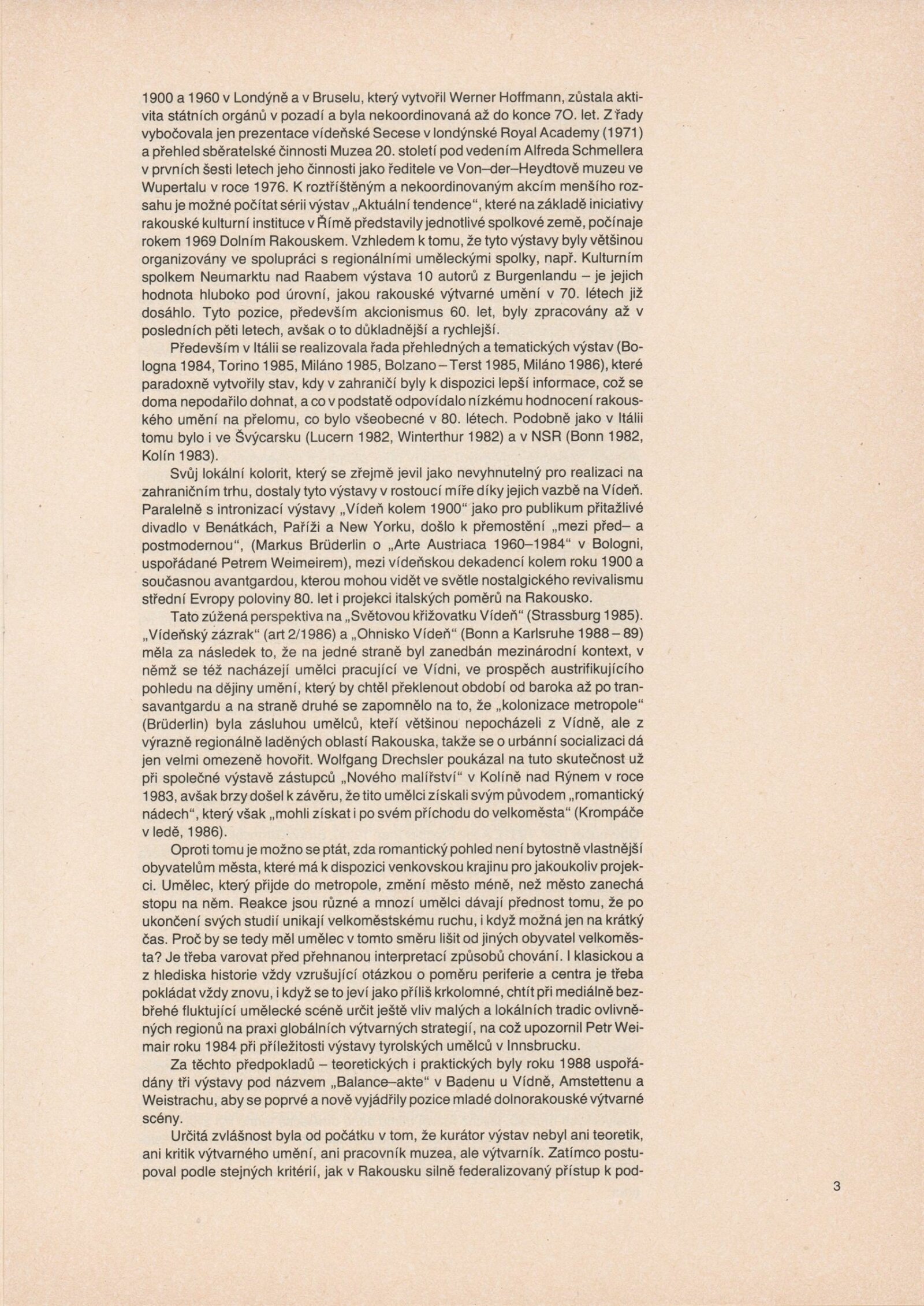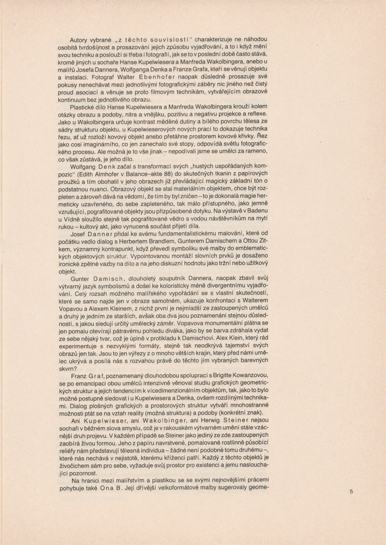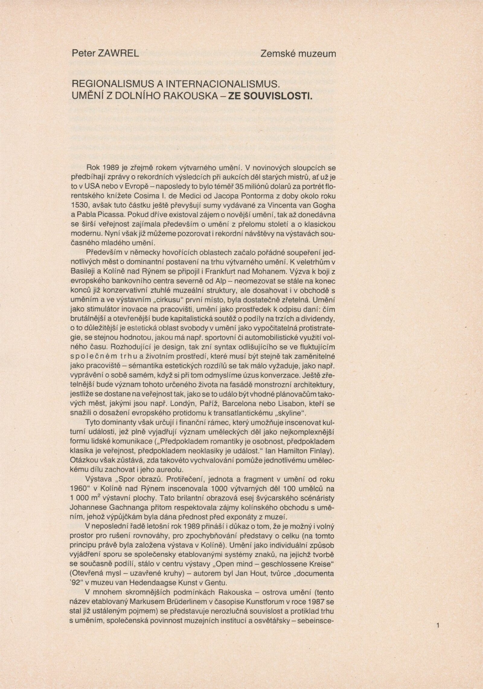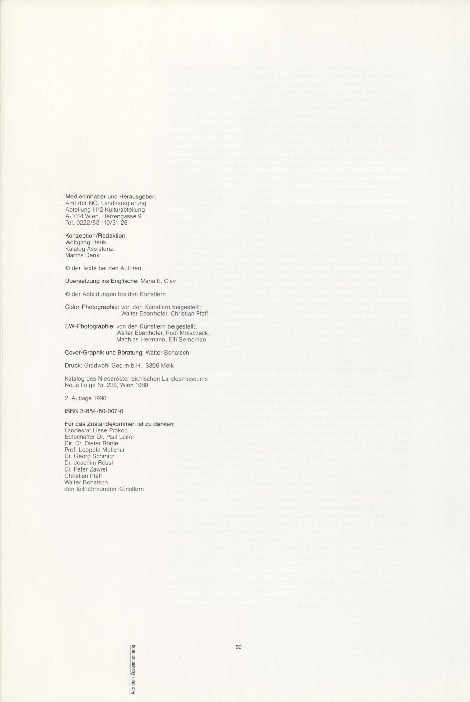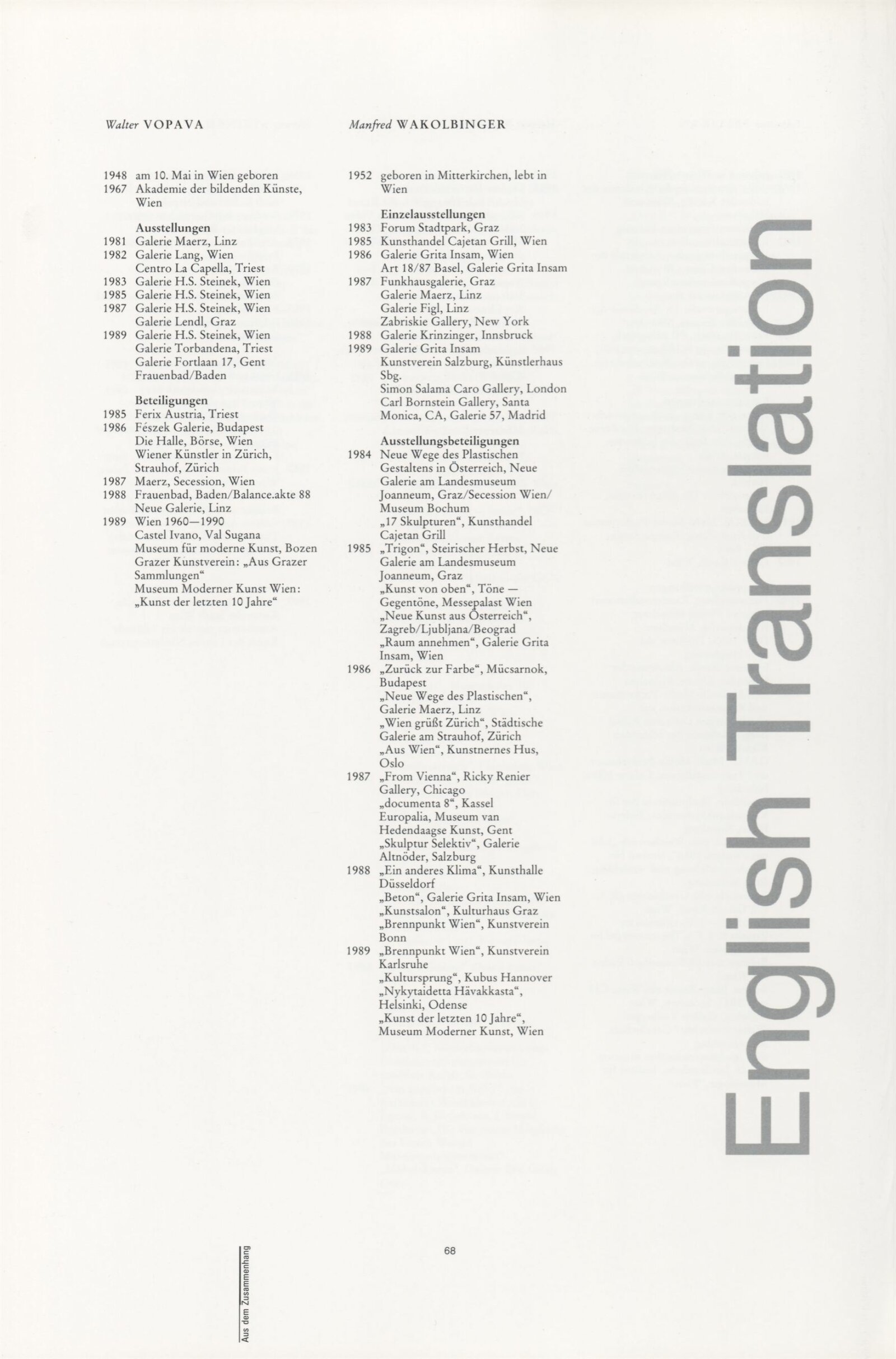 Ze souvislosti. Současné rakouské umění ze širší oblasti Dolního Rakouska: Dům umění města Brna / Dům pánů z Kunštátu, Kabinet grafiky, 1. patro, 28. 6. – 29. 7. 1990 / Společný katalog Aus dem Zusammenhang. 40 Arbeiten aktueller Kunst aus dem erweiterten Umfelt Niederösterreich Balance-akte 88. Texty Liese Prokop, Dieter Ronte, Wolfgang Denk, Peter Zawrel. – Wien, NO Landesregierung, 2.Aufl. – 80 s., obr., jako vložka český překlad textů [10] s., DPK 940. – MZK