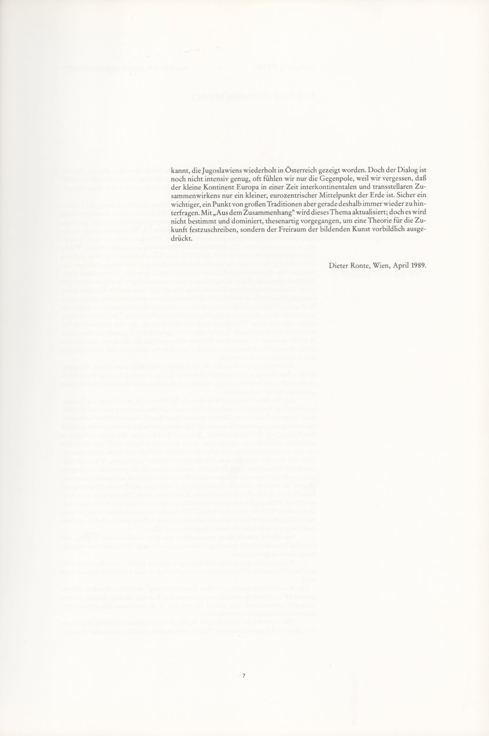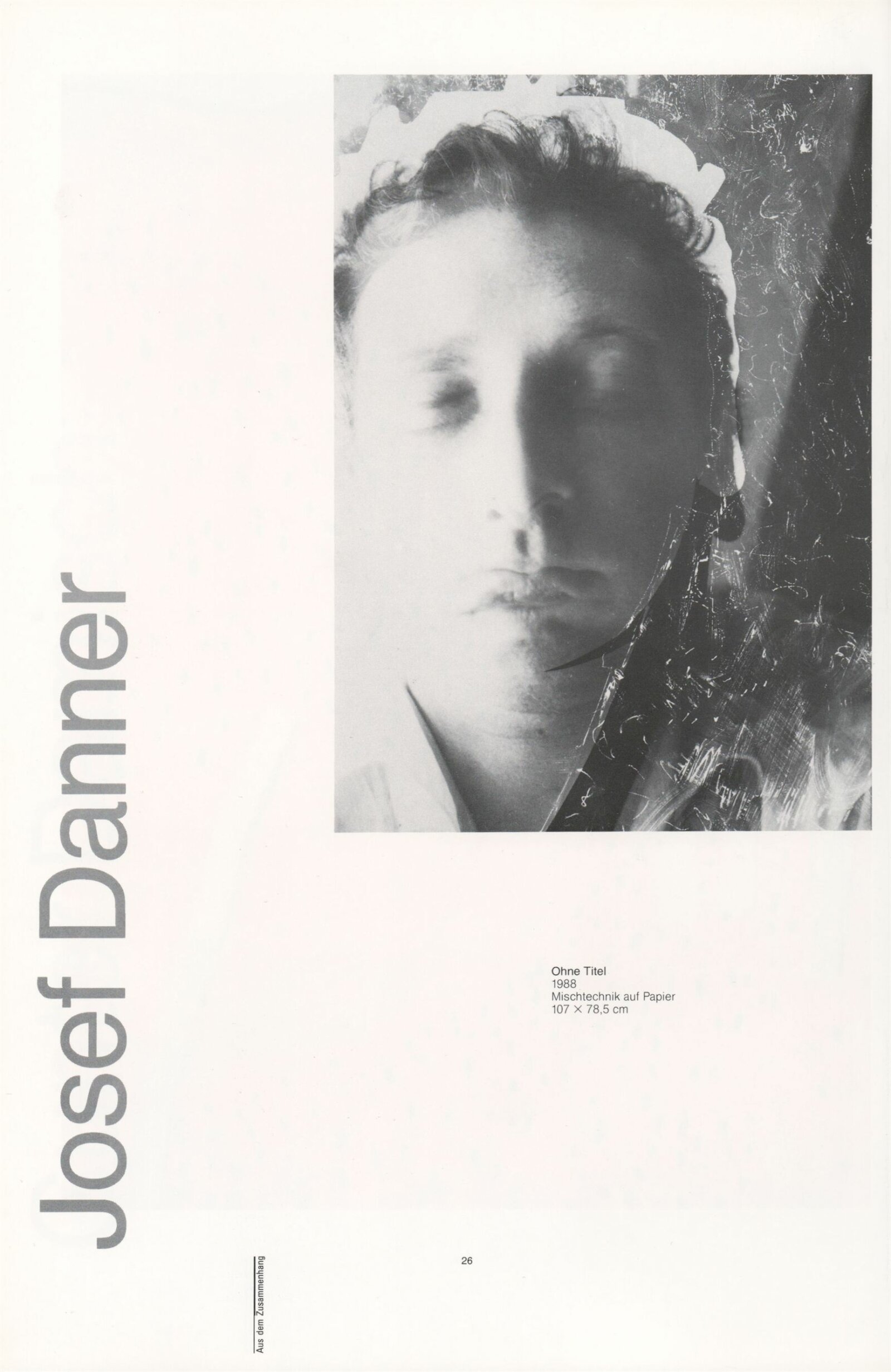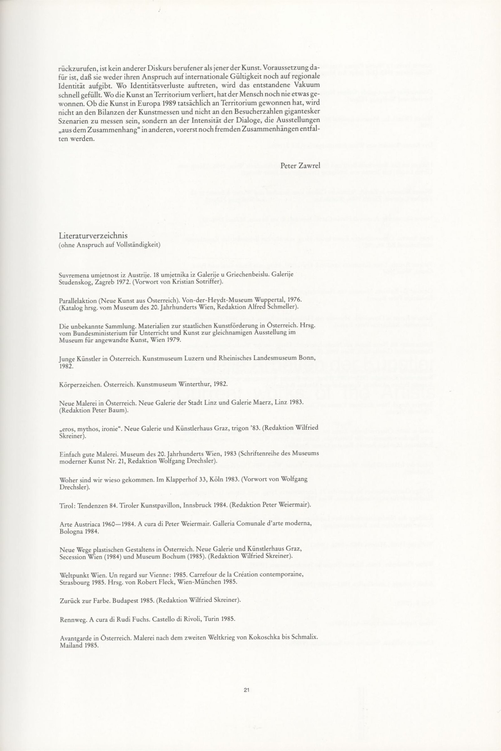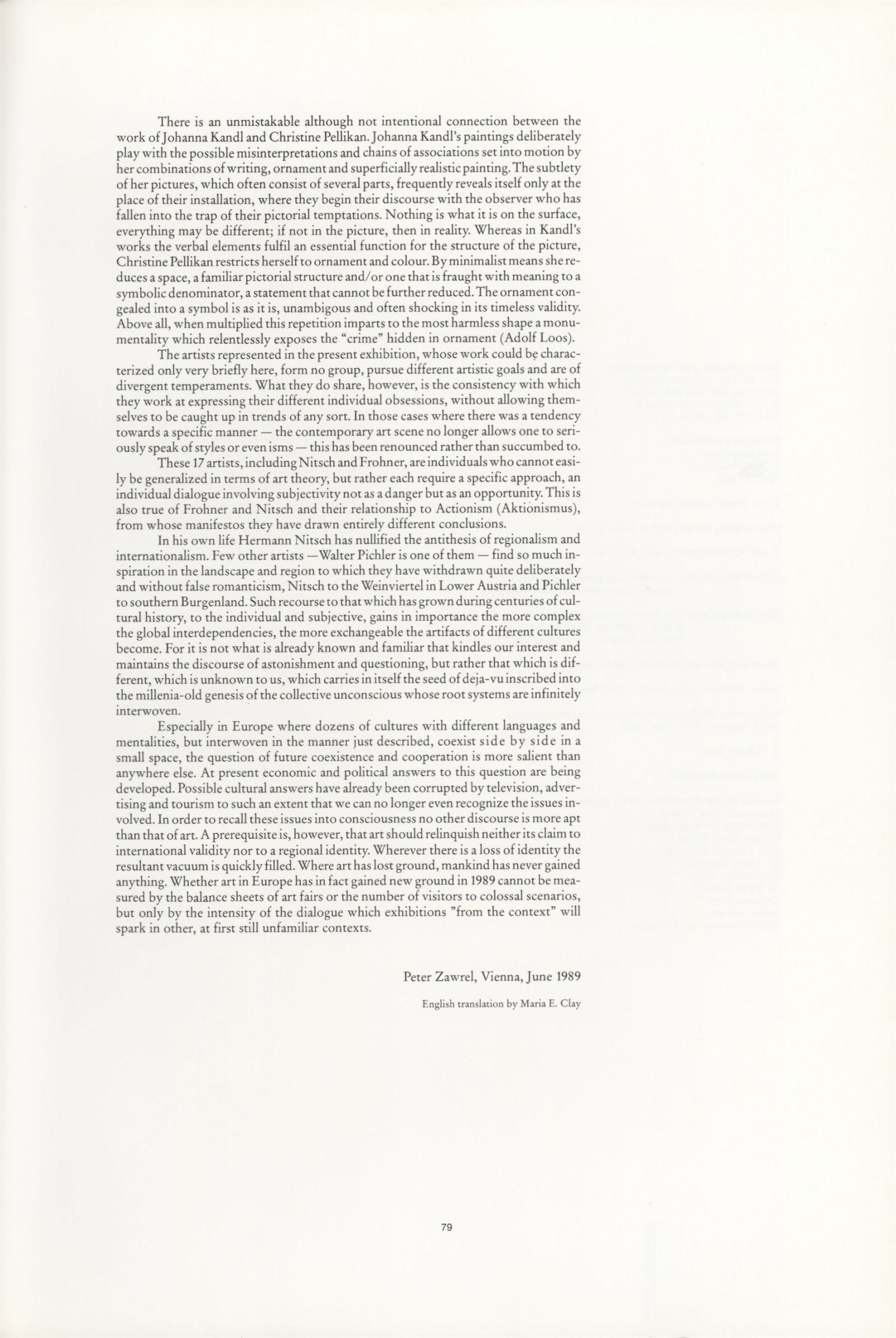 Ze souvislosti. Současné rakouské umění ze širší oblasti Dolního Rakouska: Dům umění města Brna / Dům pánů z Kunštátu, Kabinet grafiky, 1. patro, 28. 6. – 29. 7. 1990 / Společný katalog Aus dem Zusammenhang. 40 Arbeiten aktueller Kunst aus dem erweiterten Umfelt Niederösterreich Balance-akte 88. Texty Liese Prokop, Dieter Ronte, Wolfgang Denk, Peter Zawrel. – Wien, NO Landesregierung, 2.Aufl. – 80 s., obr., jako vložka český překlad textů [10] s., DPK 940. – MZK