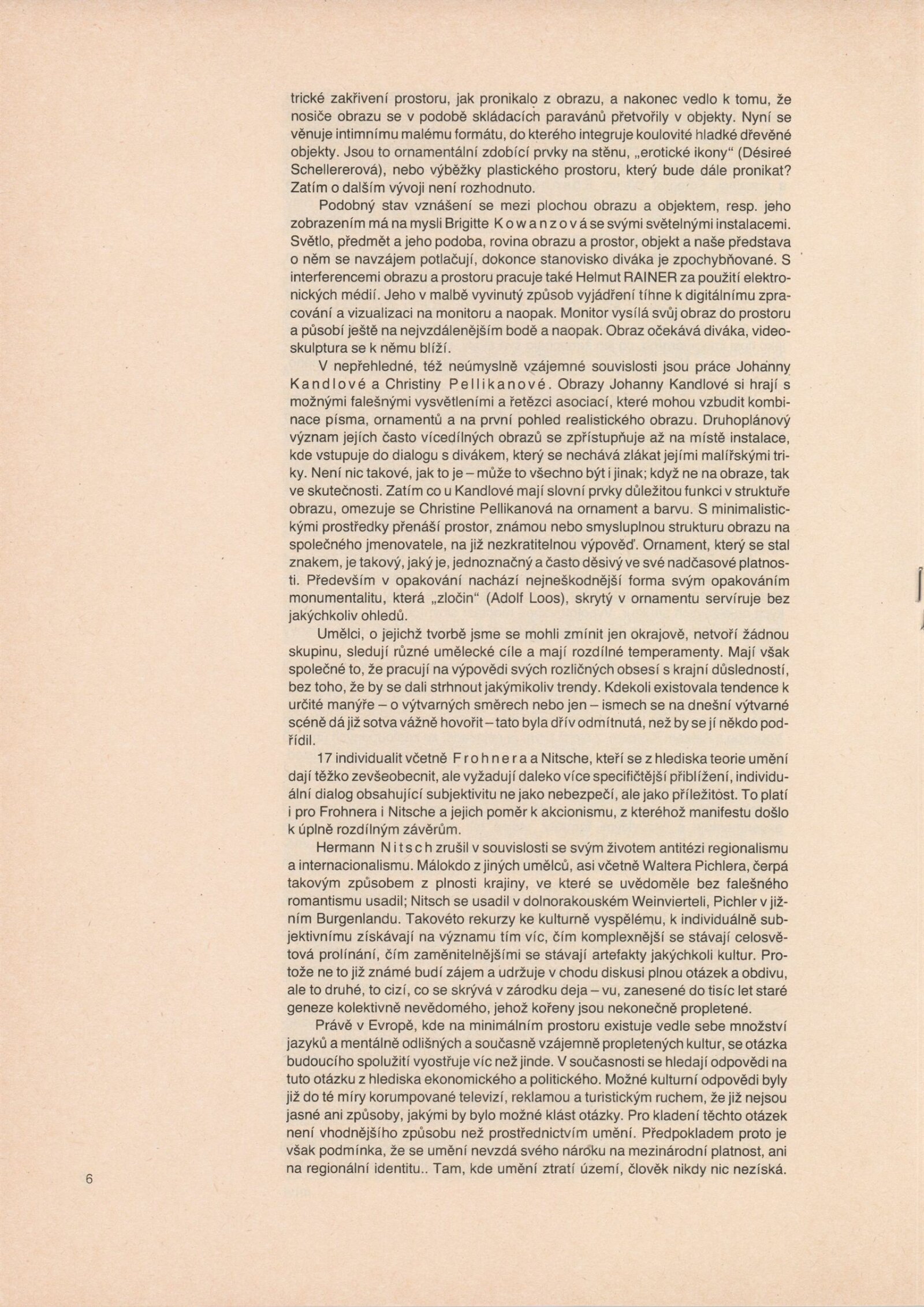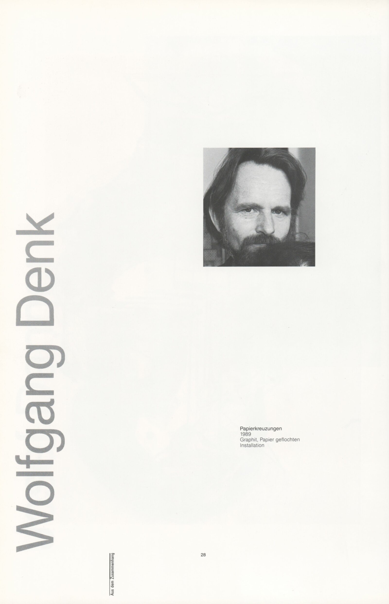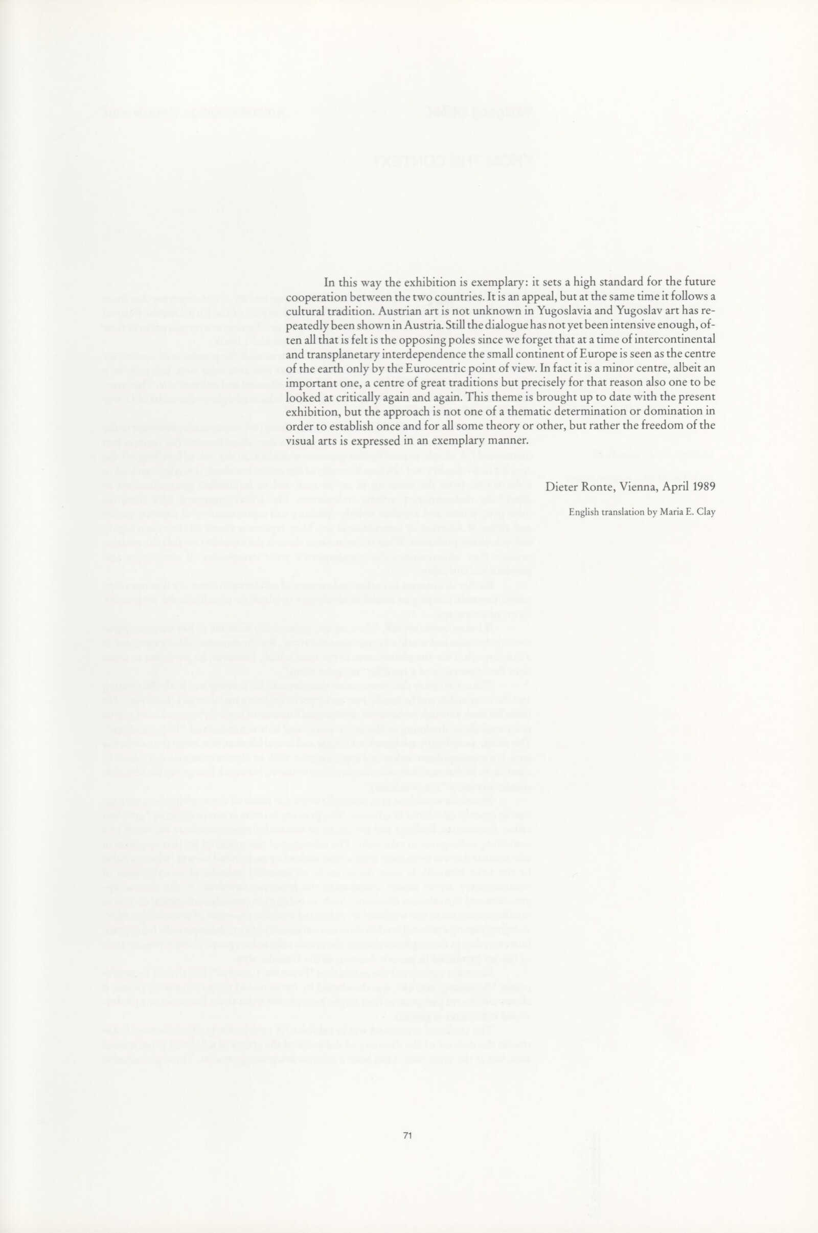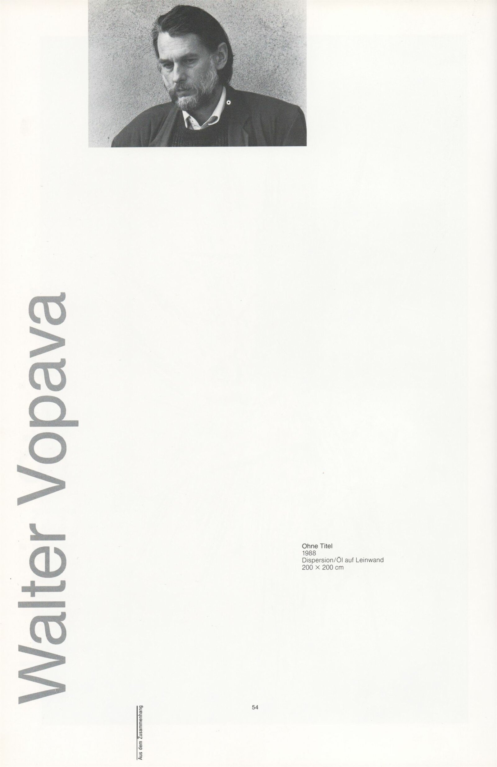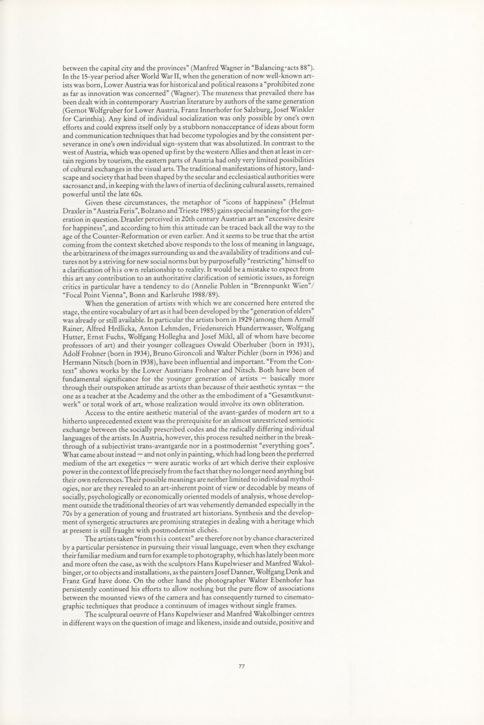 Ze souvislosti. Současné rakouské umění ze širší oblasti Dolního Rakouska: Dům umění města Brna / Dům pánů z Kunštátu, Kabinet grafiky, 1. patro, 28. 6. – 29. 7. 1990 / Společný katalog Aus dem Zusammenhang. 40 Arbeiten aktueller Kunst aus dem erweiterten Umfelt Niederösterreich Balance-akte 88. Texty Liese Prokop, Dieter Ronte, Wolfgang Denk, Peter Zawrel. – Wien, NO Landesregierung, 2.Aufl. – 80 s., obr., jako vložka český překlad textů [10] s., DPK 940. – MZK