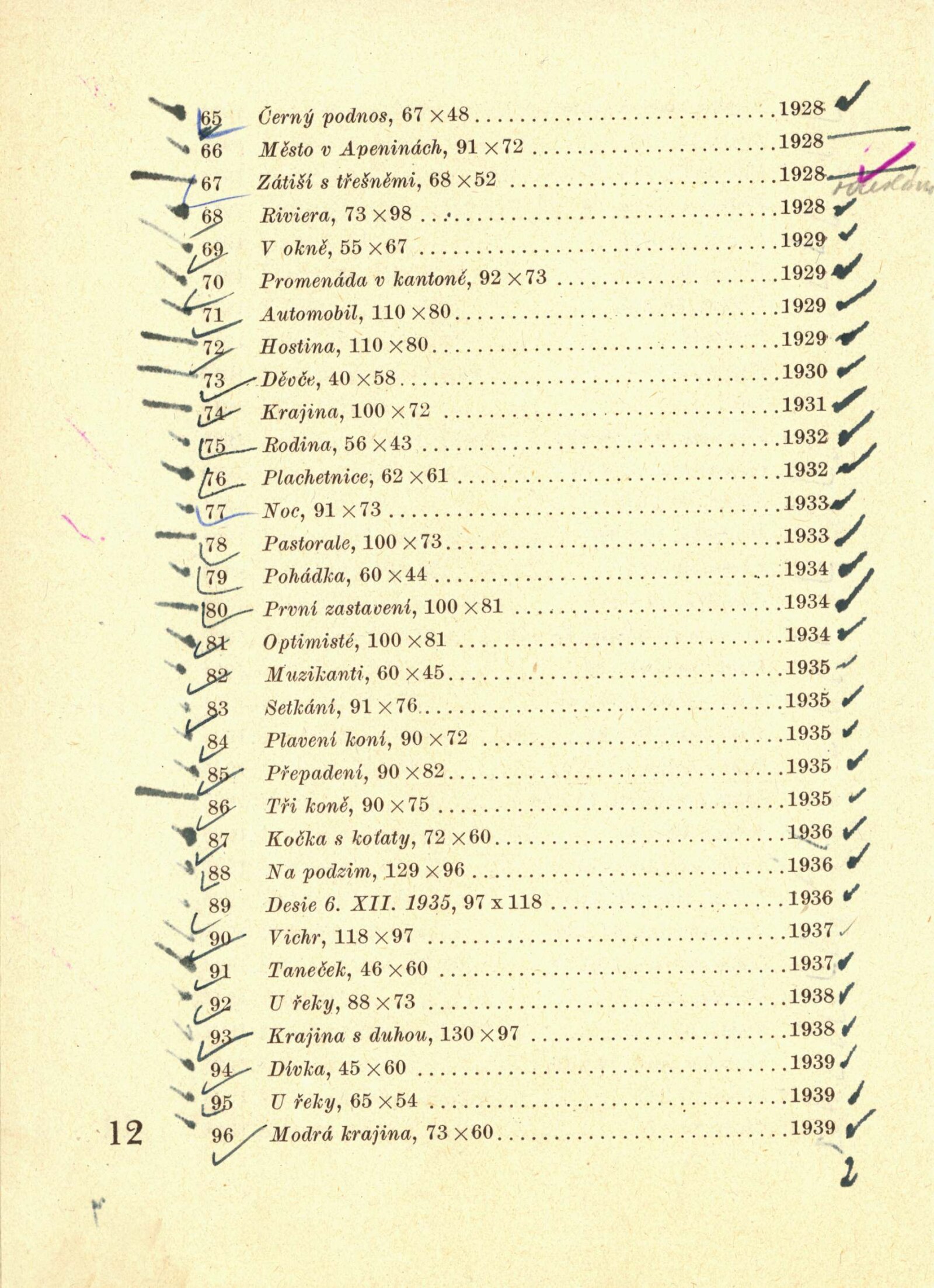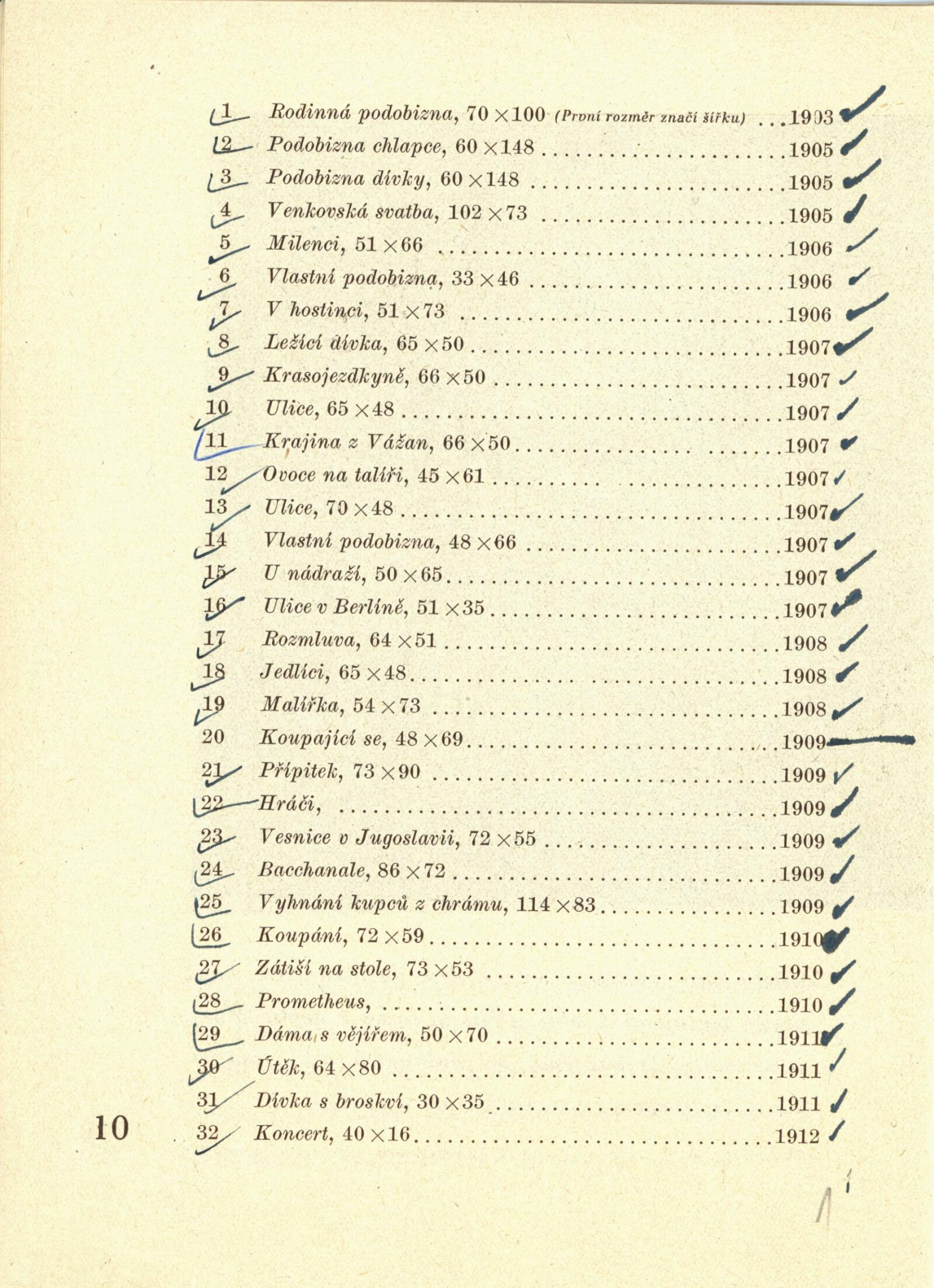 pozvánka, katalog se soupisem děl, anotace, osobní pozvání na zahájení výstavy a odpovědi, korespondence (s majiteli obrazů, děkovný dopis Linky Procházkové), dokumenty o pojištění, seznam majitelů zapůjčených děl, recenze v tisku