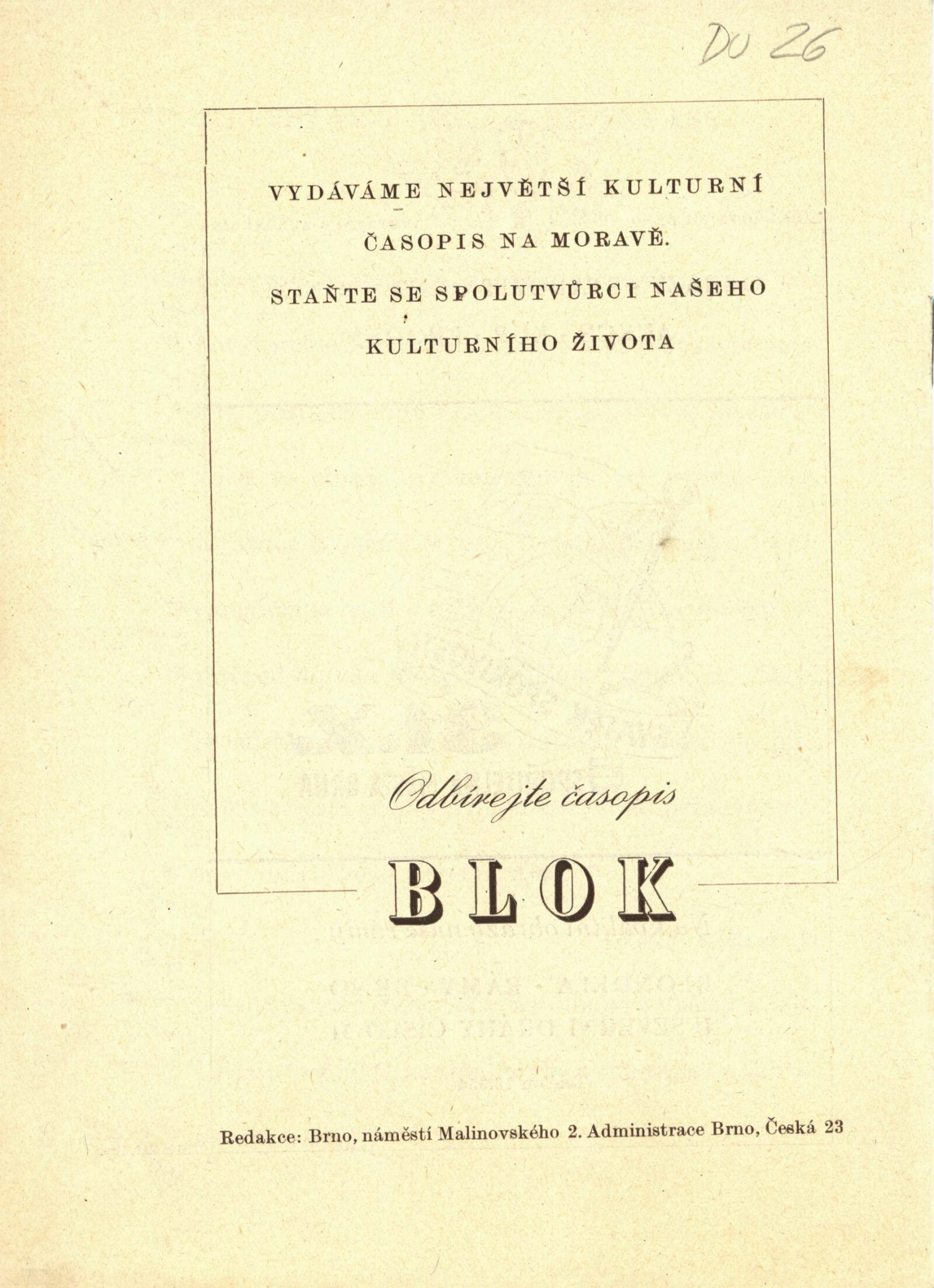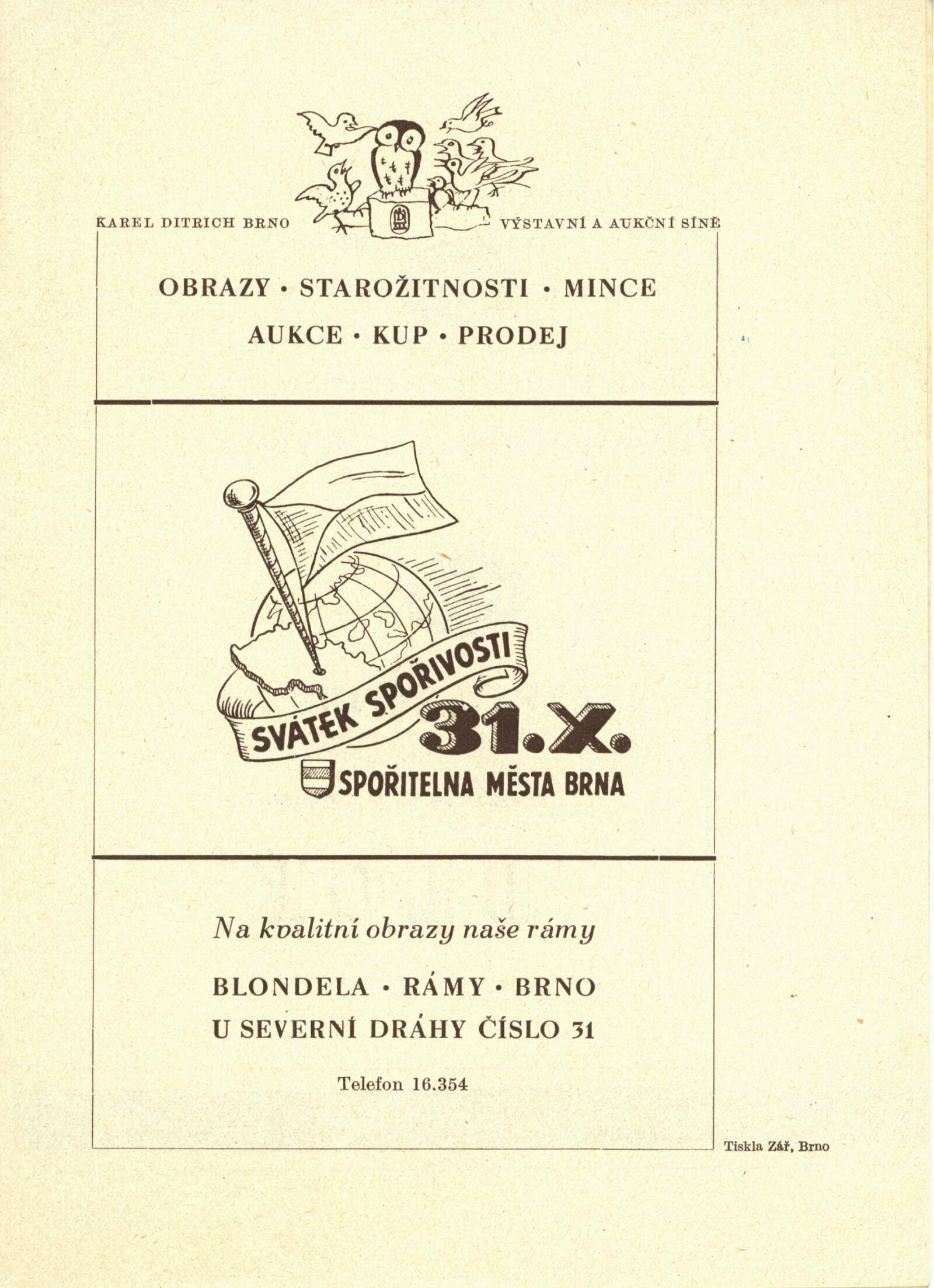 Katalog výstav v Domě umění, pořádaných 1. 11. – 24. 11. 1946 / Obsahuje výstavy: Životní dílo národního umělce Antonína Procházky. XXV. výstava, Britská invase. XXVI. výstava. – Text: Albert Kutal. – Brno: Osvětová rada zem. hlav. města Brna, 1946. – 14 s., DU 25–26. – Kubíček 7934; MZK; MG