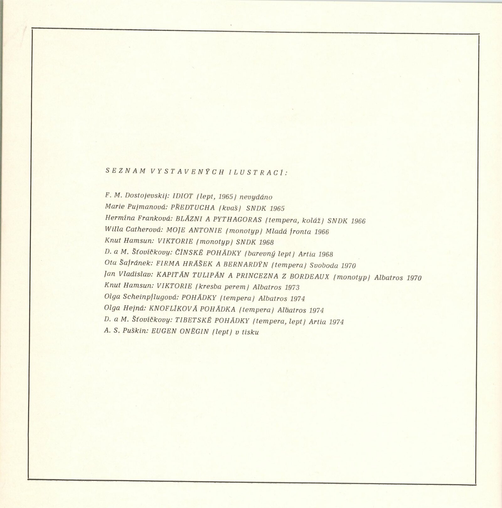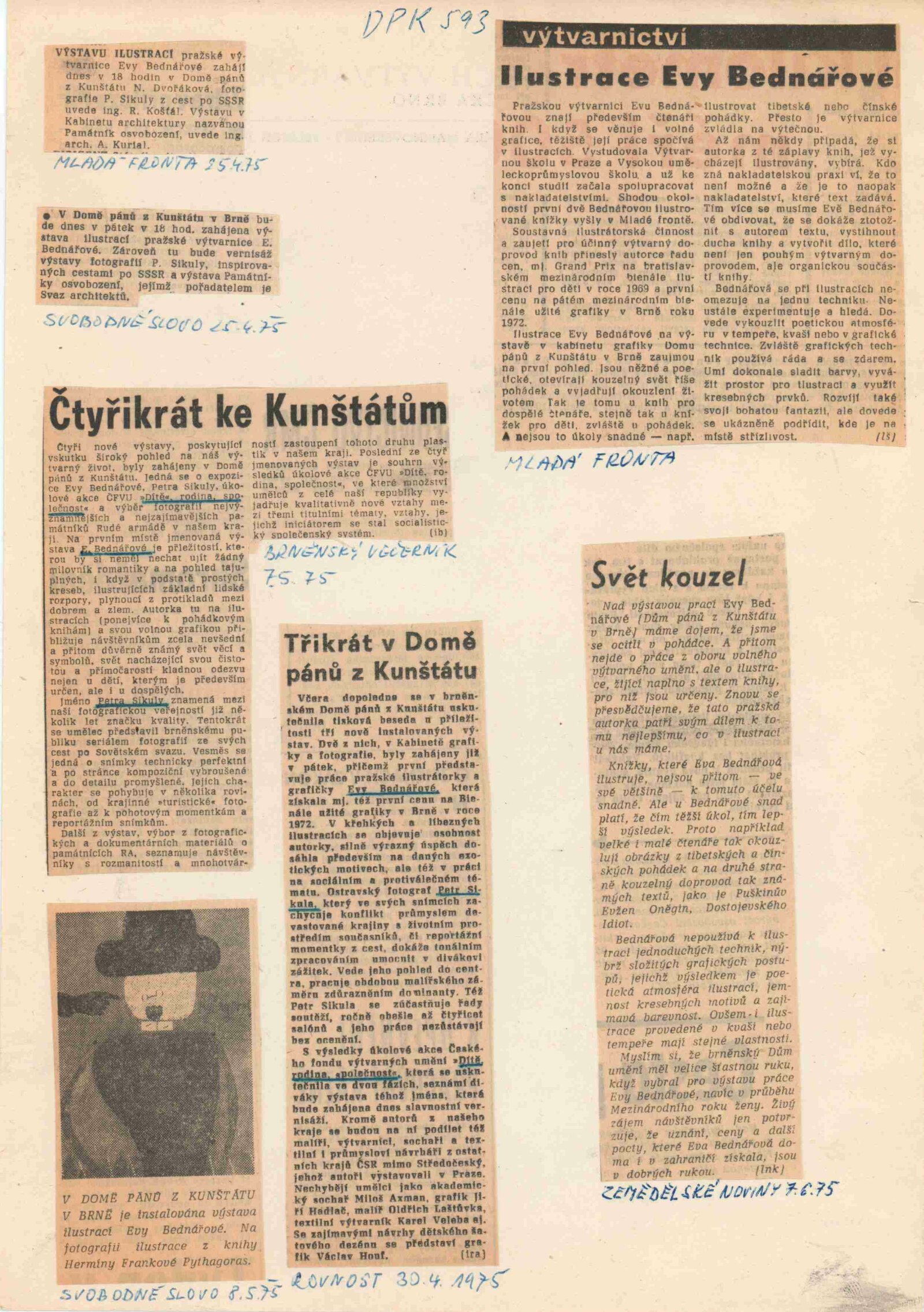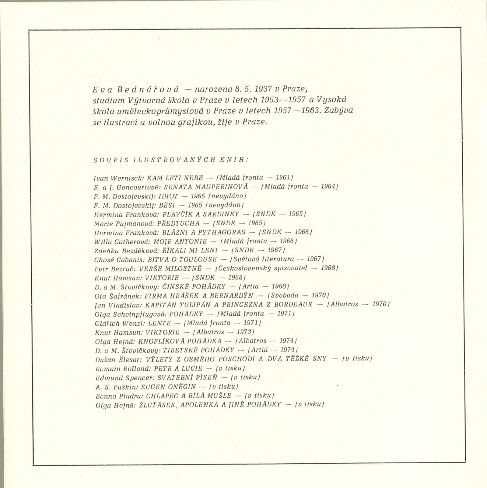 Eva Bednářová. Ilustrace: Dům umění / Dům pánů z Kunštátu, 149. výstava Kabinetu grafiky, 25. 4. – 25. 5. 1975 / Text: Nina Dvořáková. – Brno: DUmB, 1975. – 16 s., obr., životopis, seznam výstav a cen, soupis ilustrovaných knih, DPK 593. – MZK; MG; MMB
