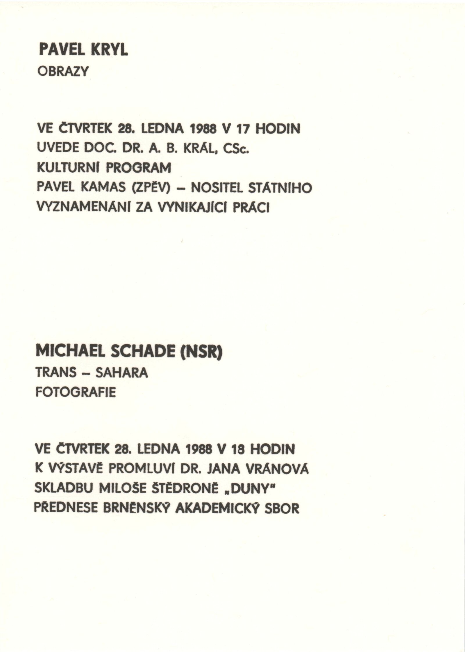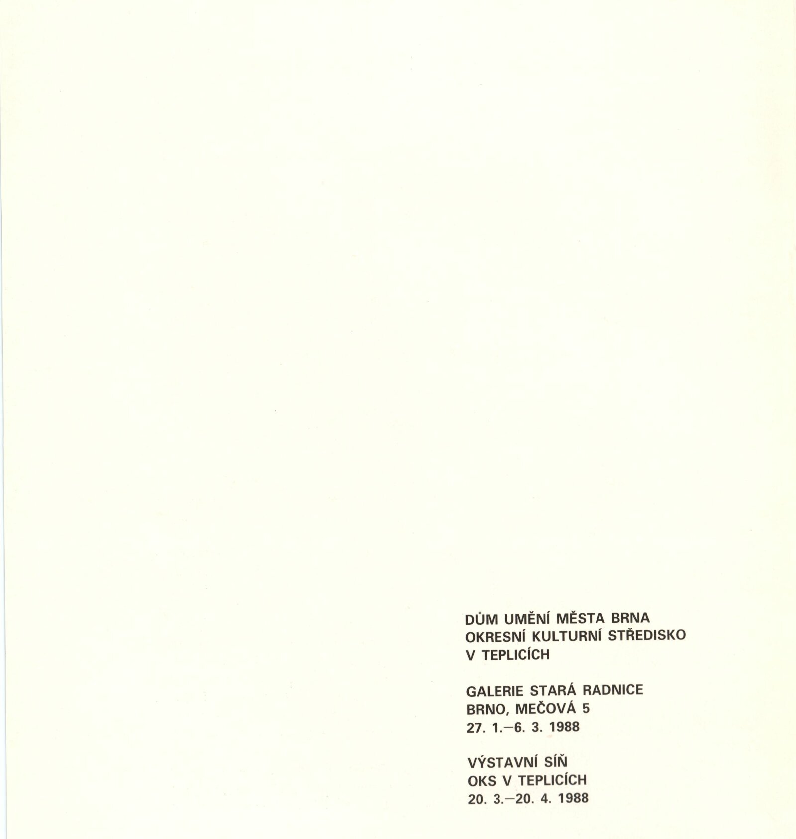 pozvánka, katalog, strojopis (několikrát), fotografie děl a instalace výstavy, seznam vystavených děl, pojistný seznam, korespondence (s autorkou a s Kulturním střediskem v Teplicích), recenze v tisku, poznámky