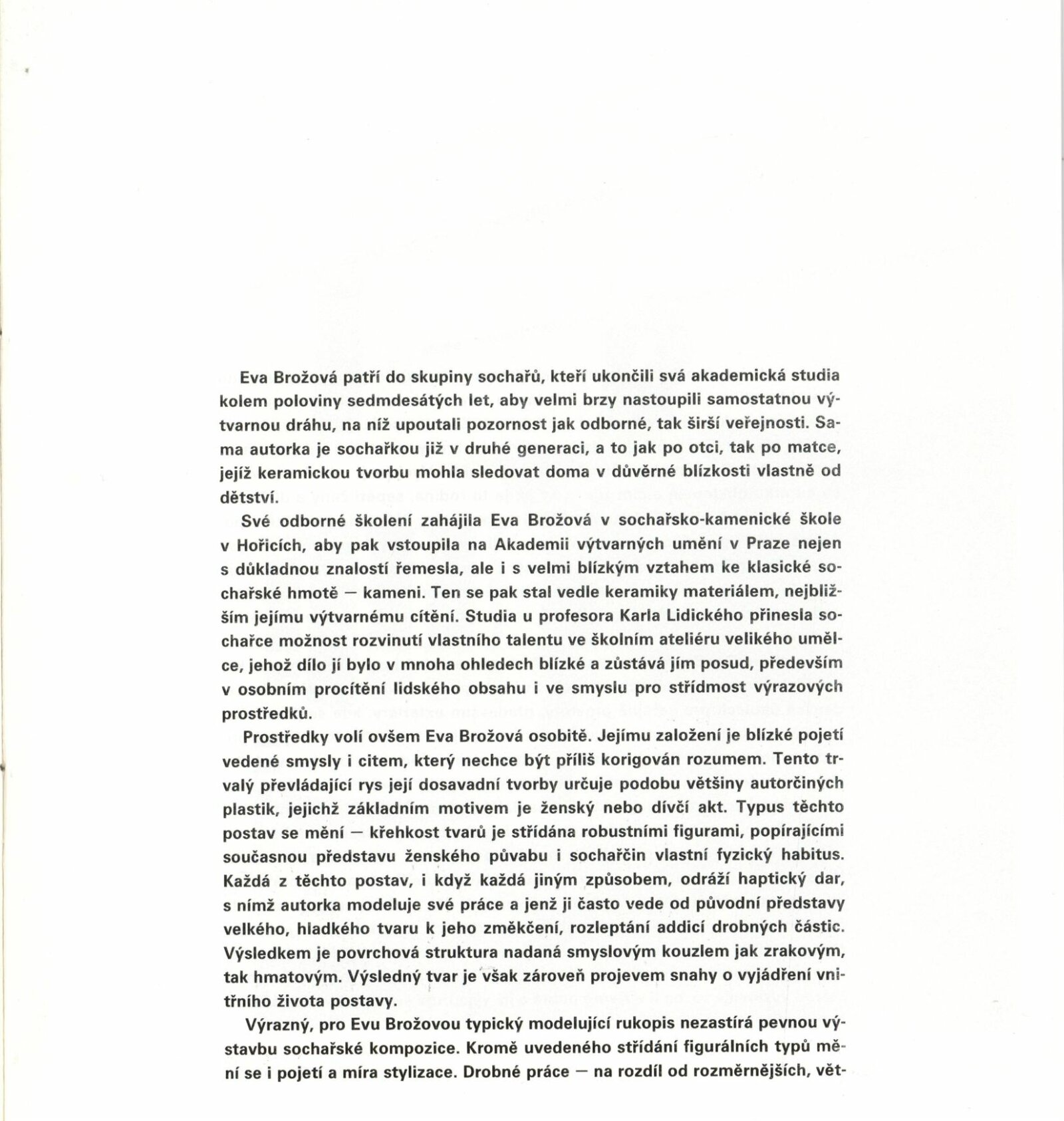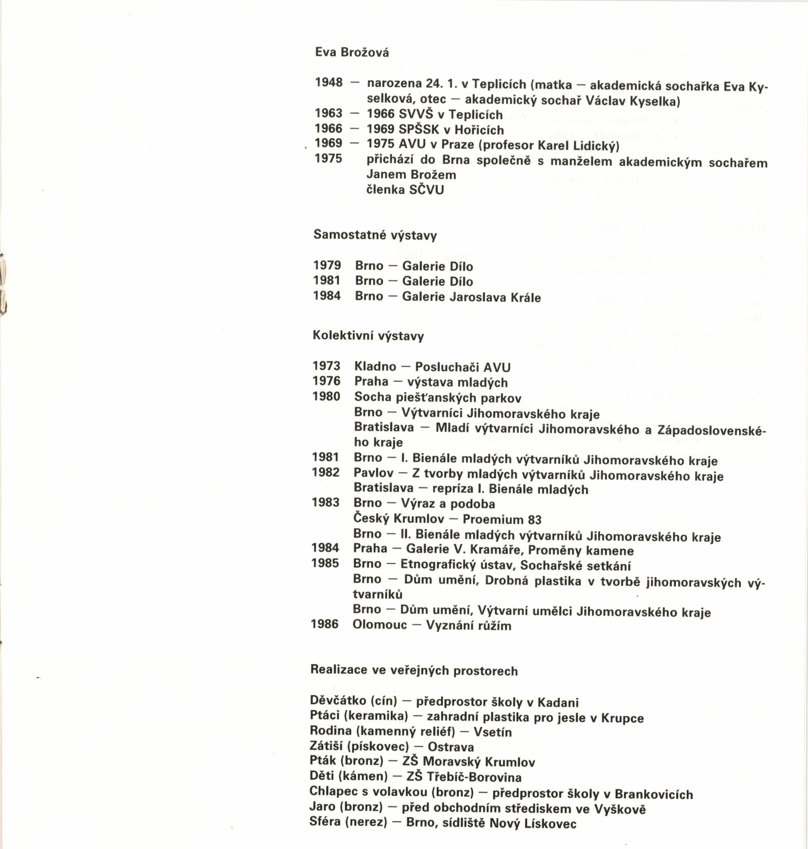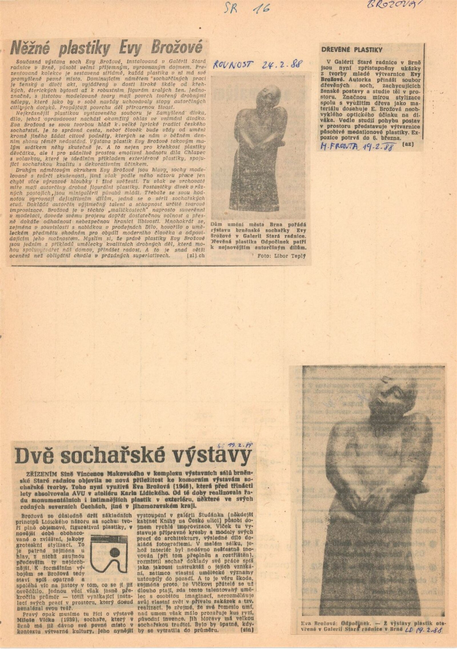 Eva Brožová. Sochy: Galerie Stará radnice, 27. 1. – 6. 3. 1988 / Text: Nina Dvořáková. – Brno: DUmB, 1988. – [16] s., obr., životní data, výstavy, realizace ve veřejných prostorech, GSR 16. – MZK; MG; MMB