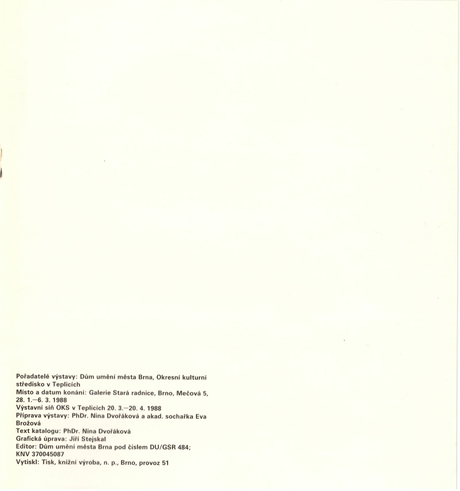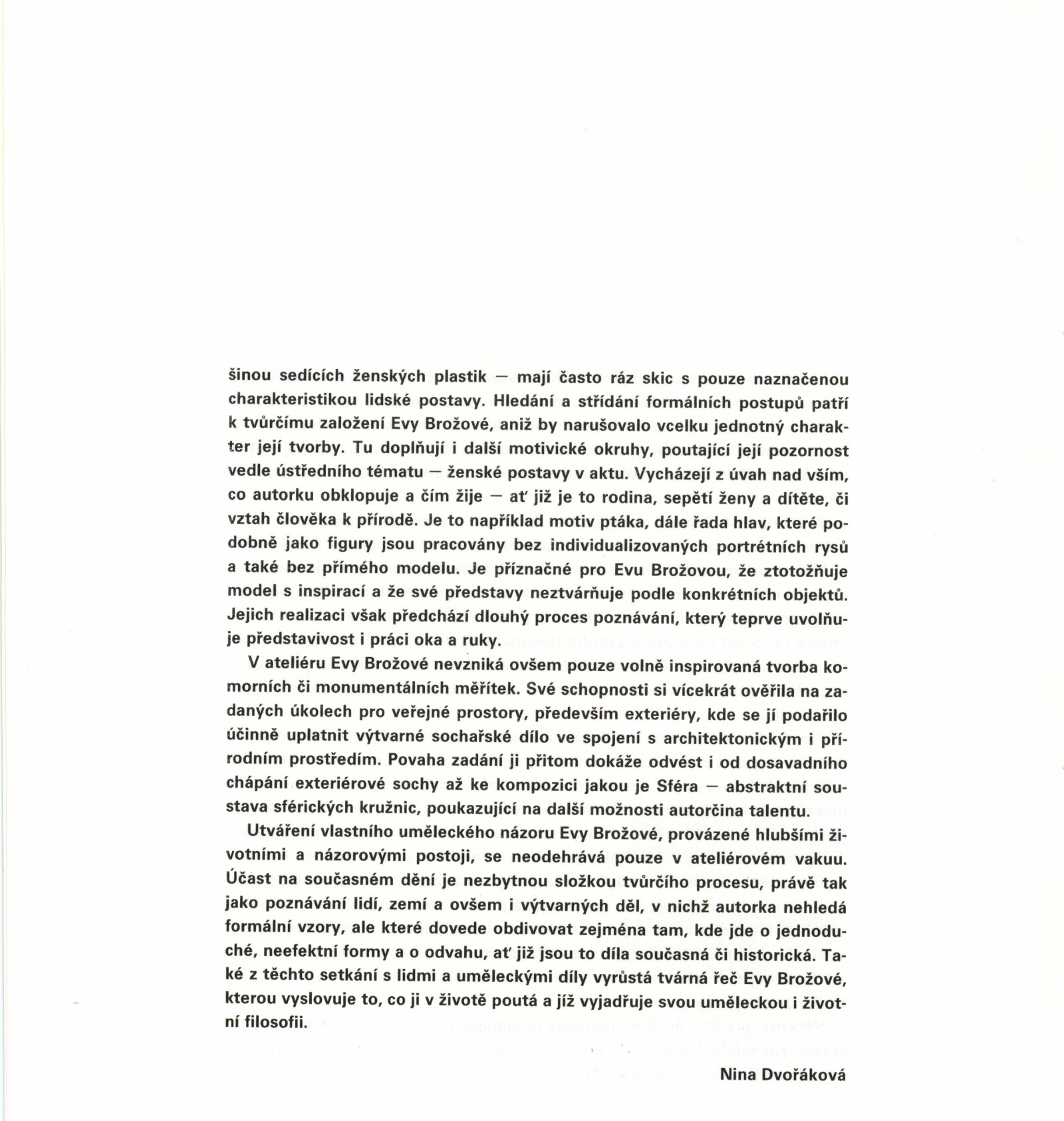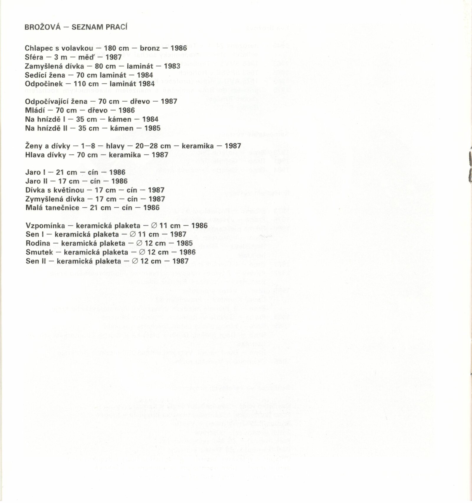 Eva Brožová. Sochy: Galerie Stará radnice, 27. 1. – 6. 3. 1988 / Text: Nina Dvořáková. – Brno: DUmB, 1988. – [16] s., obr., životní data, výstavy, realizace ve veřejných prostorech, GSR 16. – MZK; MG; MMB