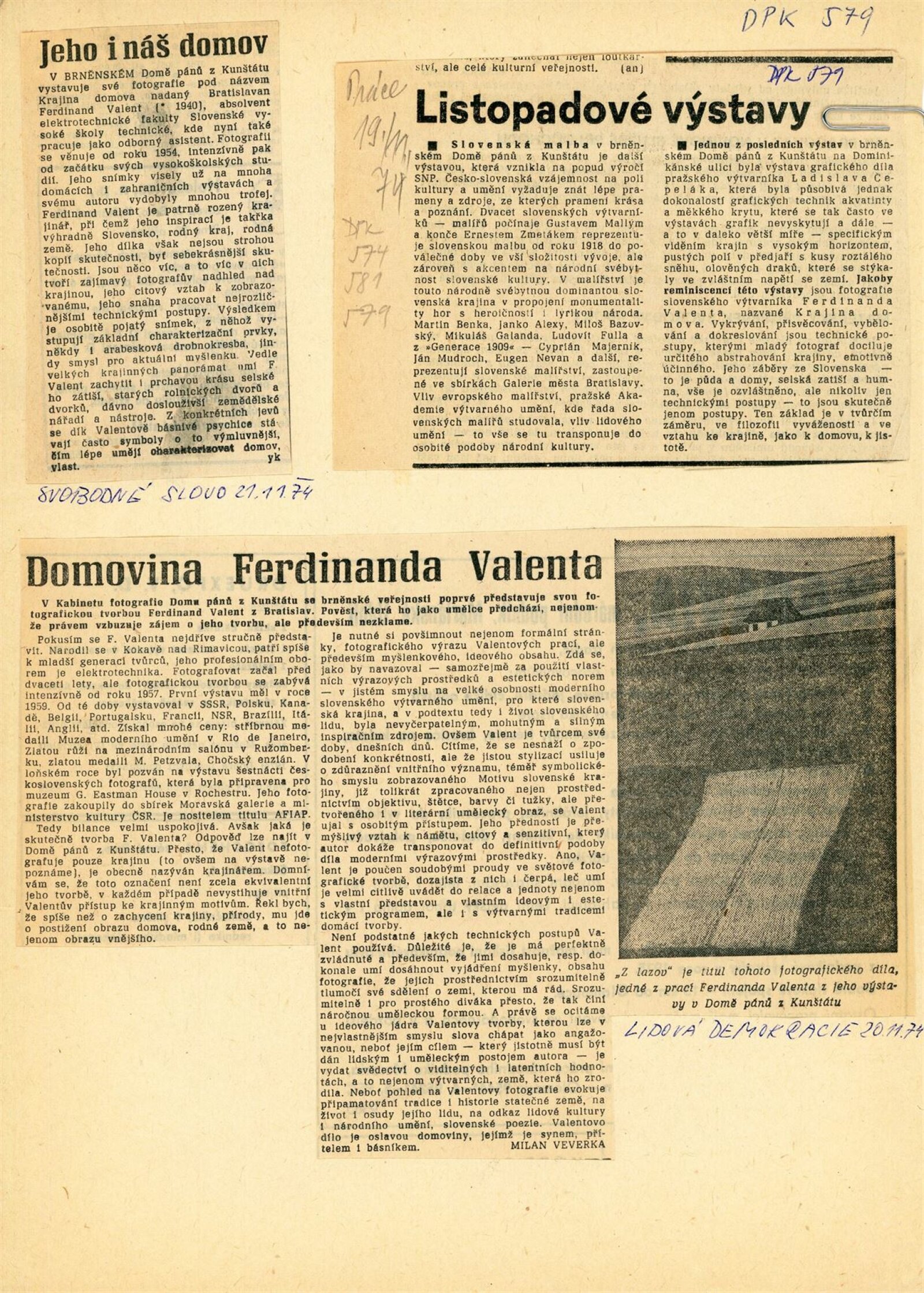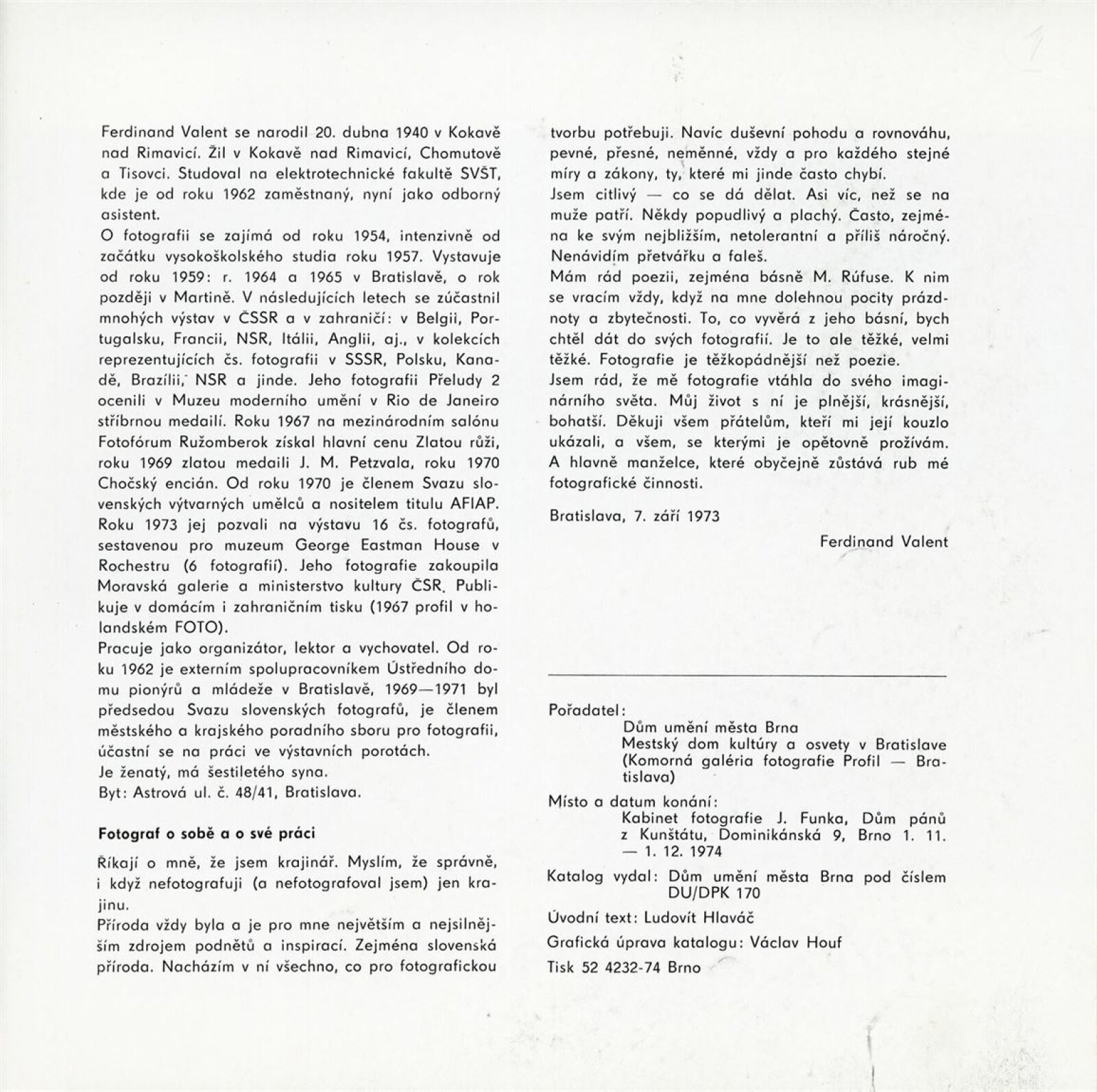 Ferdinand Valent. Fotografie: Dům umění / Dům pánů z Kunštátu, Kabinet fotografie Jaromíra Funka, 1. 11. – 1. 12. 1974 / Texty: Ludovít Hlaváč, autor. – Brno: DUmB, 1974. – 5 s., obr., seznam vystavených prací 1 s., DPK 579. – MZK