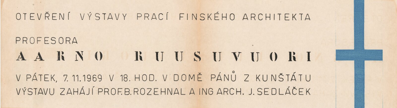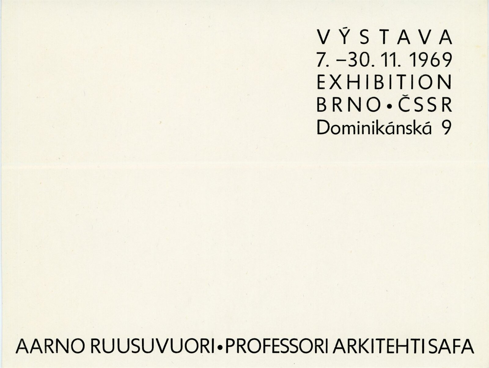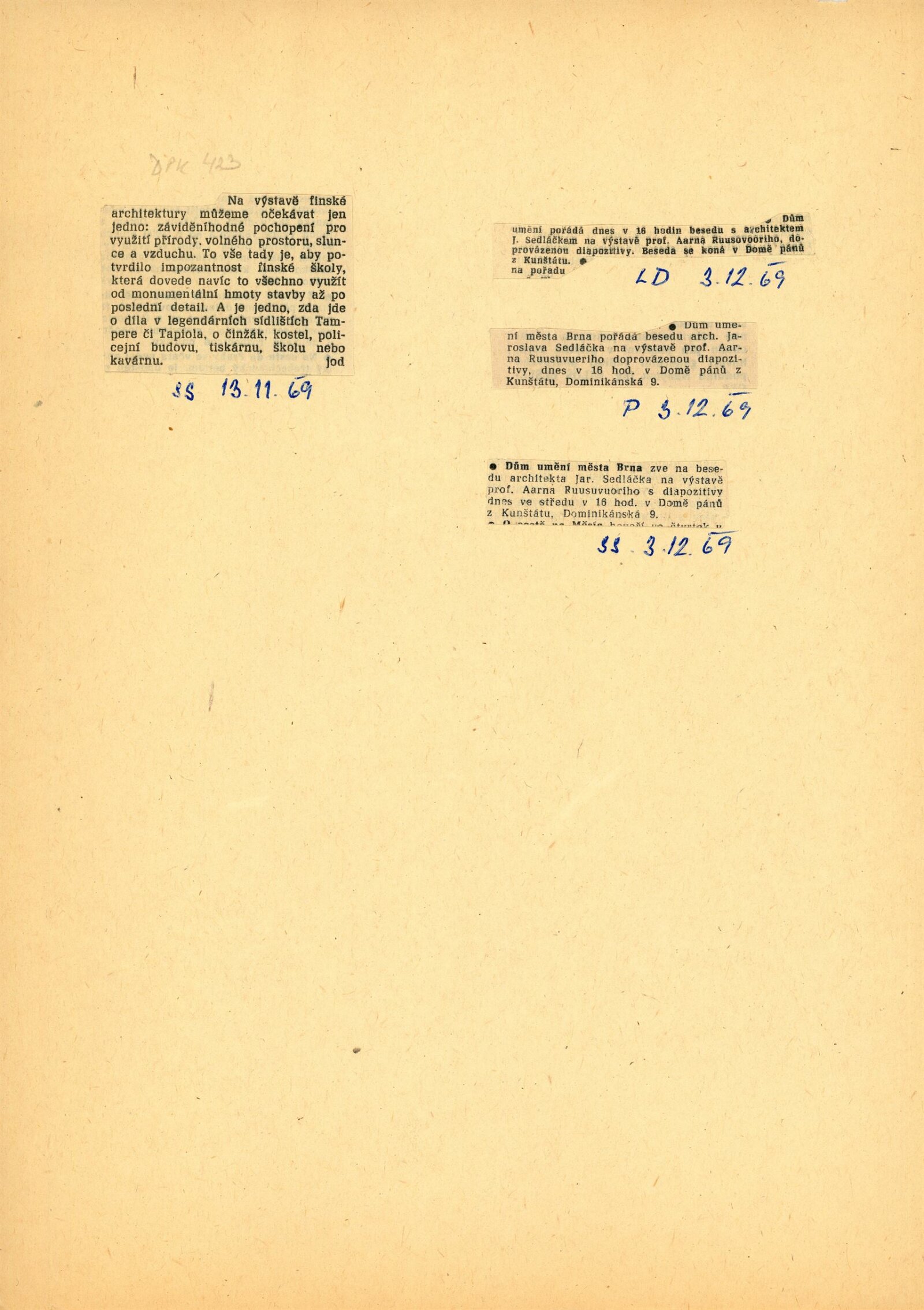 pozvánka na výstavu a besedu, korespondence (potvrzení o pořádání výstavy v Brně, urgence vrácení výstavy, Bratislava, dopisy od Aarno Ruusuvuori), recenze v tisku