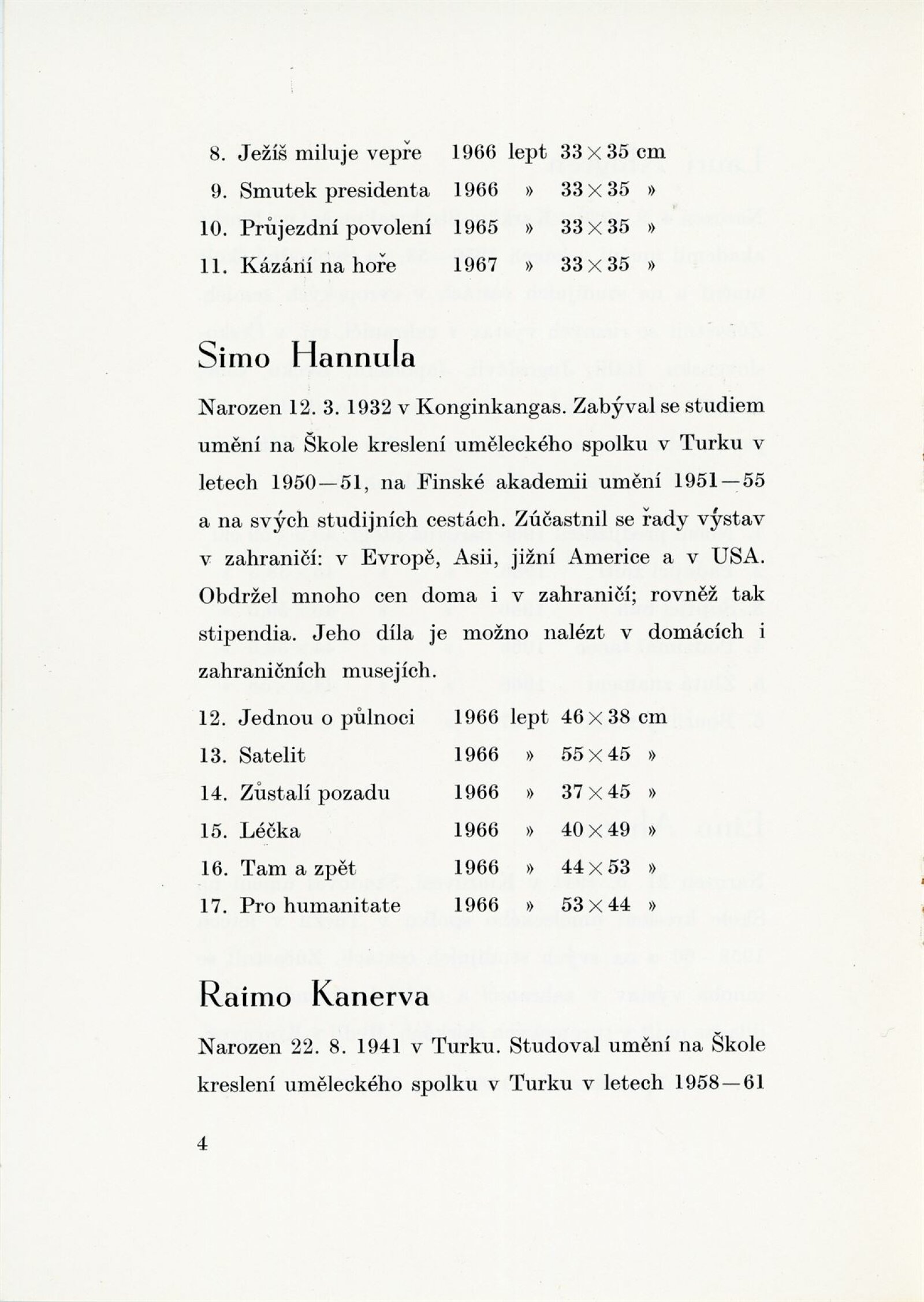 Finská grafika: Dům umění města Brna / Dům pánů z Kunštátu, 91. výstava Kabinetu grafiky, 8. 3. – 1. 4. 1968 / Převzatý katalog putovní výstavy. Výstava finské grafiky v Československu 1967–1968 / Helsinki: Suomen Taiteilijaseura, 1967. – 8 s., DPK 372. – MZK