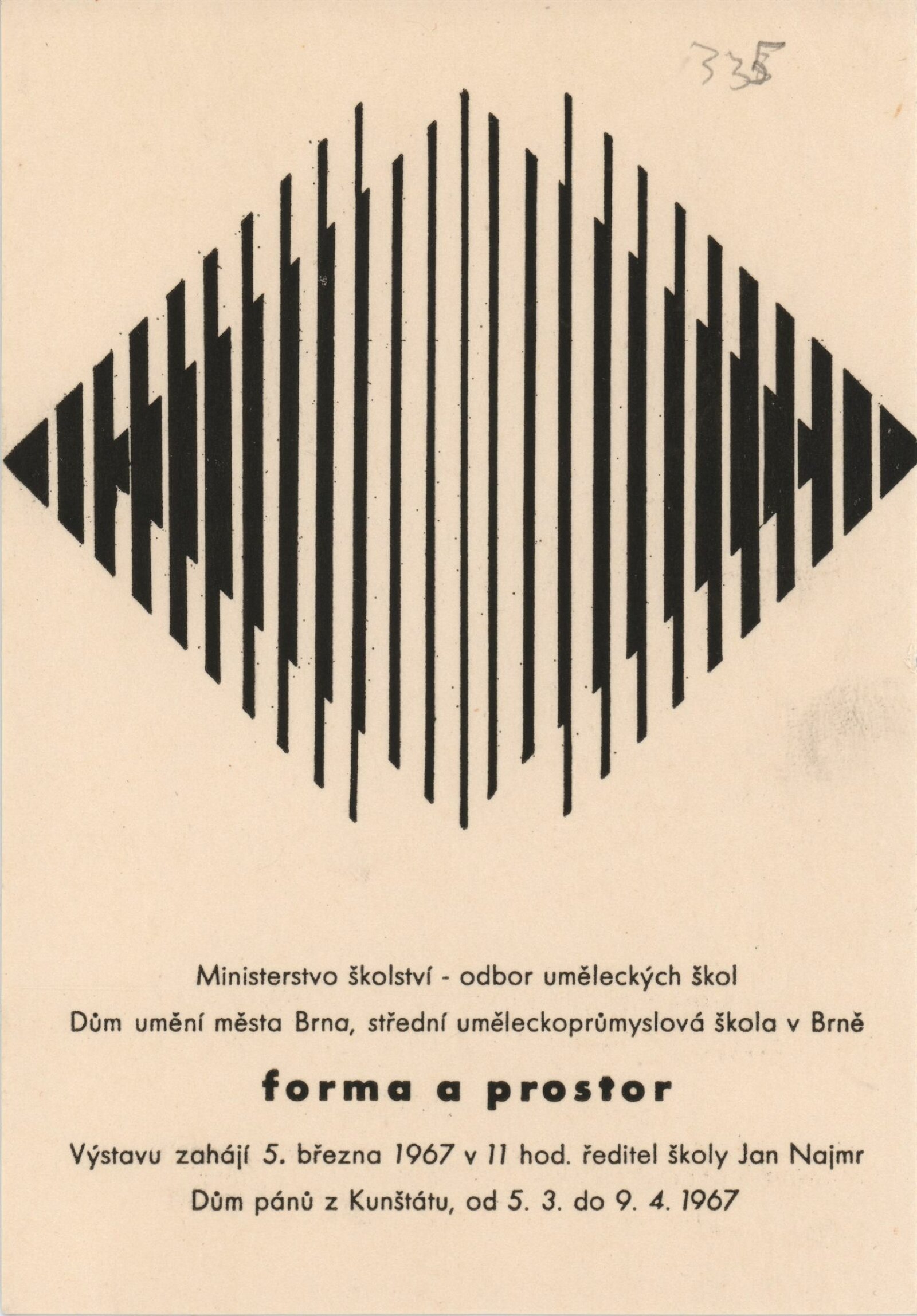 Forma a prostor. Výstava Střední uměleckoprůmyslové školy v Brně: Dům umění města Brna / Dům pánů z Kunštátu, 1. patro, 5. 3. – 9. 4. 1967 / Text: Alena Konečná. – Brno: SUPŠ, 1967. – 12 s., obr., malé tisky SUPŠ, číslo 1, DPK 335