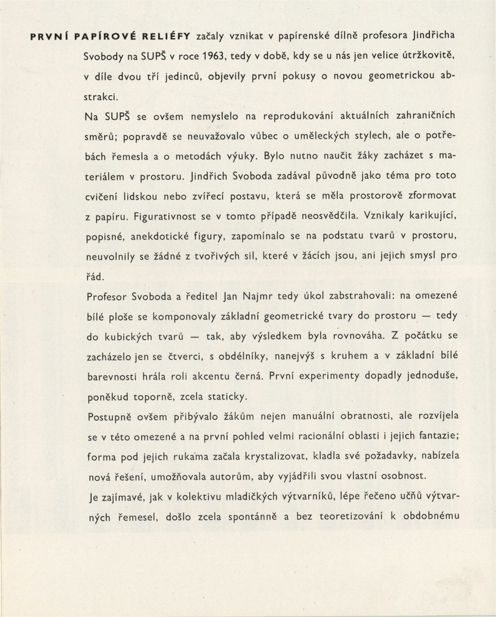 V březnu roku 1967 zahájil Jan Maria Najmr, ředitel brněnské ŠUŘky (dnešní Střední školy umění a designu), specifickou výstavu prací žáků večerní školy nazvanou Forma a prostor. Jeden sál v patře Domu pánů z Kunštátu zaplnily abstraktní reliéfy a objekty z bílého papíru, které vytvořili žáci v dílně uměleckého knihaře Jindřicha Svobody (1909–2001). Tvorba papírových reliéfů měla sloužit jako praktické cvičení k pochopení prostoru a zlepšení žákovy představivosti. První školní zadání spočívalo ve vytvoření lidské či zvířecí postavy, ale výtvory začínajících studentů nebyly přesvědčivé. Podle Aleny Konečné, dlouholeté pedagožky a autorky textu katalogu, vedly první pokusy k podobě „karikující, popisné, anekdotické figury”. Proto se přistoupilo k tvorbě reliéfů složených z geometrických tvarů, z nichž postupně začaly vznikat složité konstruktivní objekty v prostoru pracující s dynamikou, s efekty dopadajícího světla a vyvažováním hmotnosti tvarů, které měly překvapivě blízko k estetice poválečné konstruktivně orientované tvorby. Fotografie Karla Kulatého ukazují rozmanitost a preciznost vystavených děl, jejichž instalace působí uceleně i díky použití bílého papíru bez výrazné struktury. Na instalaci výstavy se podíleli také žáci oddělení prostorového výtvarnictví pod vedením Josefa Adolfa Šálka (1911–1990), který na škole působil dlouhých dvacet pět let v období 1946–1971. Současně s papírovými objekty byla v dalších sálech prvního patra Domu pánů z Kunštátů otevřena výstava Fantaskních kreseb Karla Havlíčka a abstraktní malby italského umělce Emilia Vedovy. Po této úspěšné výstavě chtěl Svoboda připravit navazující přehlídku prostorových instalací podobných labyrintům složených z různých papírových objektů naskládaných na ploše. Vedení školy nakonec tento záměr nepodpořilo. Význam výstavy a především výuky Jindřicha Svobody potvrzuje skutečnost, že práce s papírem je dodnes součástí školní výuky, tvorba papírových reliéfů a objektů slouží jako prostorová cvičení pro žáky prvních a druhých ročníků produktových a interiérových oborů. Tento přístup tak kontinuálně udržuje odkaz na principy výuky 60. let na ŠUŘce.