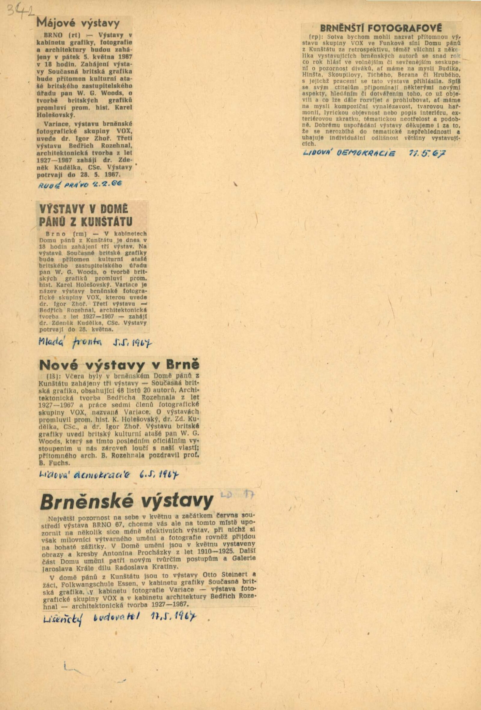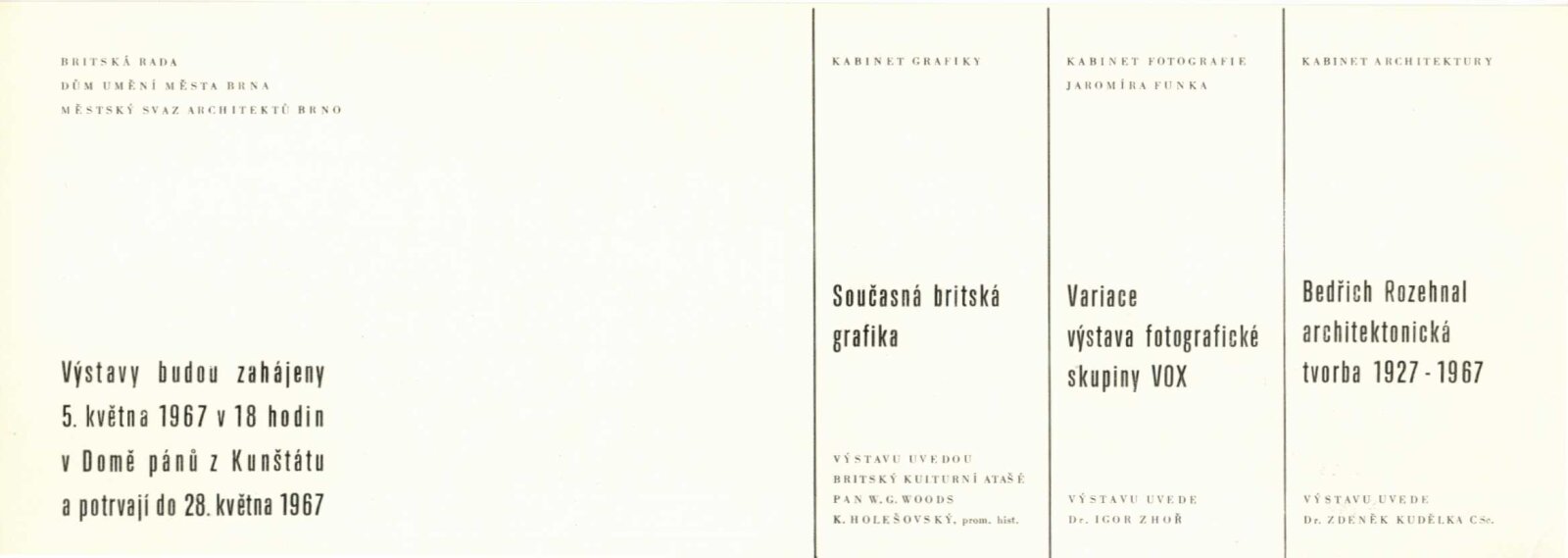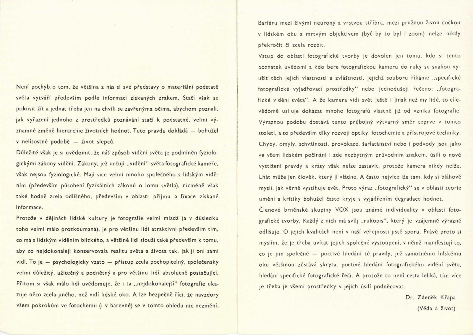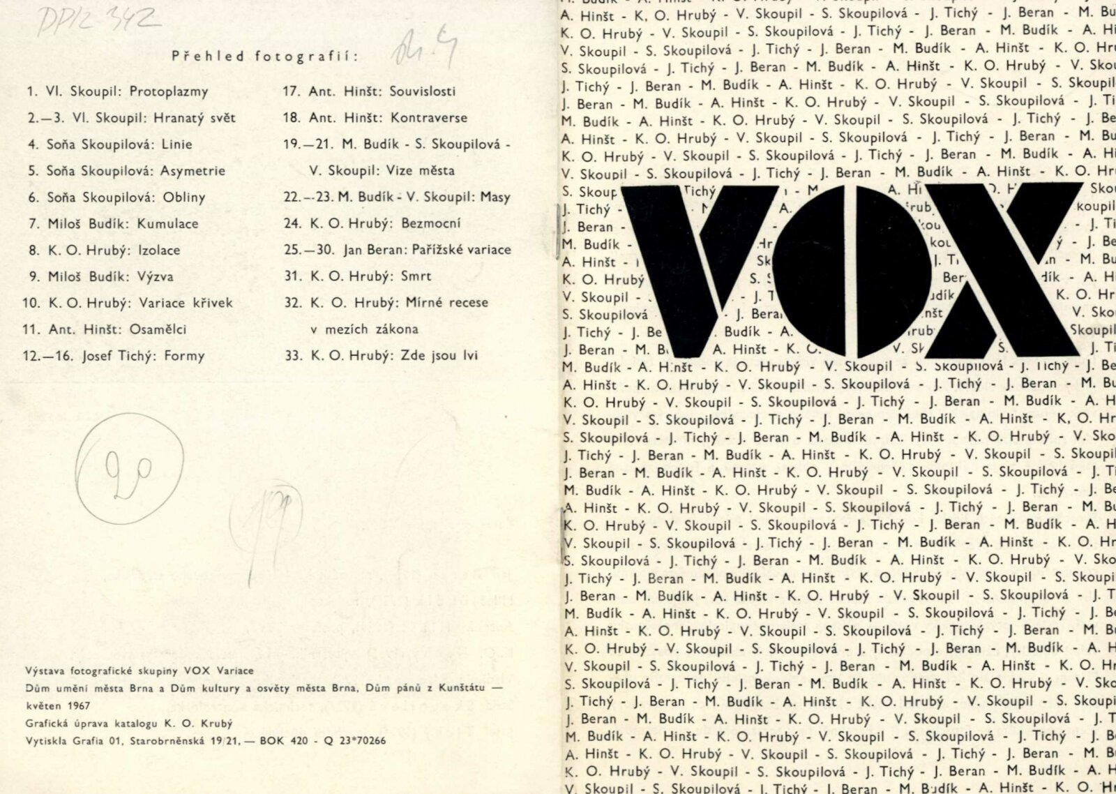 Výstava fotografické skupiny VOX. Variace: Dům umění města Brna/ Dům pánů z Kunštátu, 82. výstava Kabinetu fotografie Jaromíra Funka, 5. 5. – 28. 5. 1967/ Text: Zdeněk Křapa. – Brno: DUmB, 1967. – 12 s., obr., DPK 342