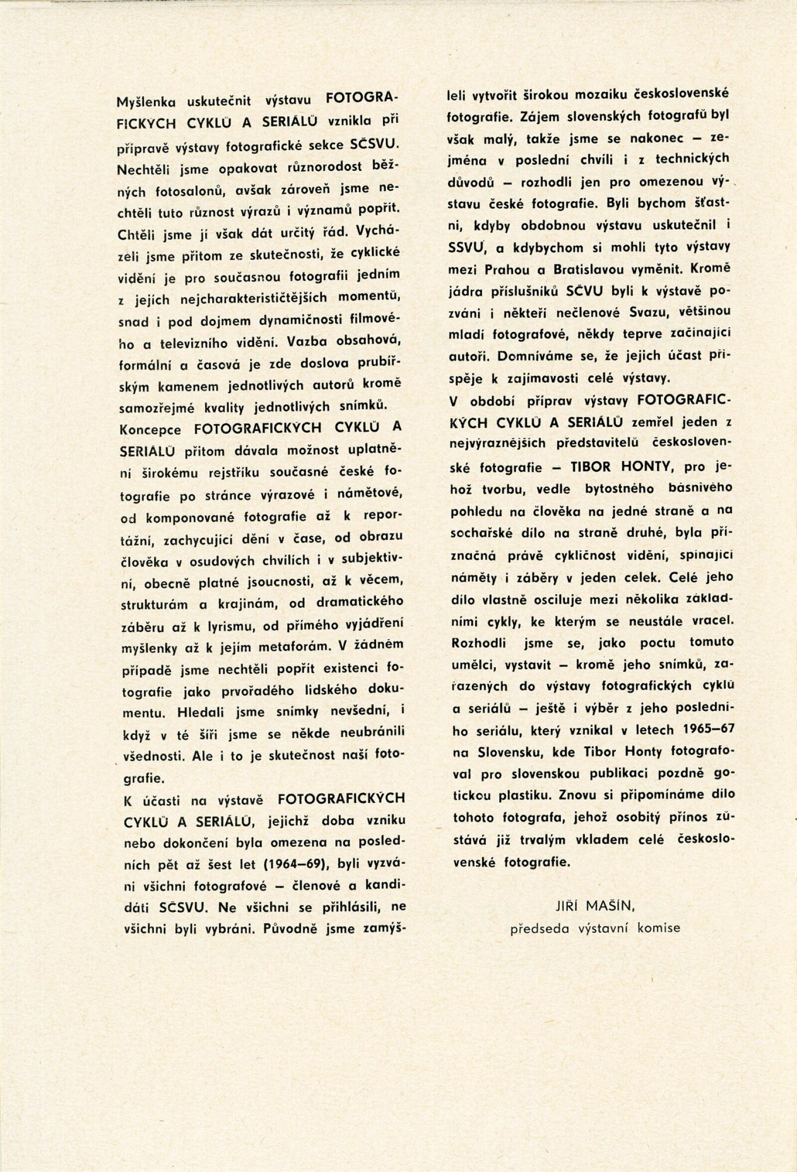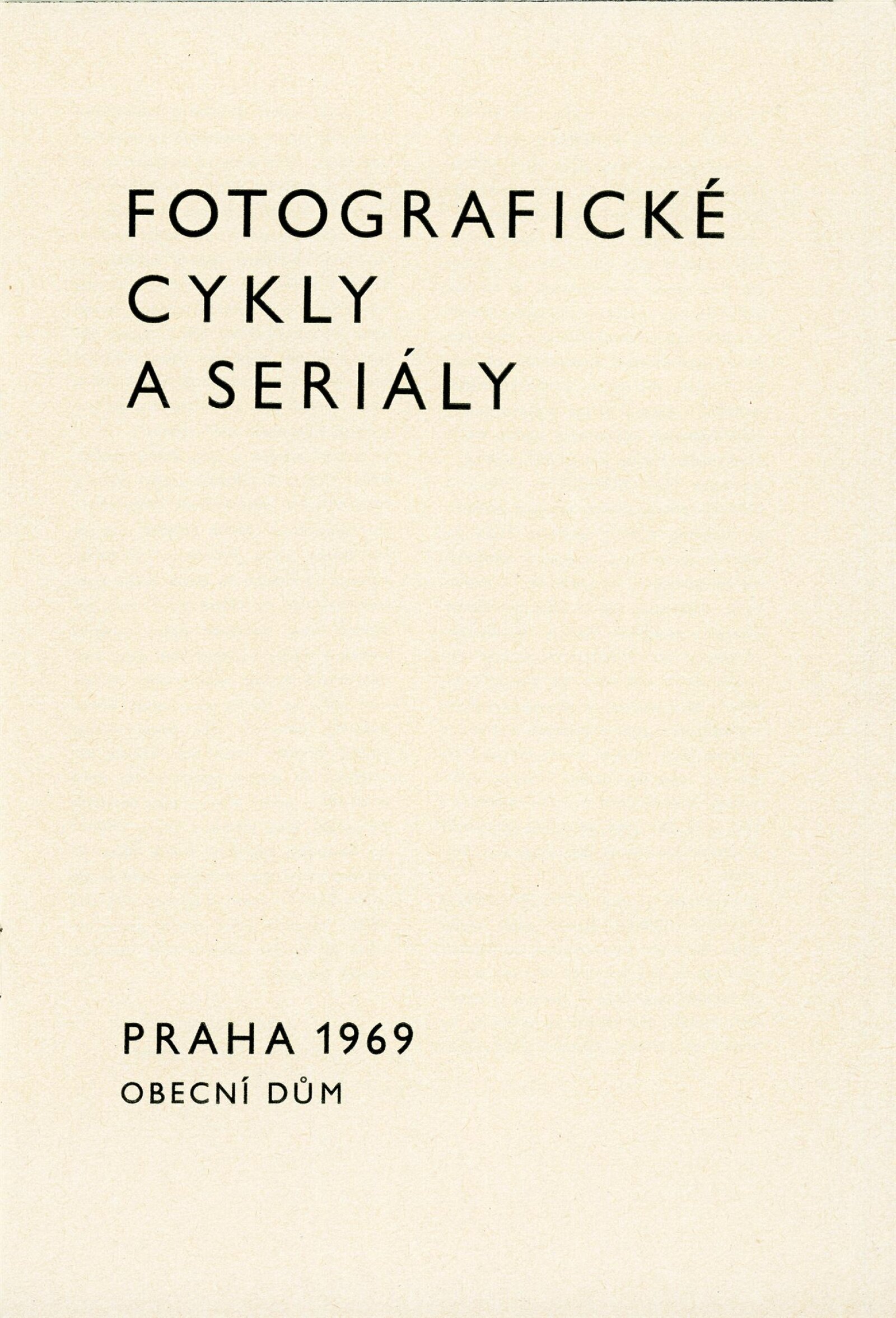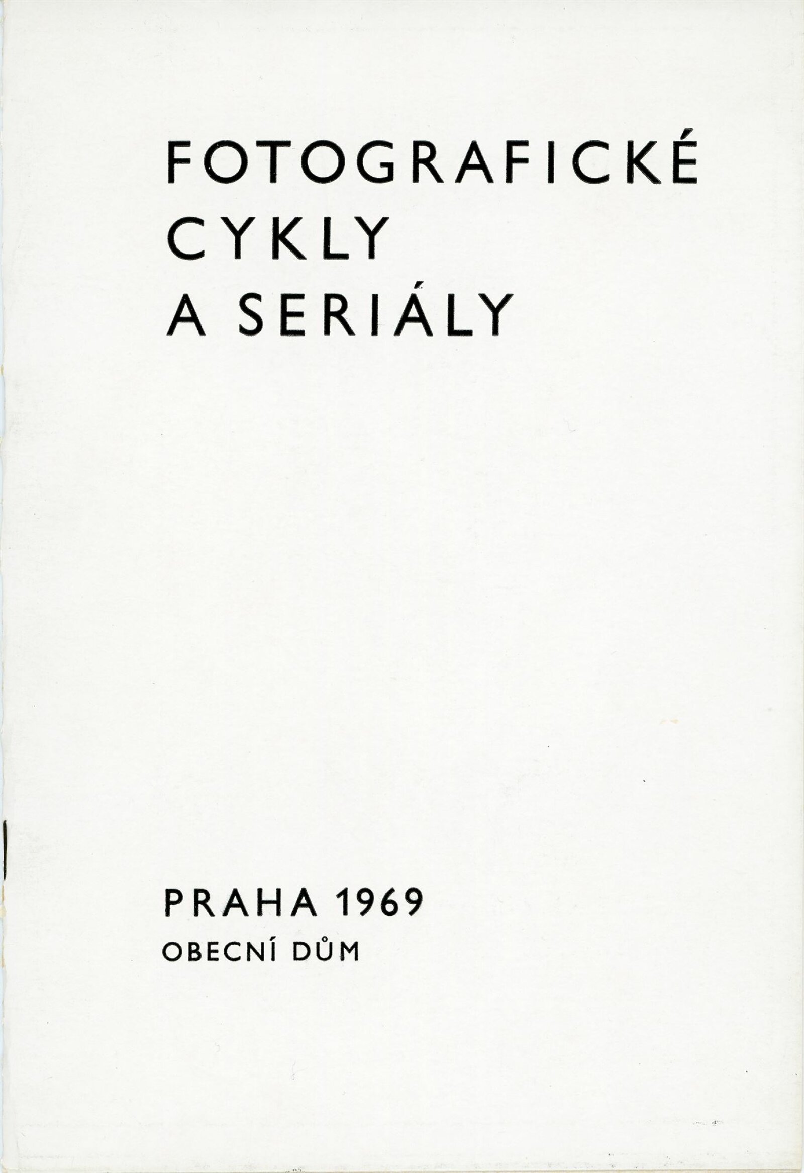 Fotografické cykly a seriály: Dům umění, 10. 7. – 2. 8. 1970 / Převzatý katalog. Fotografické cykly a seriály: Obecní dům, Praha, září–listopad 1969 / Text: Jiří Mašín. – Praha: Galerie hl. města Prahy, 1969. – 24 s., obr., DU 553. – MG