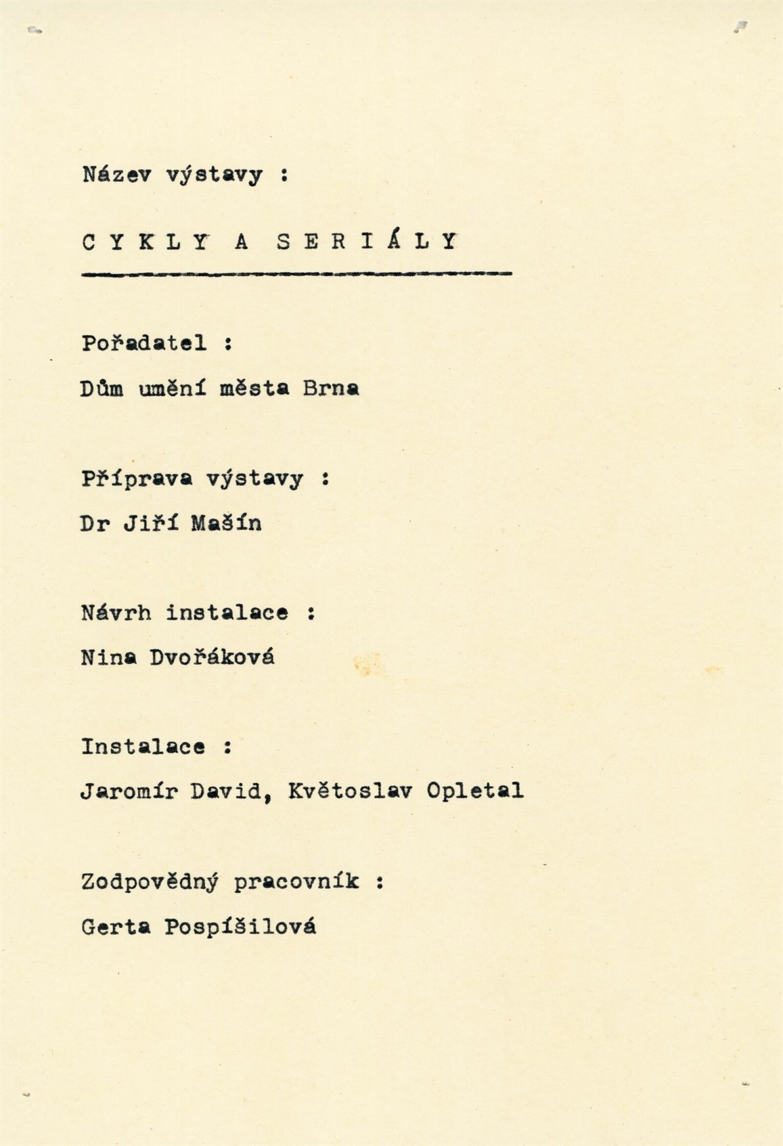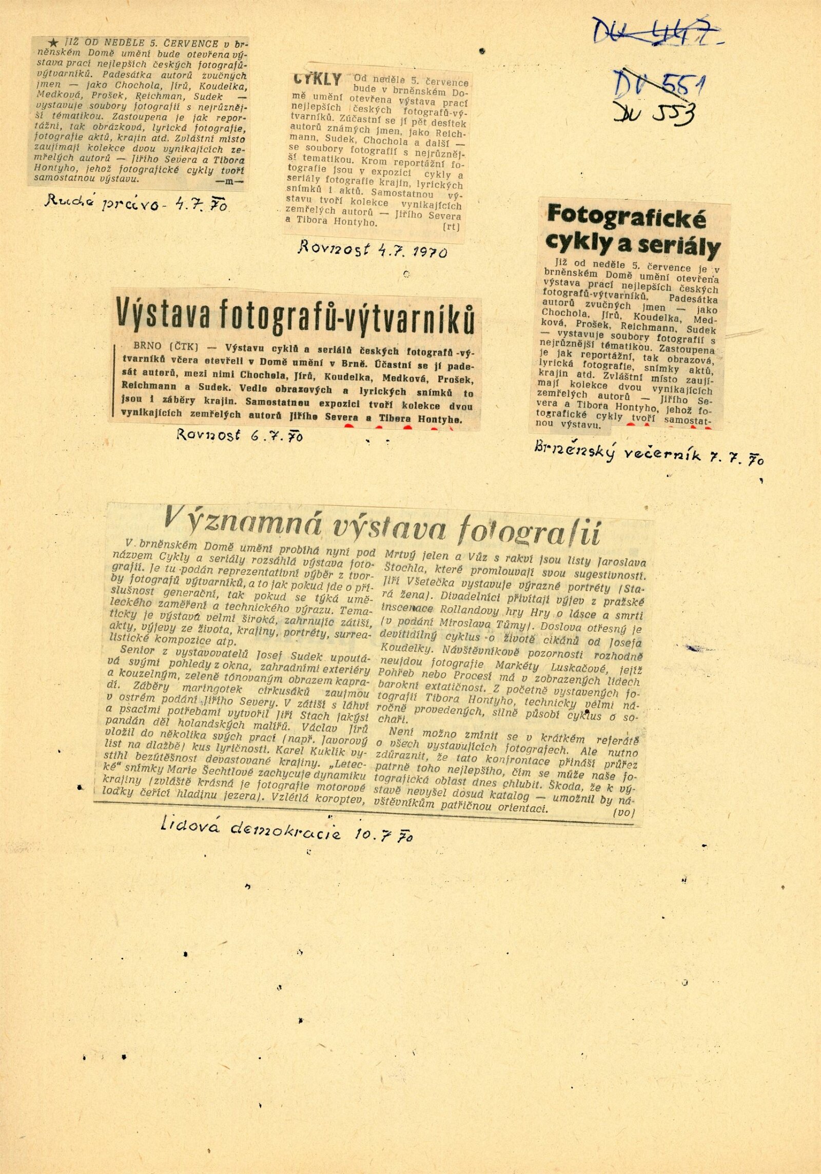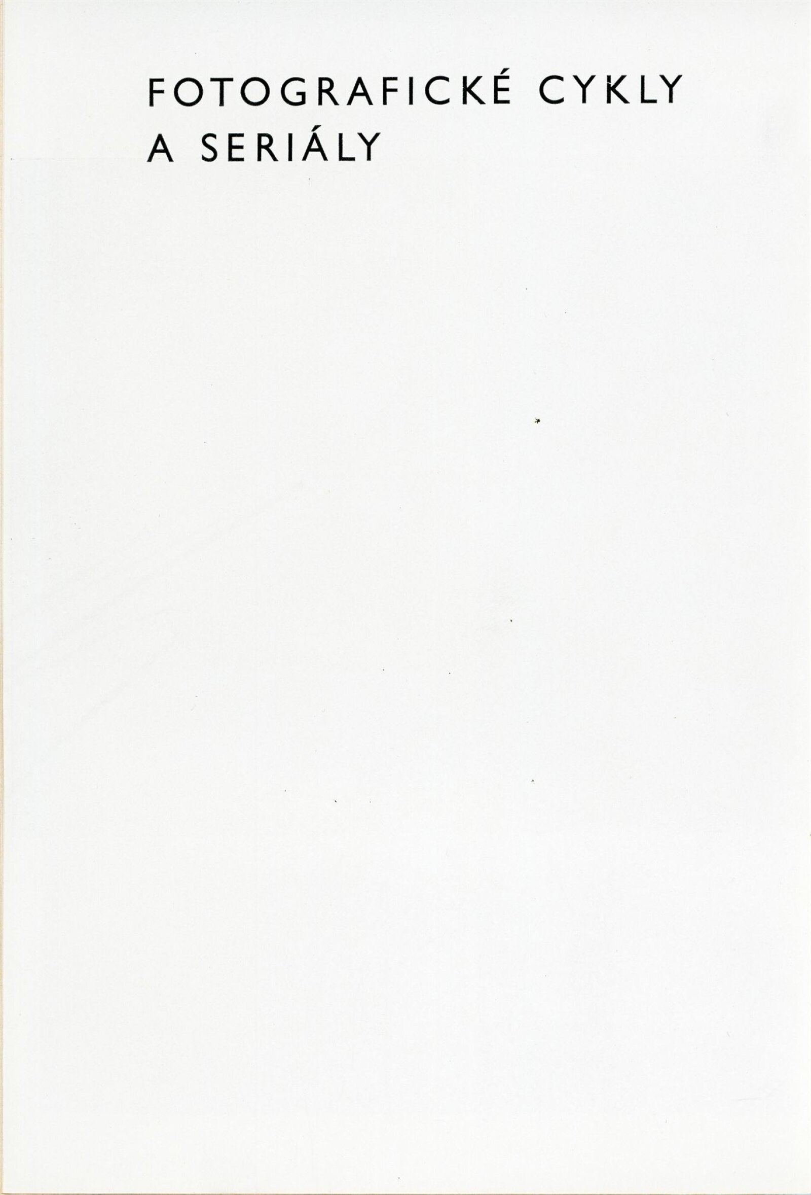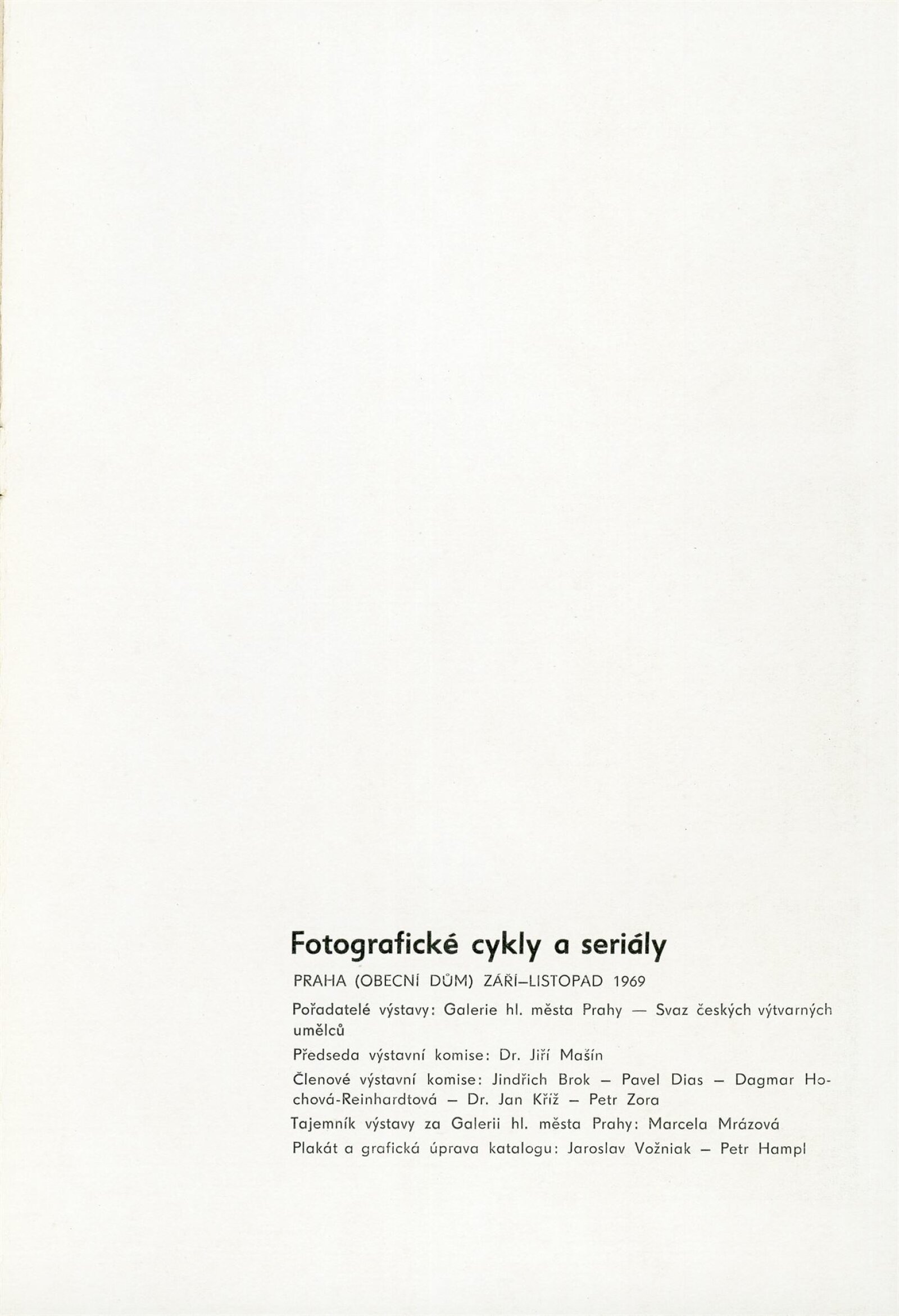 Fotografické cykly a seriály: Dům umění, 10. 7. – 2. 8. 1970 / Převzatý katalog. Fotografické cykly a seriály: Obecní dům, Praha, září–listopad 1969 / Text: Jiří Mašín. – Praha: Galerie hl. města Prahy, 1969. – 24 s., obr., DU 553. – MG