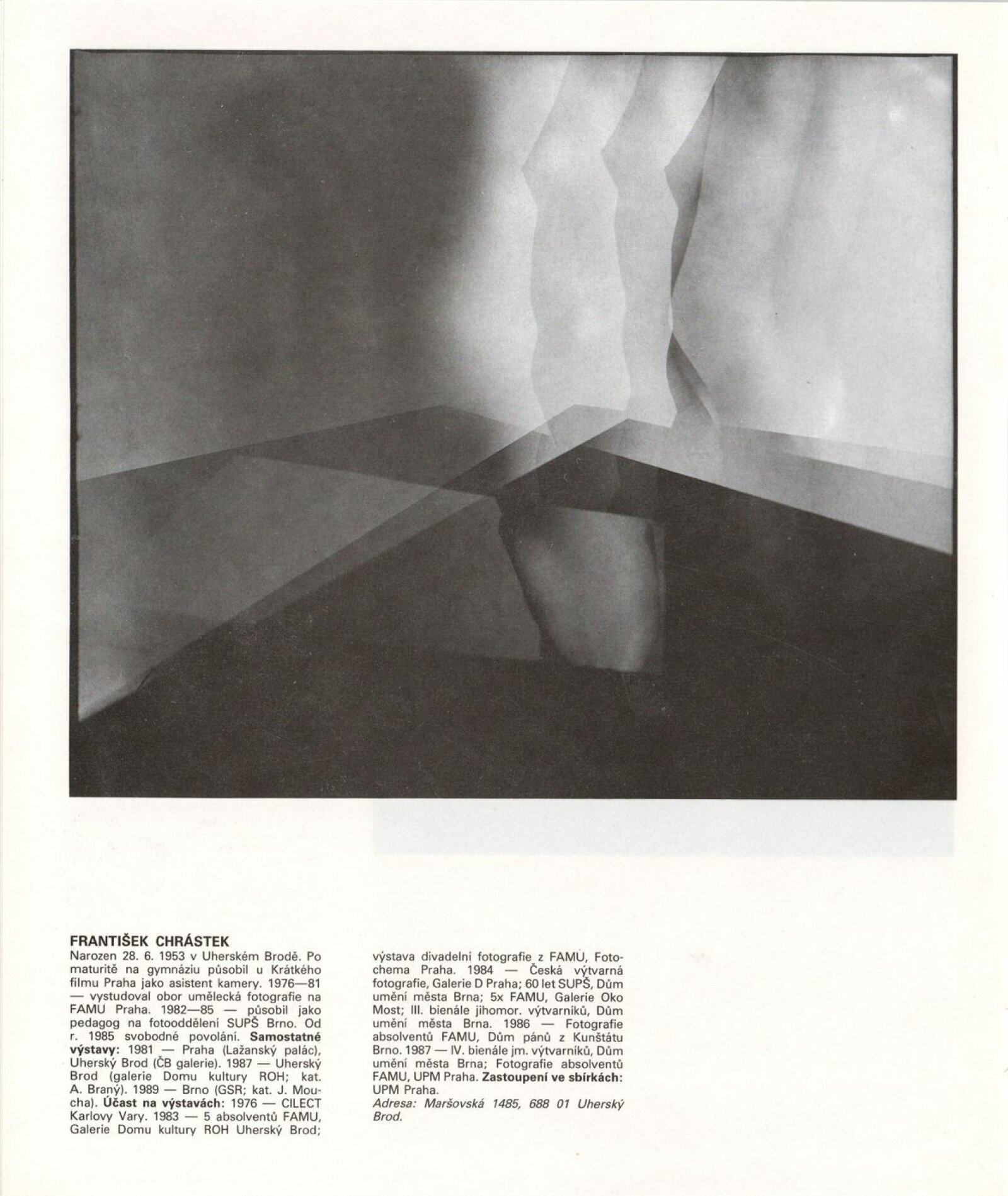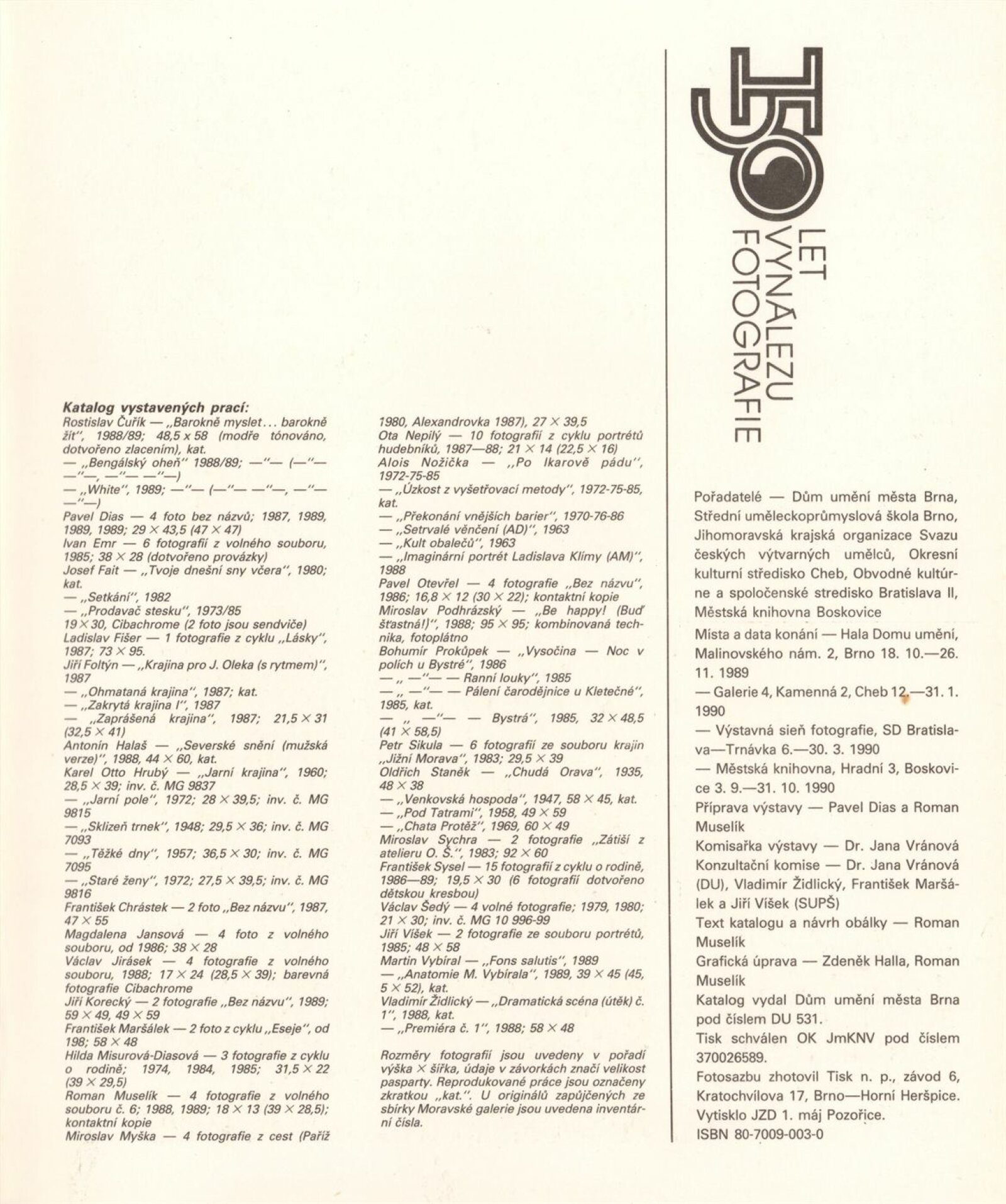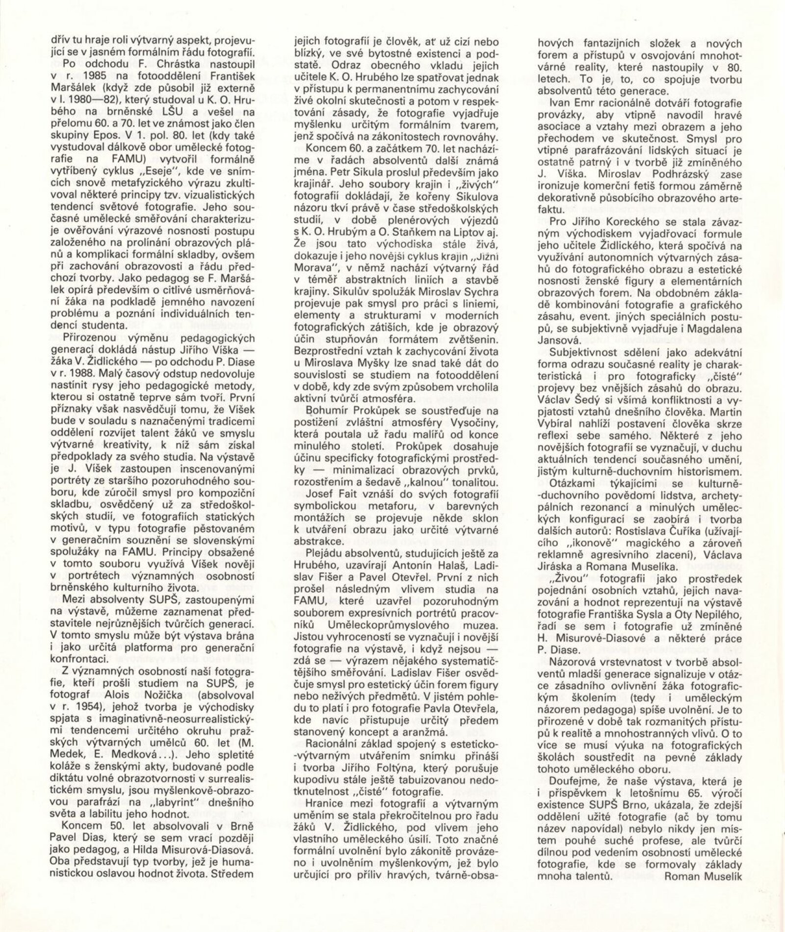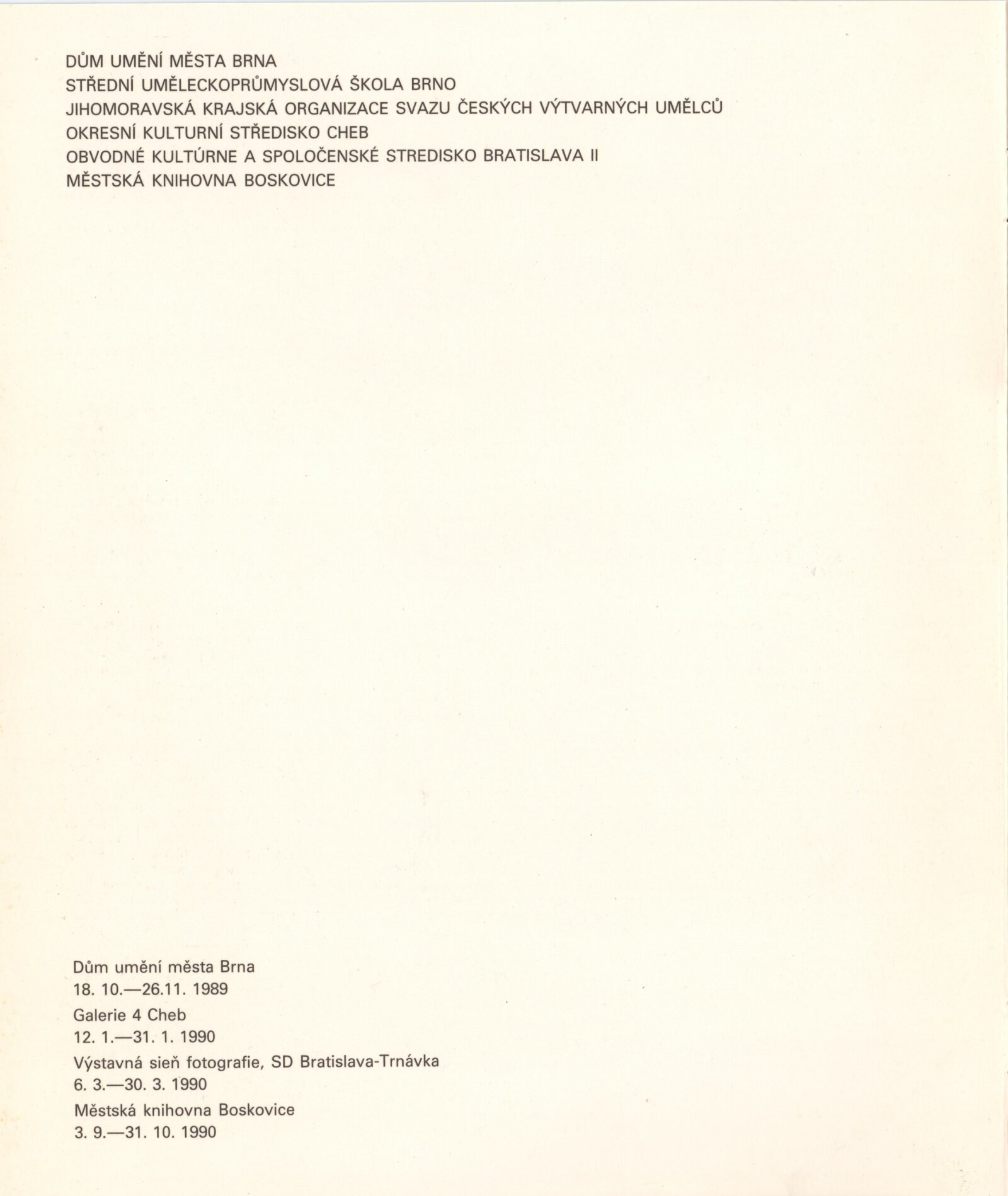 Fotografie absolventů a pedagogů SUPŠ Brno: Dům umění města Brna, hala, 18. 10. – 26. 11. 1989 / Text: Roman Muselík. – Brno: DUmB, 1989. – [22] s., obr., životopisy, DU 874. – MZK; MG