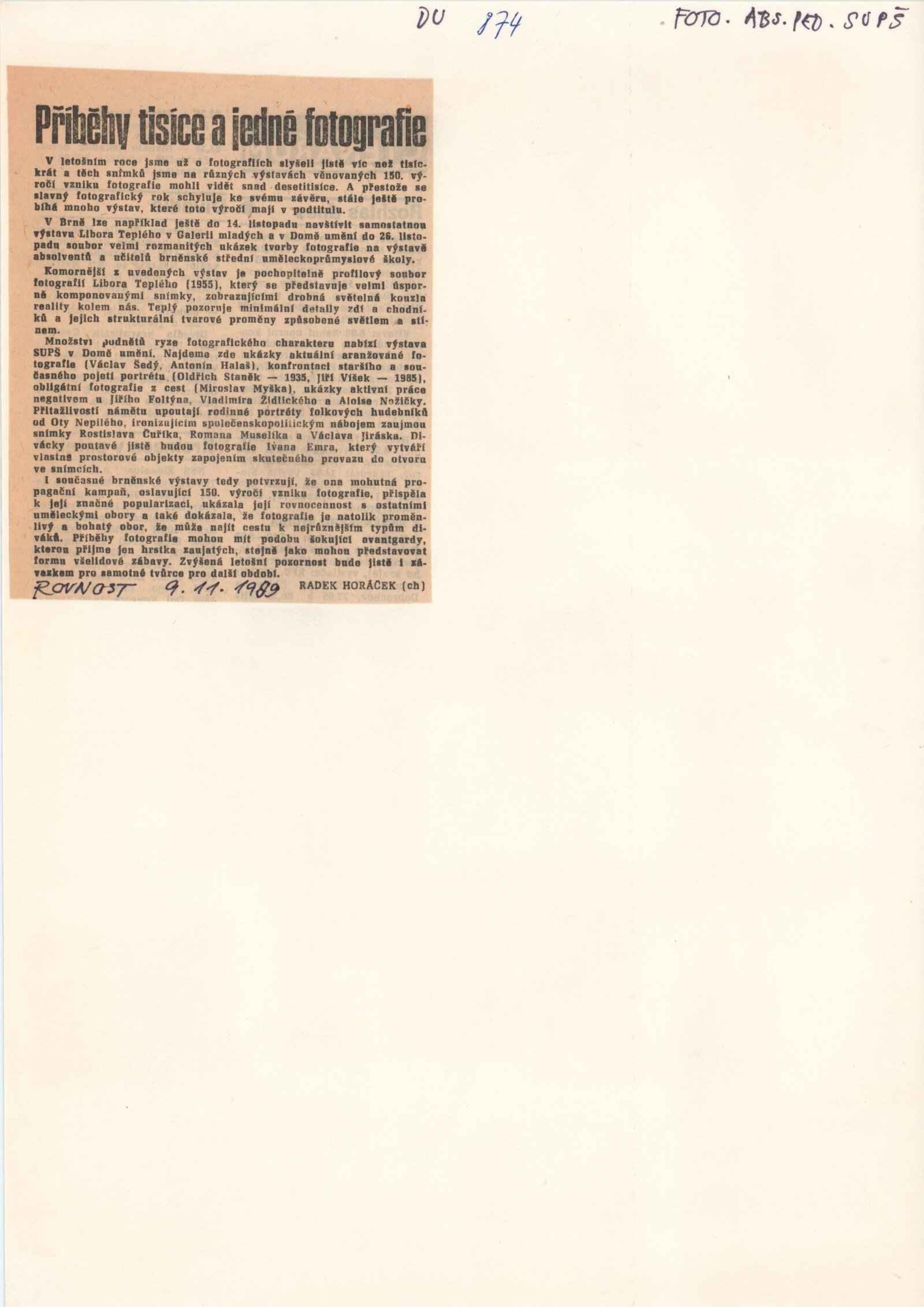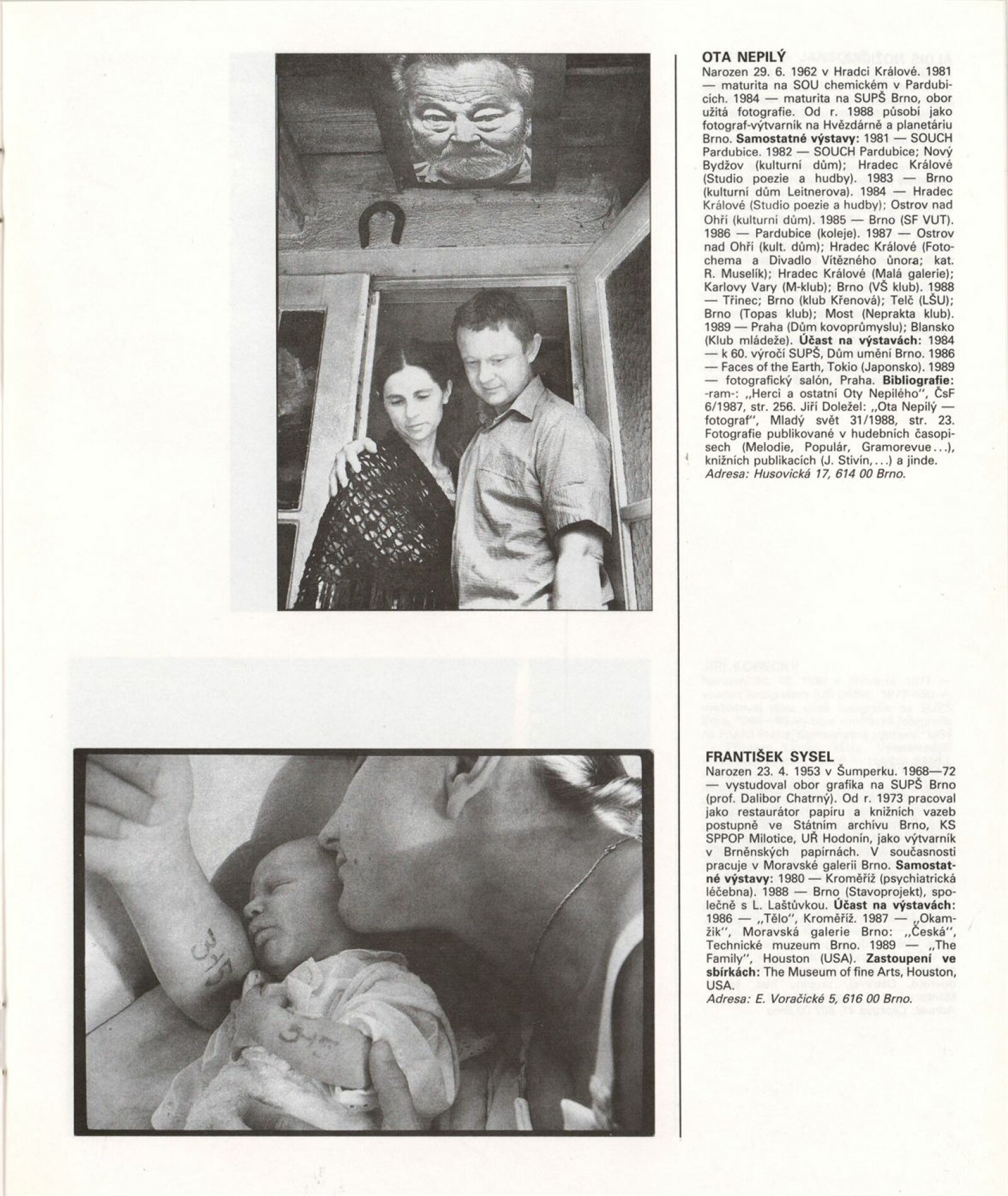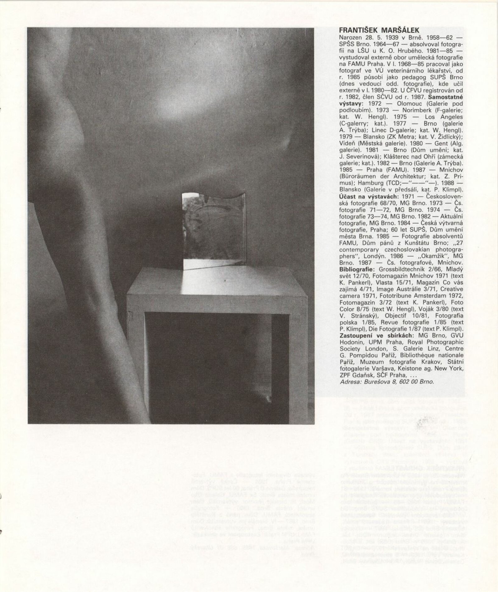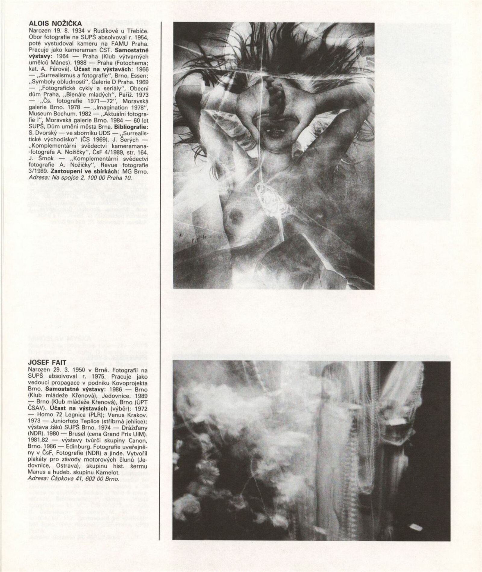 Fotografie absolventů a pedagogů SUPŠ Brno: Dům umění města Brna, hala, 18. 10. – 26. 11. 1989 / Text: Roman Muselík. – Brno: DUmB, 1989. – [22] s., obr., životopisy, DU 874. – MZK; MG