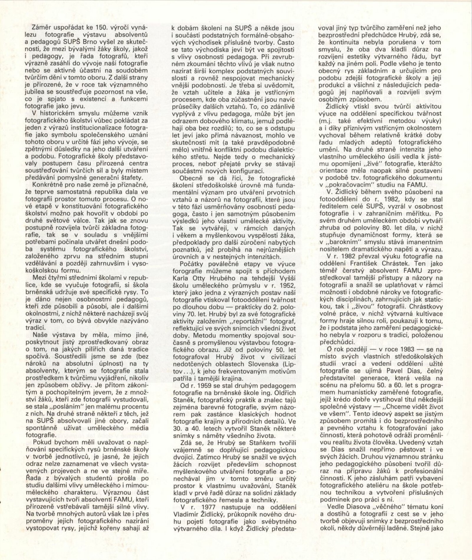 U příležitosti 150. výročí vynálezu fotografie byla připravena výstava pedagogů a některých absolventů oddělení fotografie brněnské Střední uměleckoprůmyslové školy. Koncepce výstavy byla motivována skutečností, že mezi pedagogy i absolventy tohoto oddělení působila řada osobností, výrazněji spjatých se soudobým děním v oblasti fotografie. Fotografie byla na škole součástí výuky již od meziválečného období, vznik samostatného oddělení byl potvrzen v roce 1950. Kromě naplnění základních požadavků, odpovídajících učebním osnovám, které sledovaly především praktickou přípravu studenta pro jeho budoucí působení v oblasti užité tvorby, byl důležitý vliv pedagoga na jeho zaměření i vnímání media fotografie. Počáteční období existence fotooddělení je spojeno s Karlem Otto Hrubým, který je vedl několik desetiletí a ovlivnil řadu svých studentů. Námětová škála jeho fotografií byla široká, zachycoval mnoho poloh současného života s akcentem na momenty každodenního života, ale i krajinu, etnografickou tematiku, vedl studenty k důležitosti myšlenkového záměru i kompoziční výstavby fotografie. Společně s ním vyučoval na oddělení Oldřich Staněk, který se věnoval více technickému zvládnutí prací, později Antonín Hinšt. Názorovou změnu přinesl následně Vladimír Židlický, zastánce vnímání fotografie jako individuálního díla s použitím technologií blízkých jiným výtvarným oborům, František Chrástek, zdůrazňující výtvarnou kultivovanost fotografie. Humanisticky zaměřená fotografie je spojena s Pavlem Diasem, zdůrazňující vztah k současnému životu, v osmdesátých letech působil na oddělení František Maršálek, člen brněnské skupiny EPOS, Jiří Víšek, podporující výtvarné kreativity studentů, v dalších letech pak Martin Vybíral, který vedl oddělení od poloviny devadesátých let, Jiří Dvořák, Ivan Emr. Výběr absolventů fotooddělení SUPŠ představoval více i méně známé osobnosti soudobé fotografie v širším generačním a názorovém rozpětí – patřili k nim Alois Nožička, Hilda Misurová-Diasová, Petr Sikula, Miroslav Sychra, Jiří Foltýn, Miroslav Myška, Václav Jirásek, Roman Muselík, Rostislav Čuřík, Ota Nepilý a řada dalších. Někteří z nich pak pokračovali ve studiu na FAMU v Praze, působí v oblasti volné i užité tvorby, mnozí i jako pedagogové. SUPŠ pro ně byla důležitým východiskem, která zvláště zpočátku formovala jejich fotografické vidění.