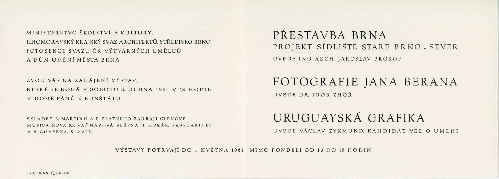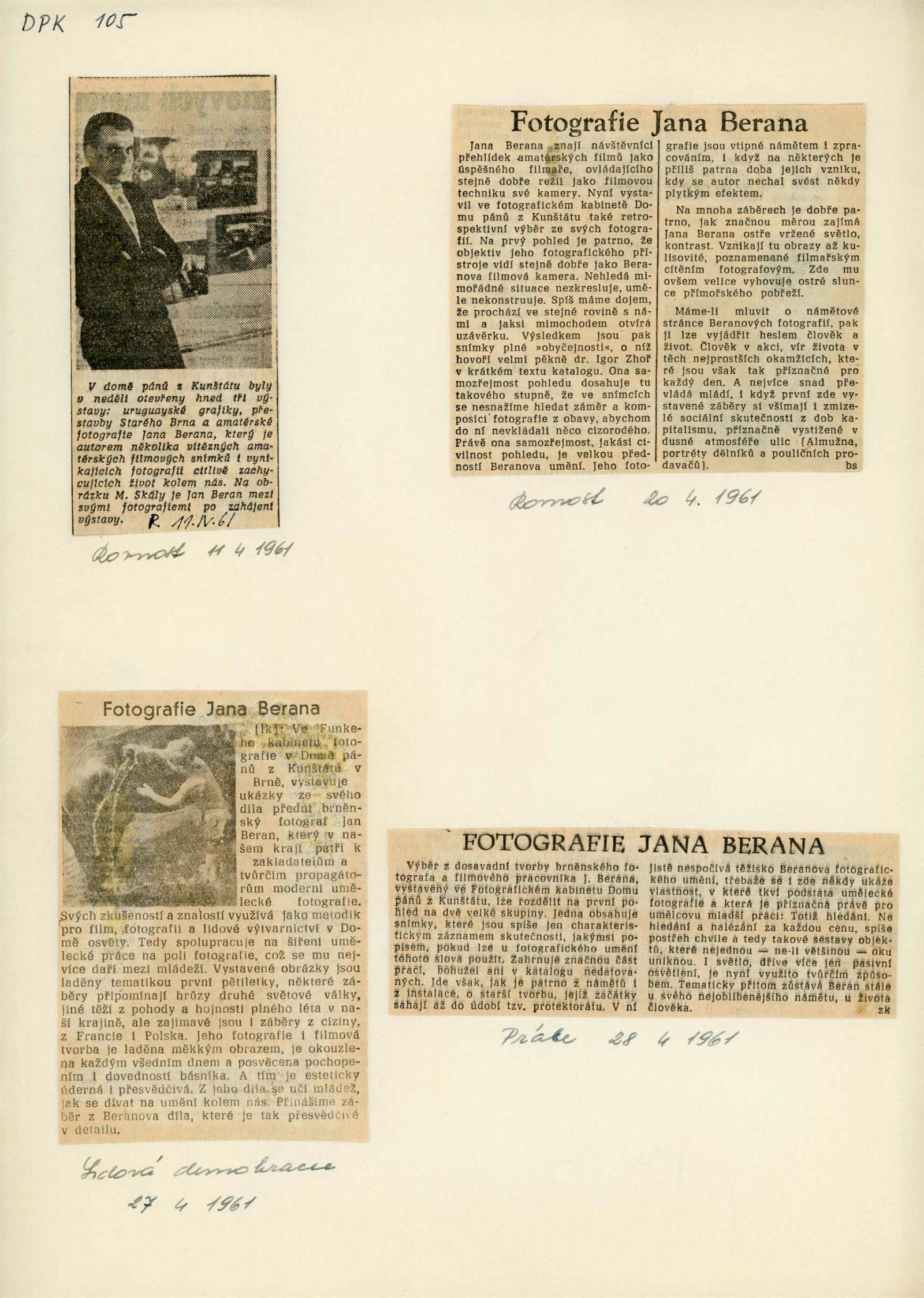 Fotografie Jana Berana: Dům umění města Brna / Dům pánů z Kunštátu, 22. výstava Kabinetu fotografie Jaromíra Funka, 8. 4. – 1. 5. 1961 / Text: Igor Zhoř. – Brno: DUmB, 1961. – skládačka, 6 s., obr., DPK 105. – MG