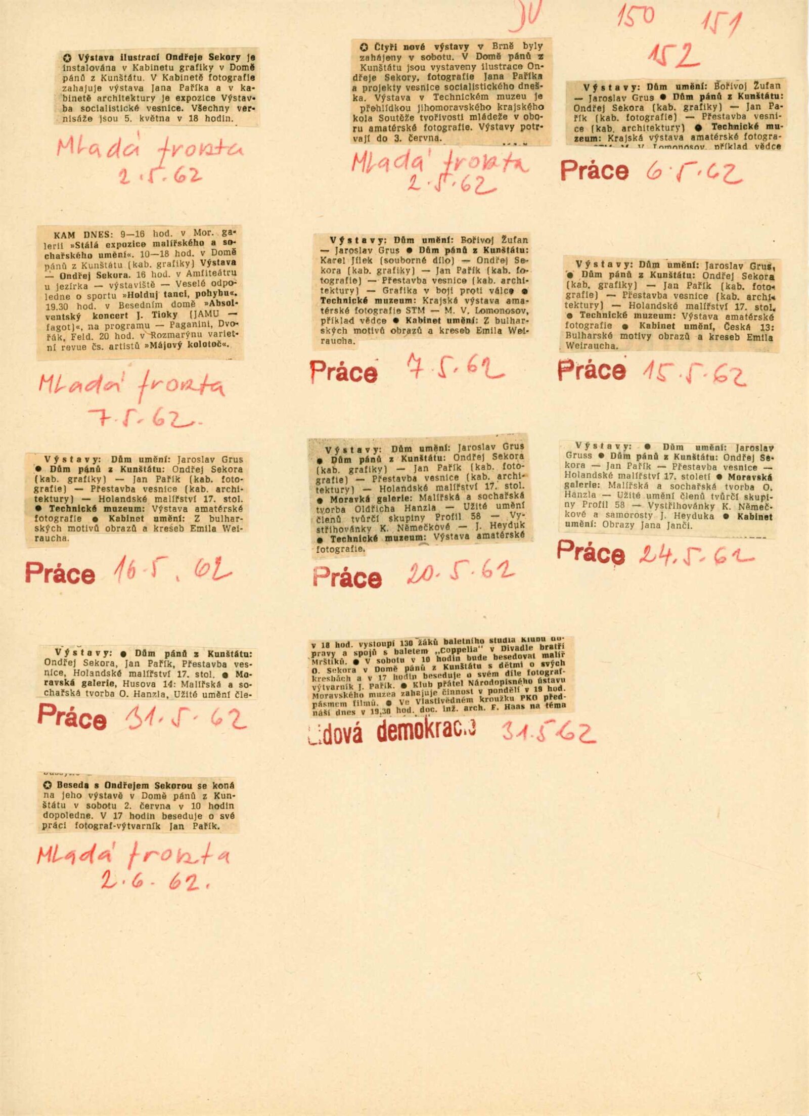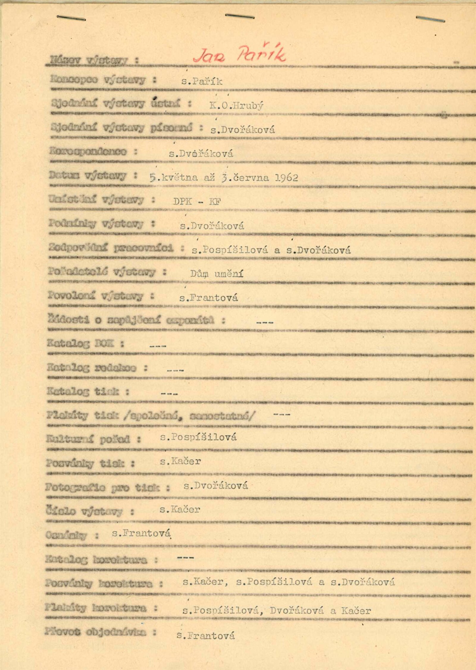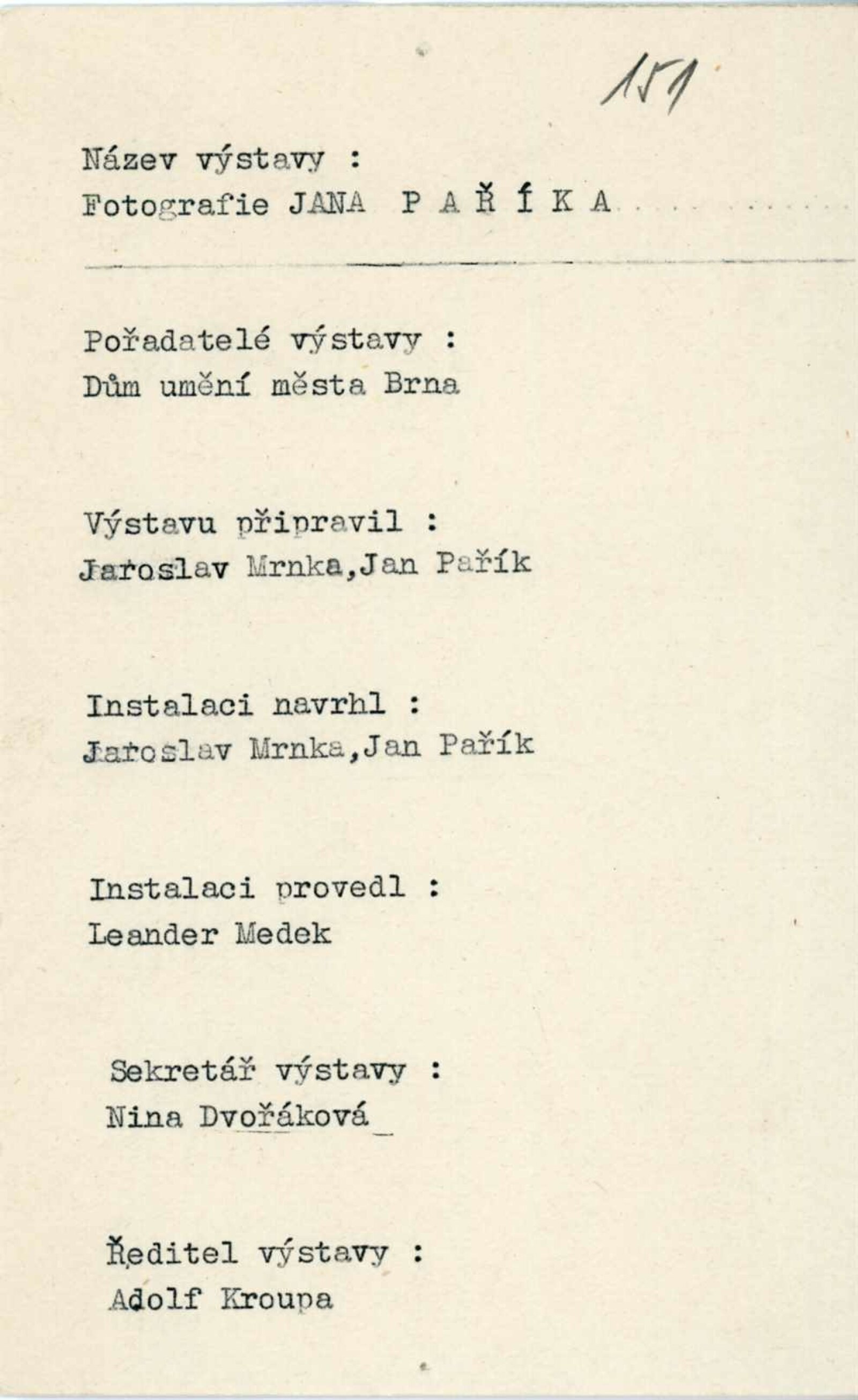 společná pozvánka DPK 150 a 152, pozvánka, pozvánka na besedu, karta k výstavě, podmínky pro uspořádání výstavy, korespondence (žádost Jana Paříka o výstavu společně s M. Jiravou – odmítnuto z instalačních důvodů, provozní korespondence), recenze v tisku