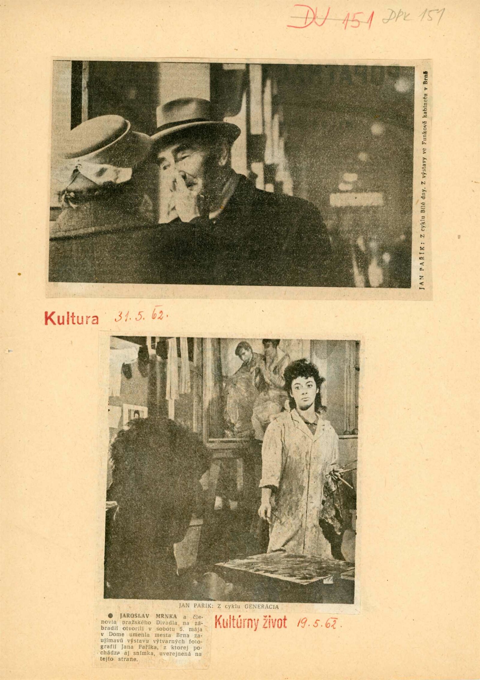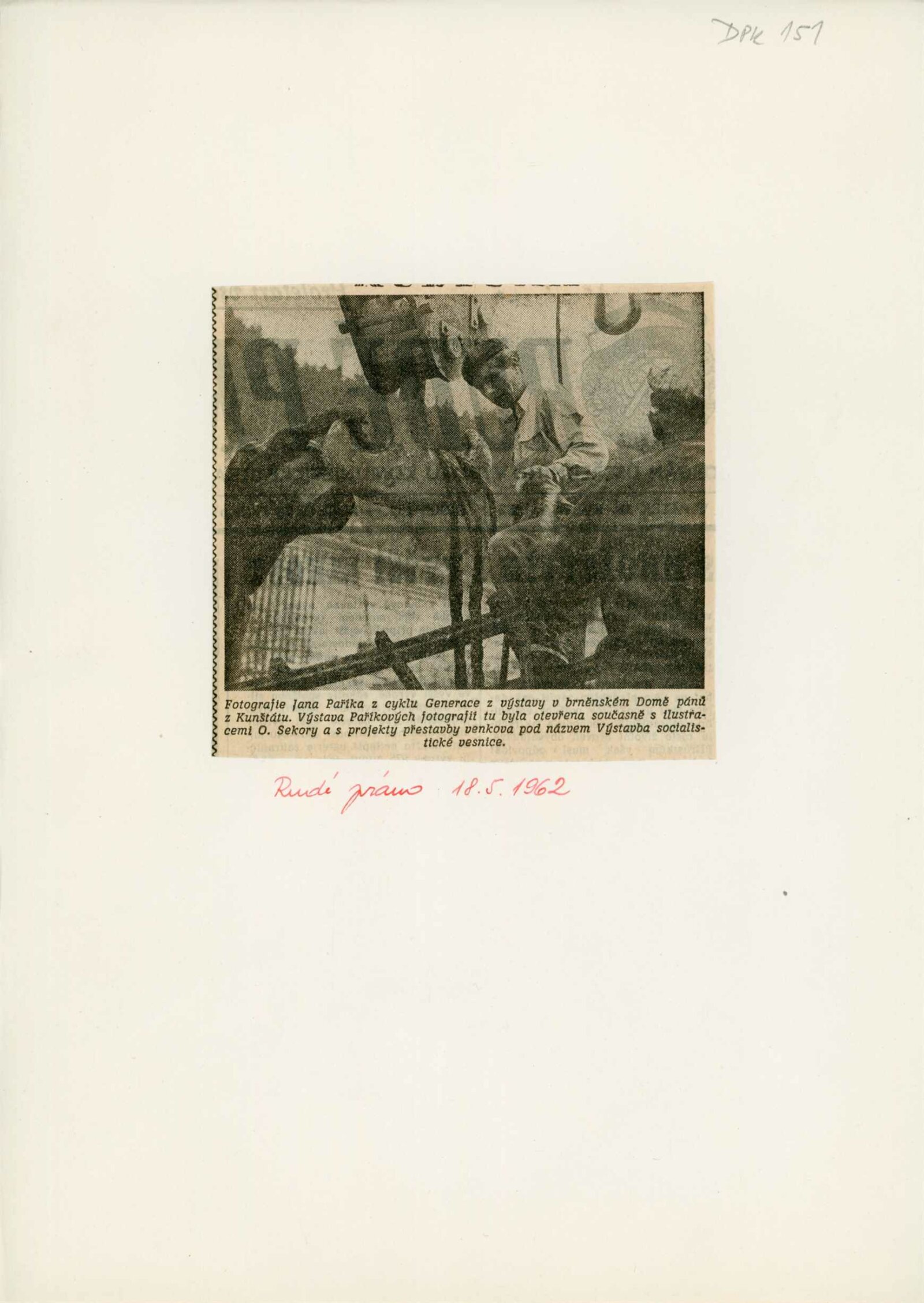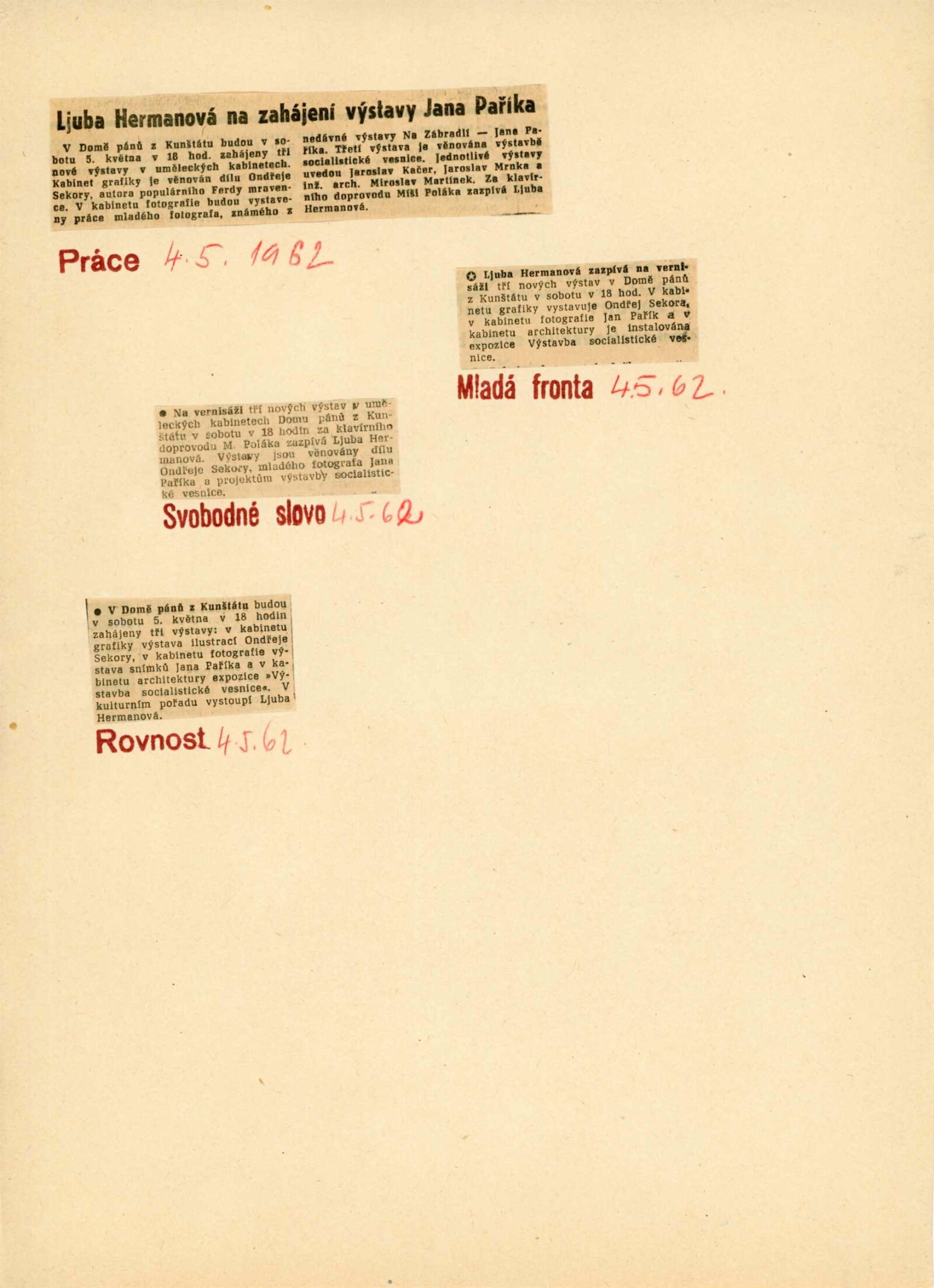 společná pozvánka DPK 150 a 152, pozvánka, pozvánka na besedu, karta k výstavě, podmínky pro uspořádání výstavy, korespondence (žádost Jana Paříka o výstavu společně s M. Jiravou – odmítnuto z instalačních důvodů, provozní korespondence), recenze v tisku