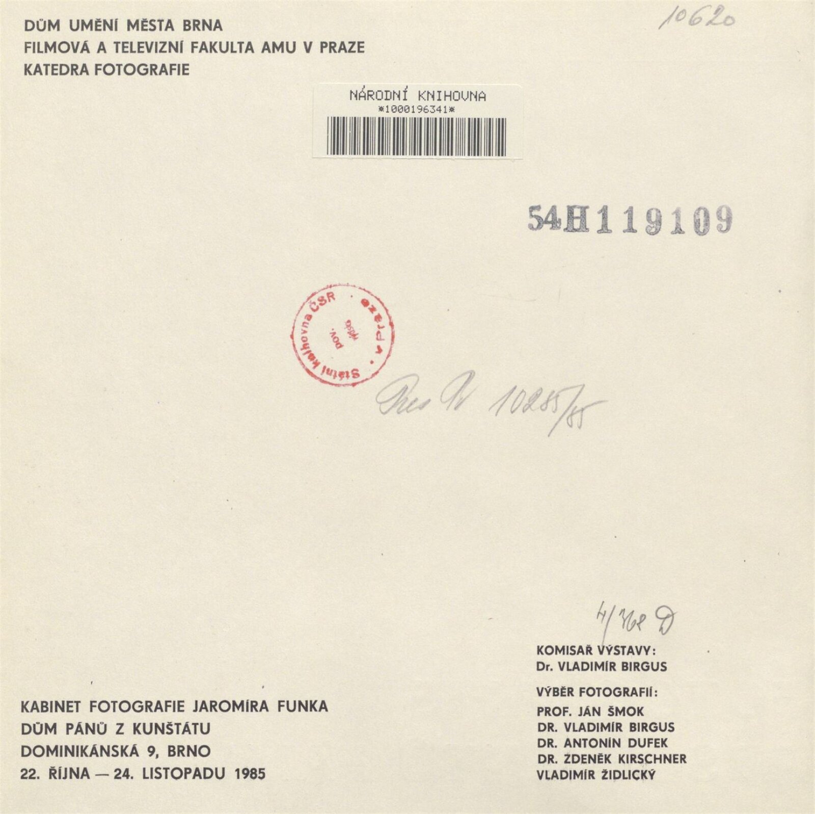 Fotografie studentů FAMU. Fotografie: Dům umění / Dům pánů z Kunštátu, Kabinet fotografie Jaromíra Funka, 22. 10. – 24. 11. 1985 / Text: Ján Šmok, Antonín Dufek. – Brno: DUmB, 1985. – 16 s., obr., seznam autorů a fotografií 7 s., DPK 854. – MZK; MG