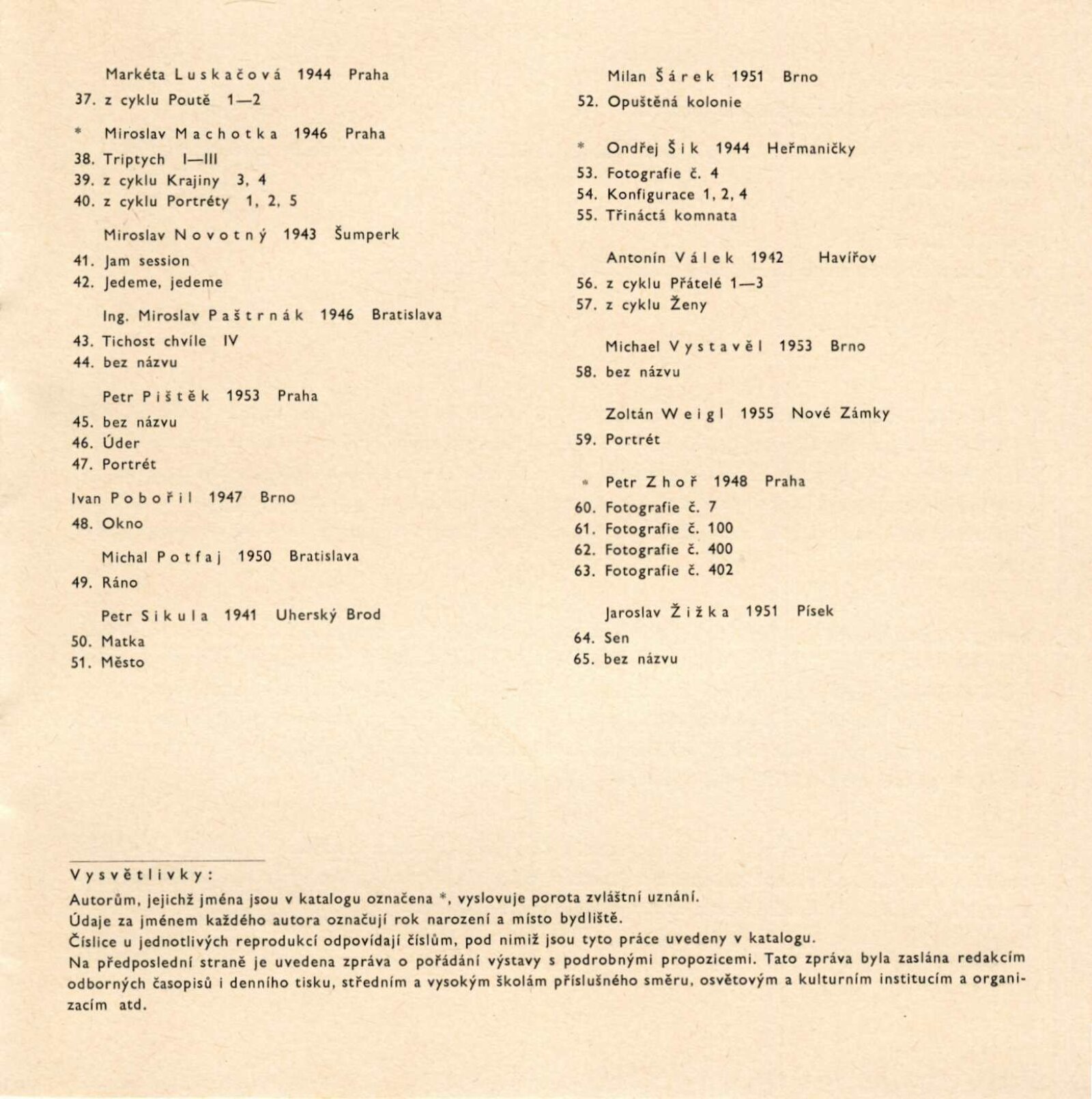 pozvánka, katalog, strojopis, autorské fotografie, úvodní slovo, dohoda o provedení práce s Antonínem Dufkem, seznamy adres a děl autorů, seznamy přihlášených do 1. – 3. kola + uznání 7 autorům, soupis všech zaslaných prací, propozice a podmínky výstavy, seznam periodik k propagaci, provozní korespondence s autory o účasti na výstavě, žádost o povolení výstavy, recenze v tisku