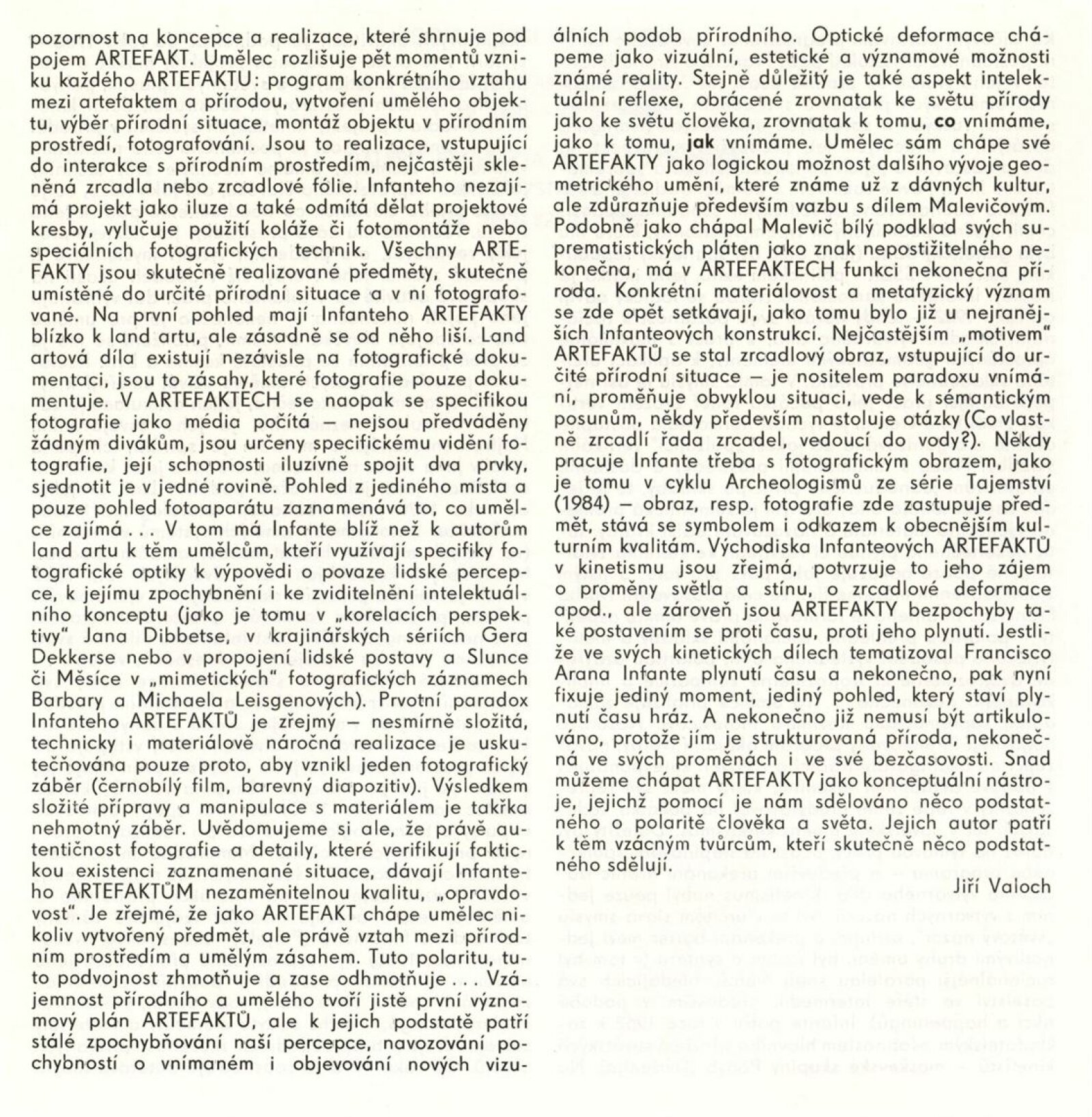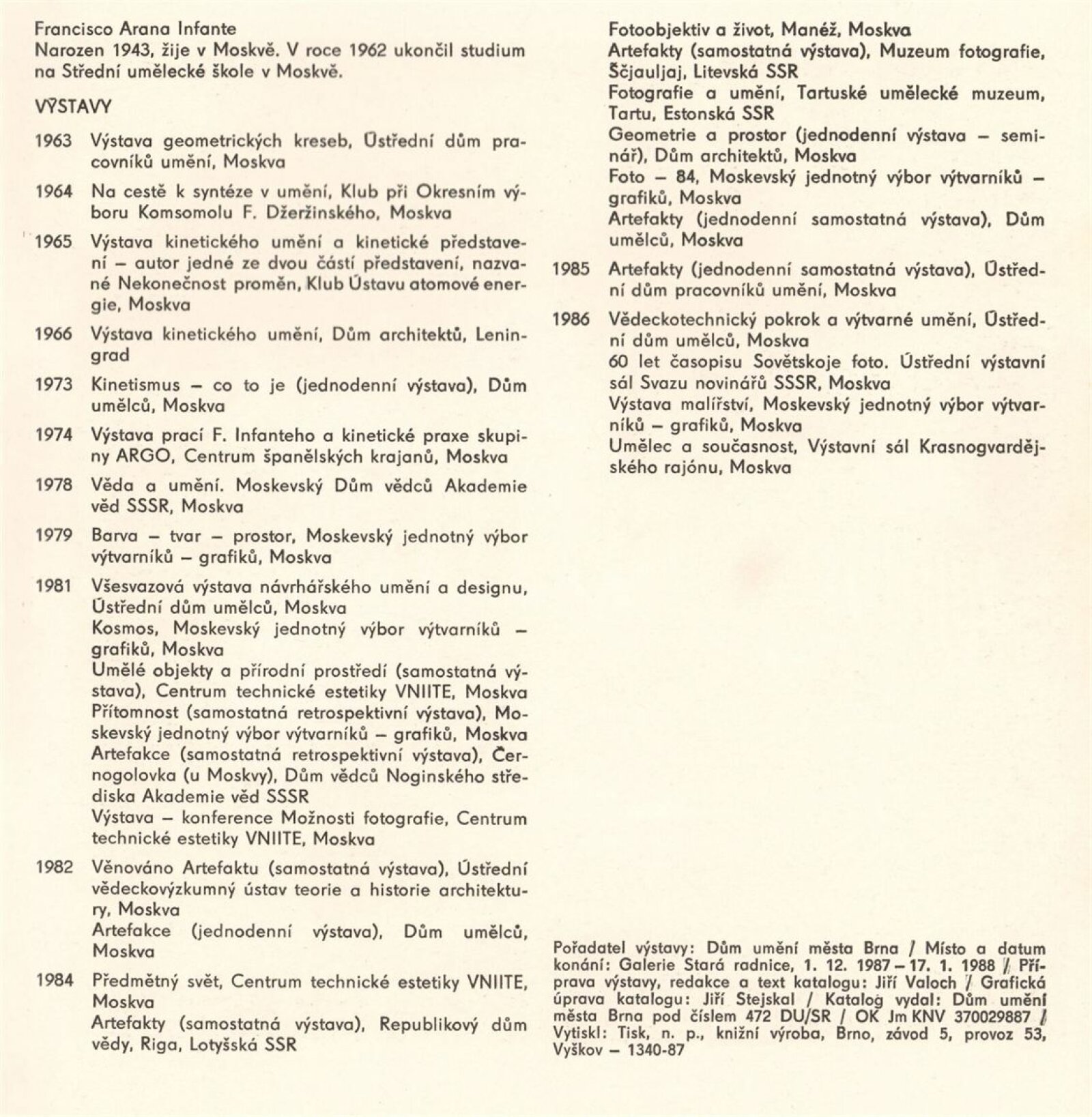 Francisco Arana Infante. Artefakty a kresby: Galerie Stará radnice, 1. 12. 1987 – 17. 1. 1988 / Text: Jiří Valoch. – Brno: DUmB, 1987. – [26] s., obr., životní data, výstavy, GSR 14. – MZK; MG; MMB