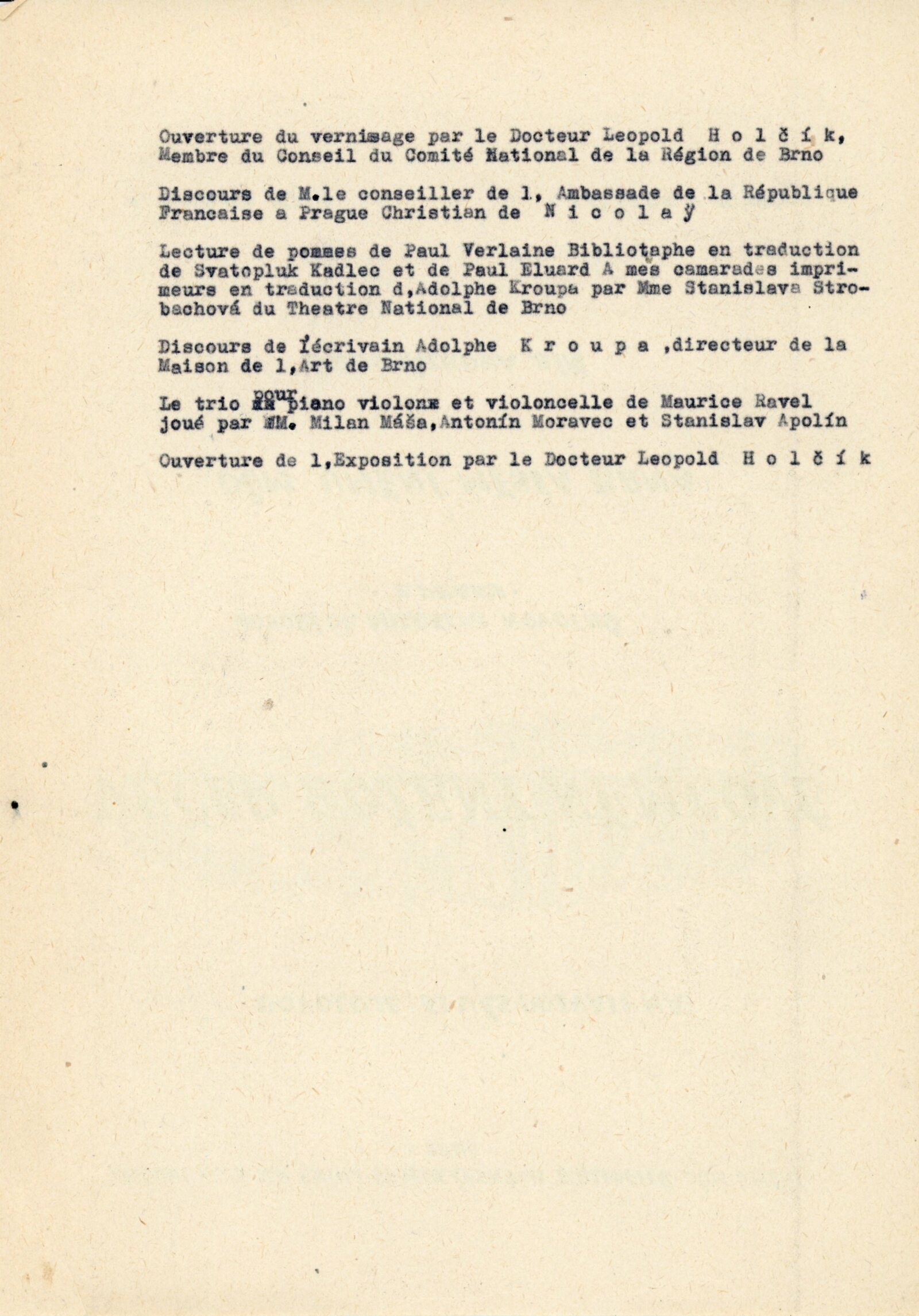 pozvánka, zahájení výstavy (Adolf Kroupa), báseň (Paul Verlaina), program vernisáže, nákres rozvržení výstavy na půdorysu přízemí DU, záznam o realizaci výstavy, záznam o jednání k výstavě, záznam tel. hovoru o přípravě návštěvy franc. velvyslance v DU, předávací protokoly, korespondence (dopisy z franc. ambasády, provozní korespondence)