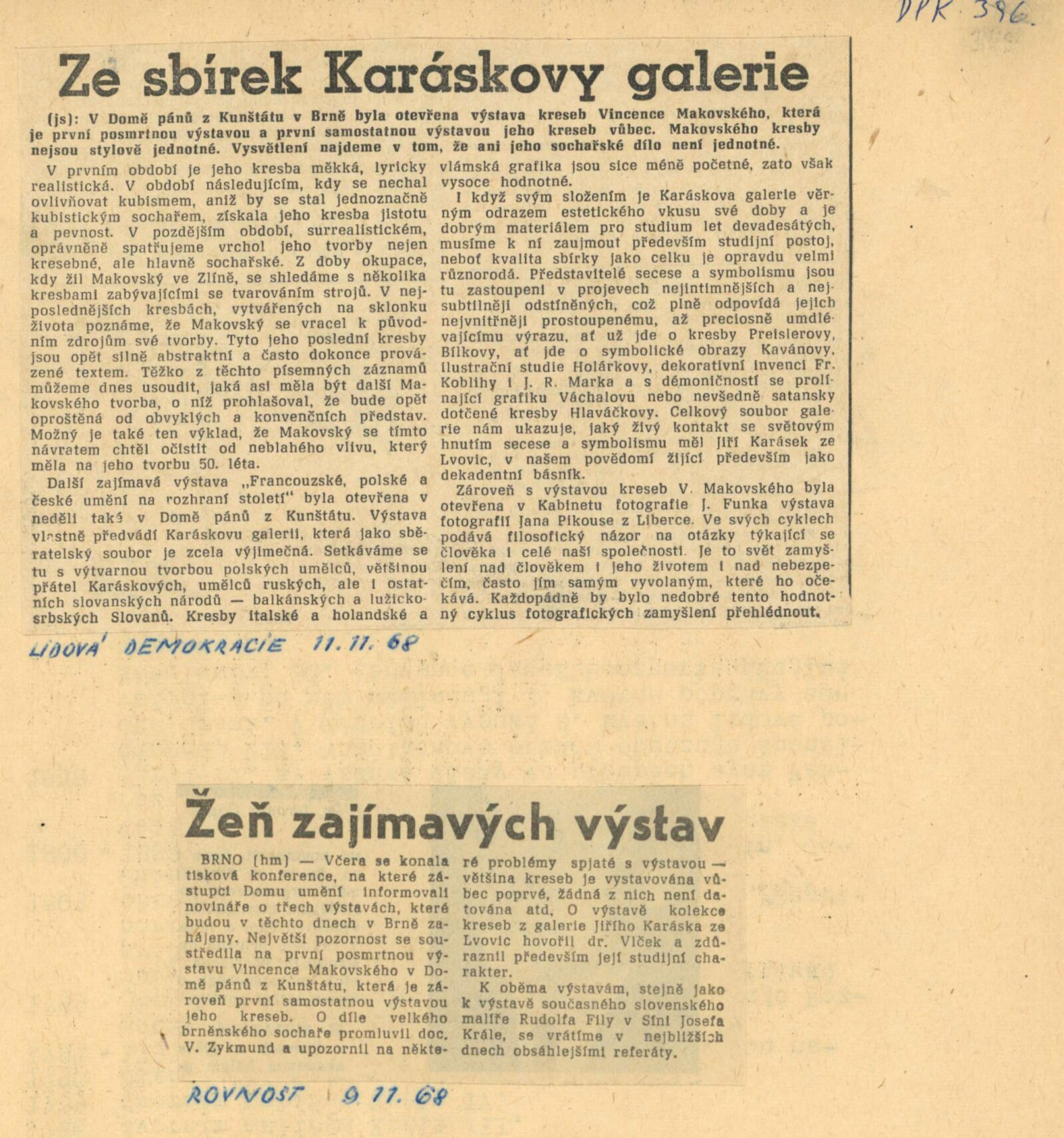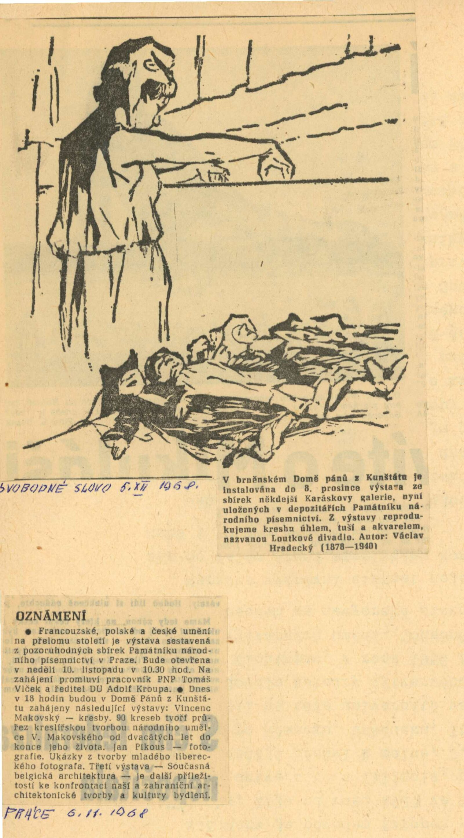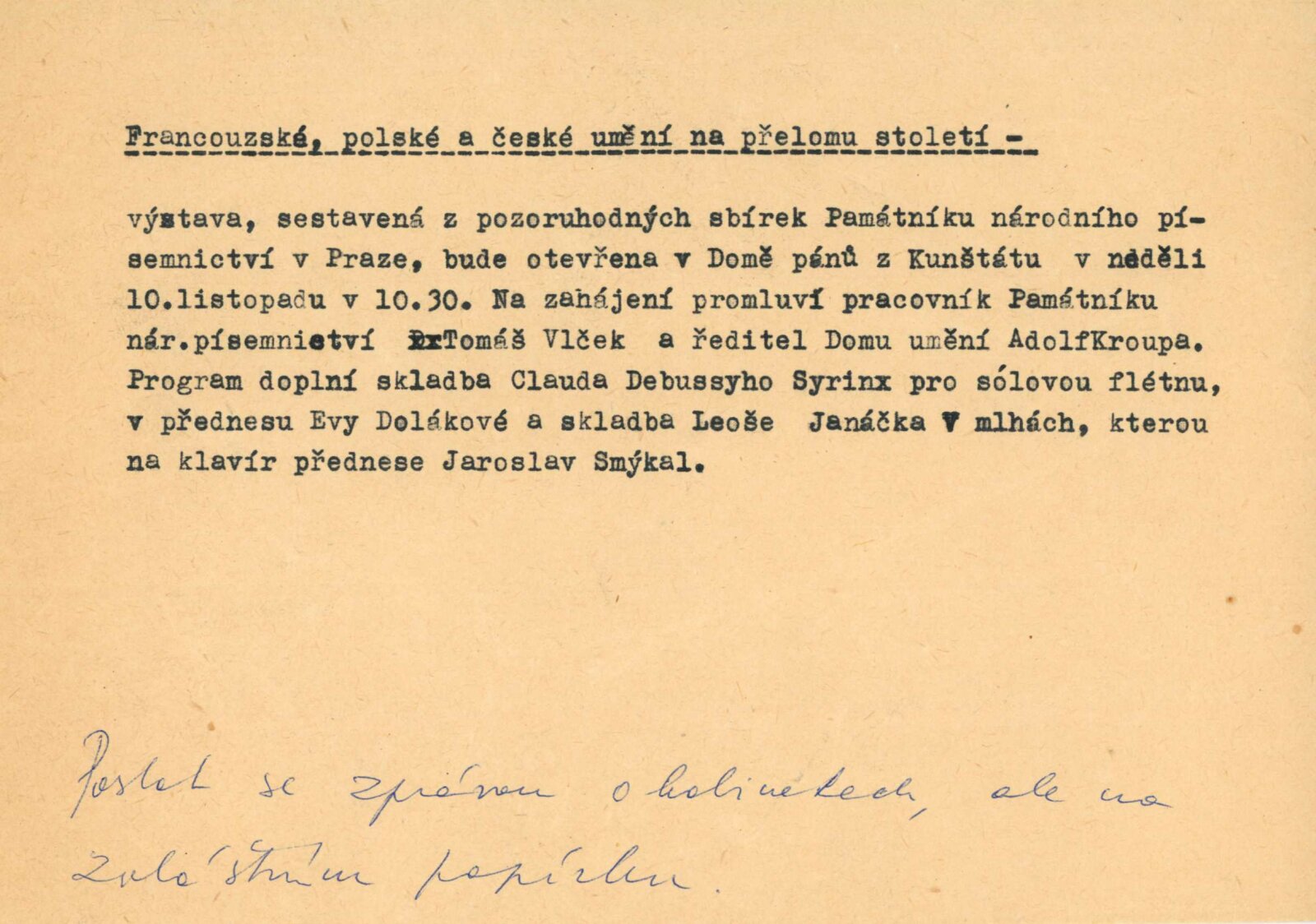 pozvánka, anotace, provozní korespondence (převoz tří výstav – Památník národního písemnictví, výpůjční záznamy), plán propagace výstavy, recenze v tisku, katalog „Francouzská kresba 19. a 20. století“ (Roudnice nad Labem), katalog „Polské malířství ve sbírkách Karáskovy galerie“ (Praha), katalog „Na rozhraní století“ (Praha)