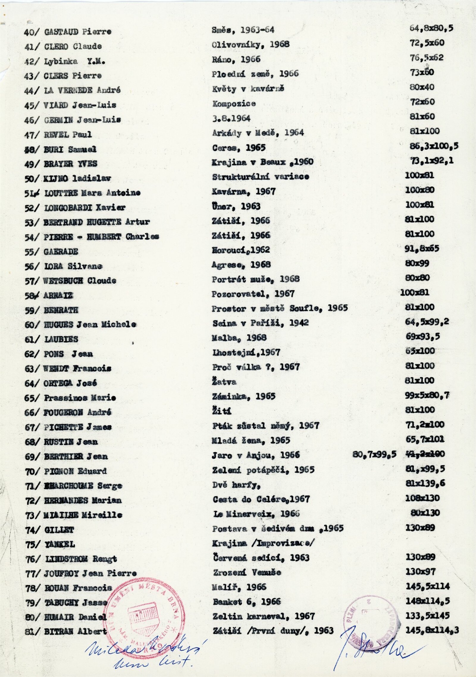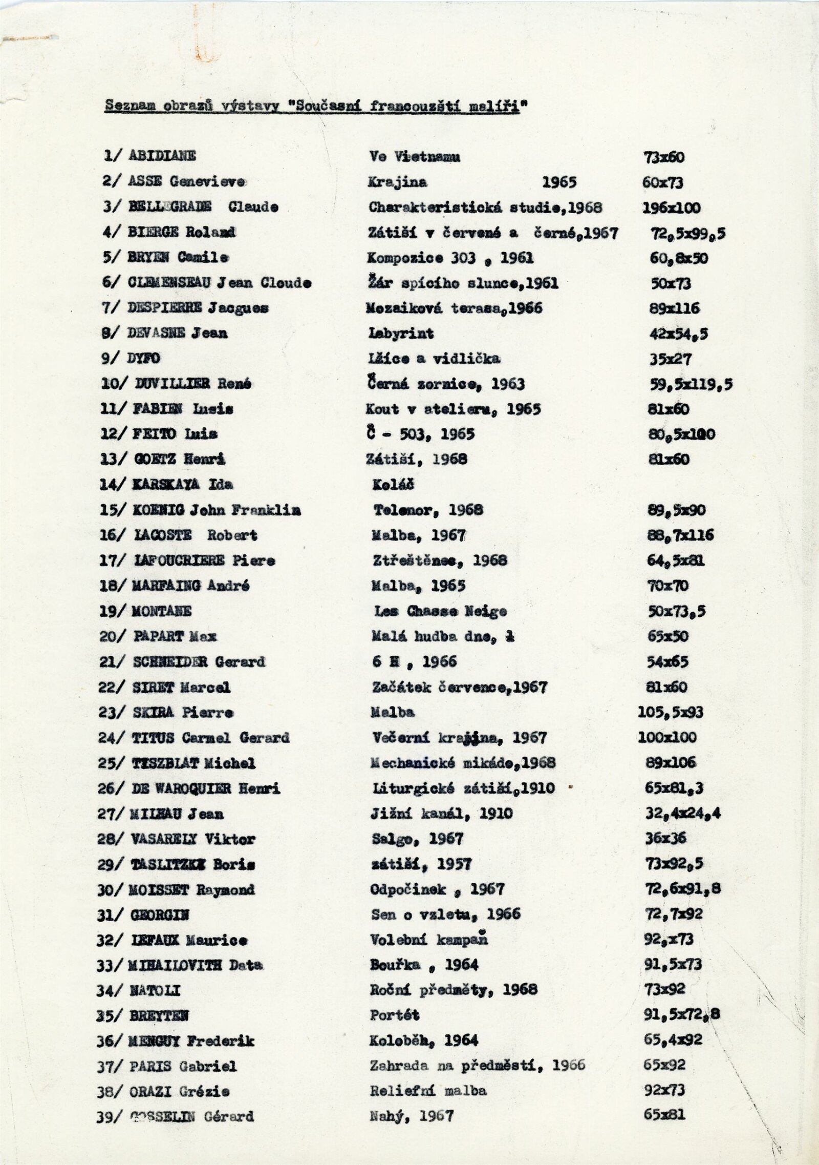 seznam vystavených děl, korespondence (s francouzským pořadatelem, provozní korespondence – převzetí výstavy z DU do Plzně), recenze v tisku, pozvánka (GHMP), pozvánka G. Apollinaire (Měst. knihovna Praha), pozvánka „Současné francouzské malířství“ GU Karlovy Vary – převzal DU