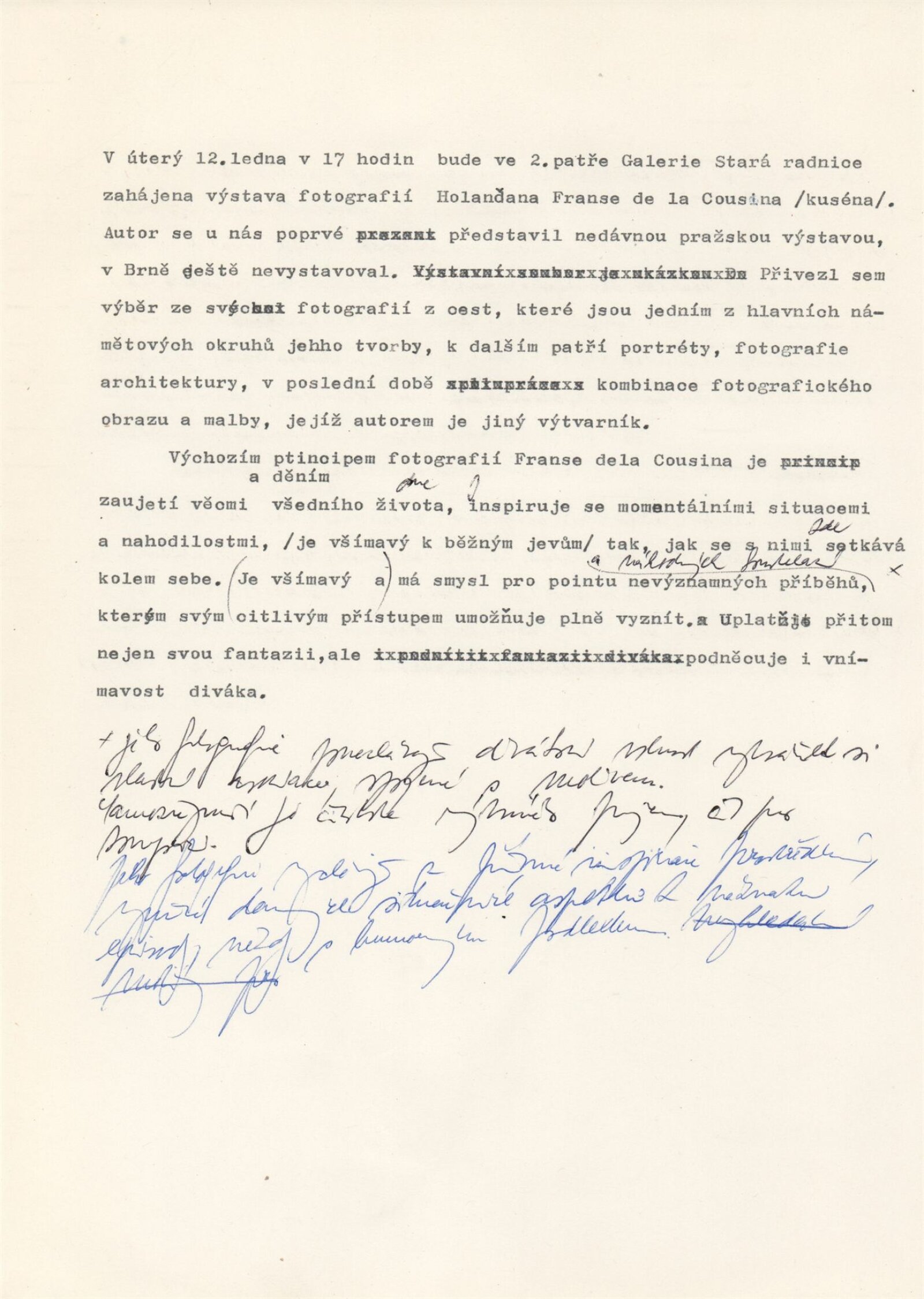 pozvánka, katalog, zprávy pro média, strojopis, seznam vystavených děl, korespondence, recenze v tisku, publikace o F. de la Cousine vydaná v Holandsku