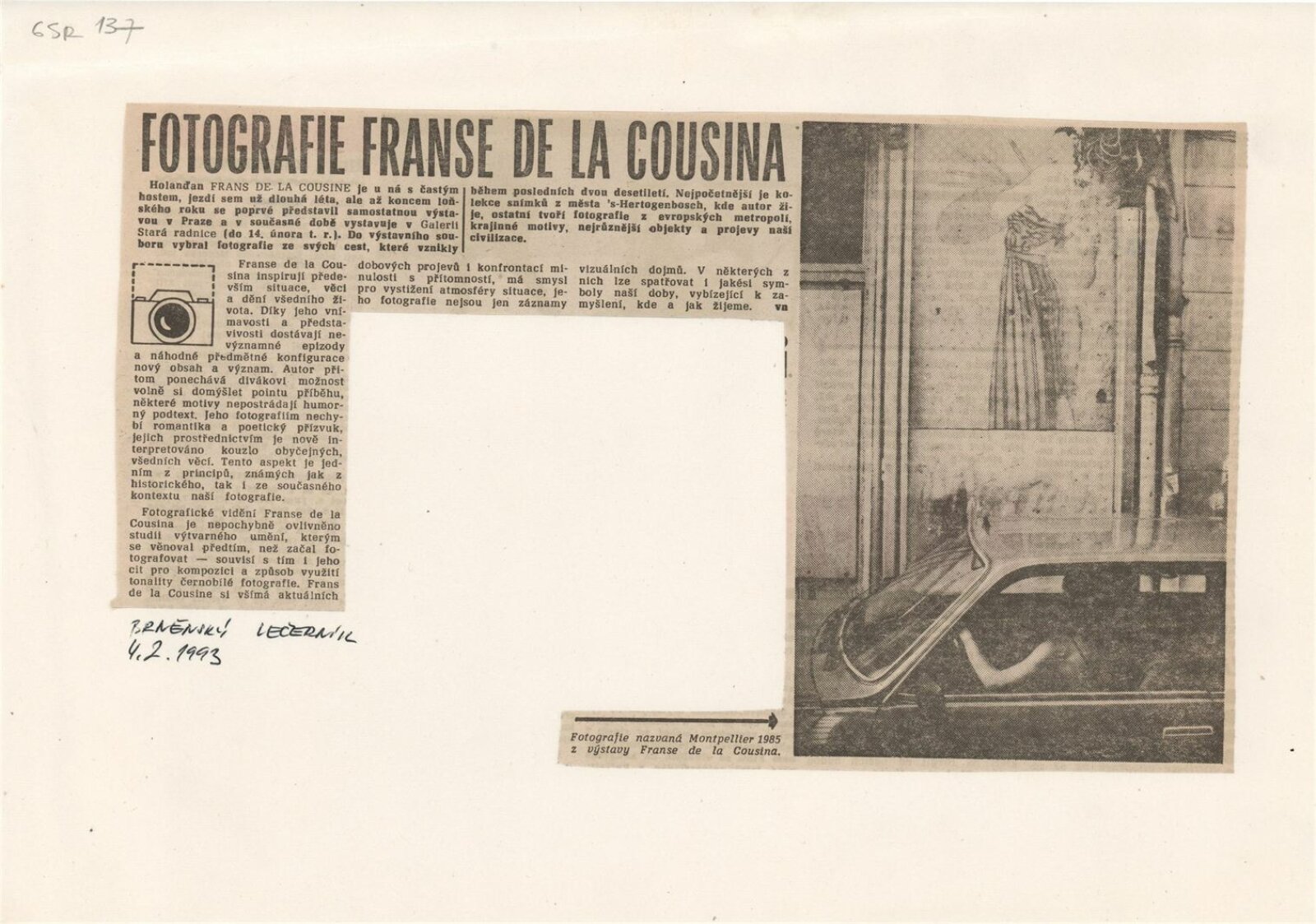 Frans de la Cousine. Výběr fotografií: Galerie Stará radnice 12. 1. – 14. 2. 1993 / Text Antonín Dufek. - Brno: DUmB, - 1 skládačka (6 s., obr.) Životní data, výstavy GSR 137; MG