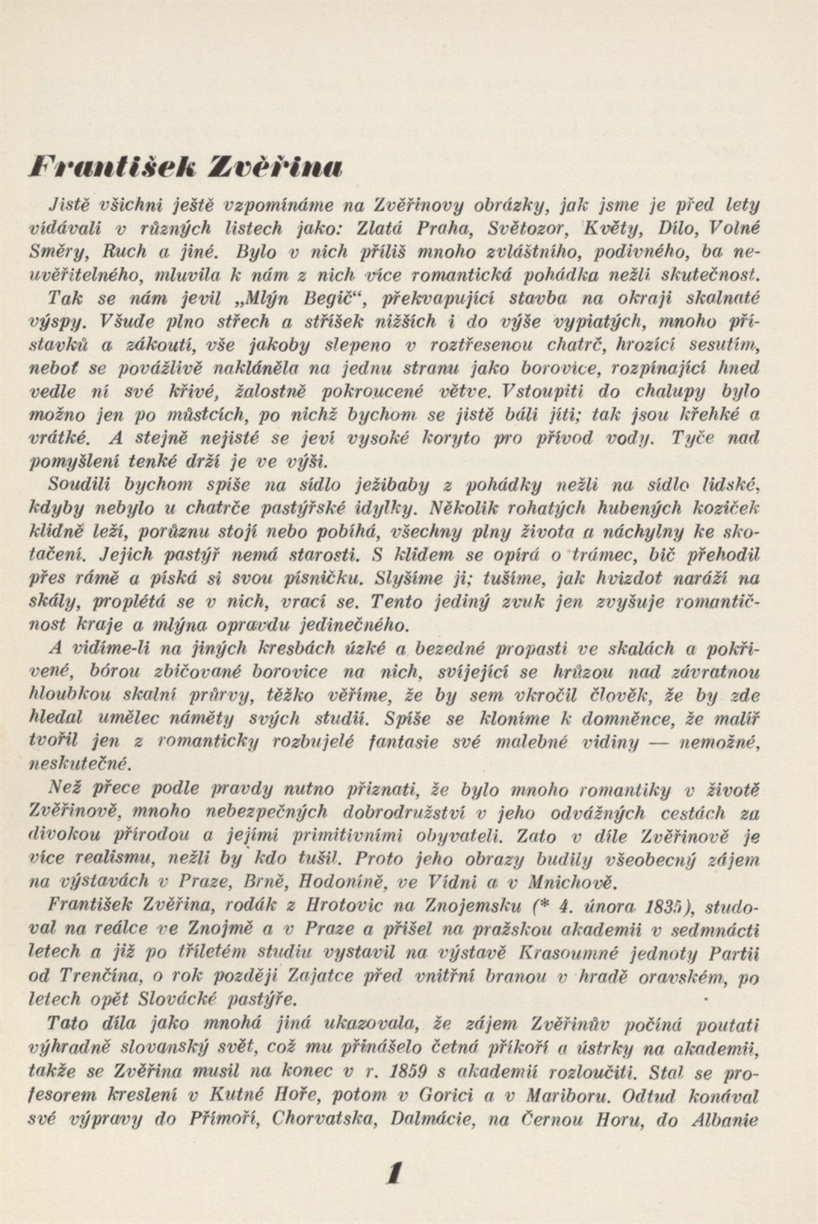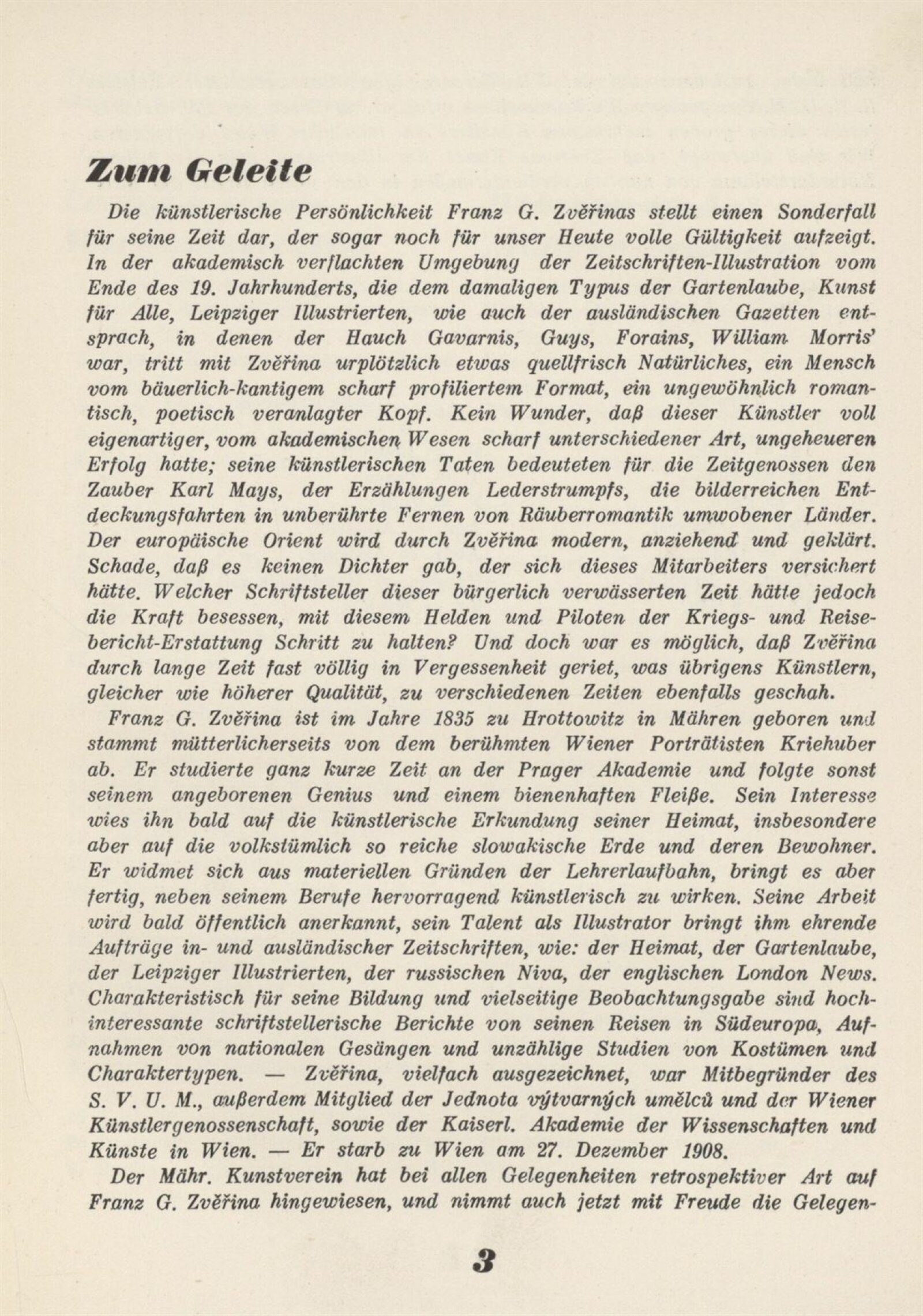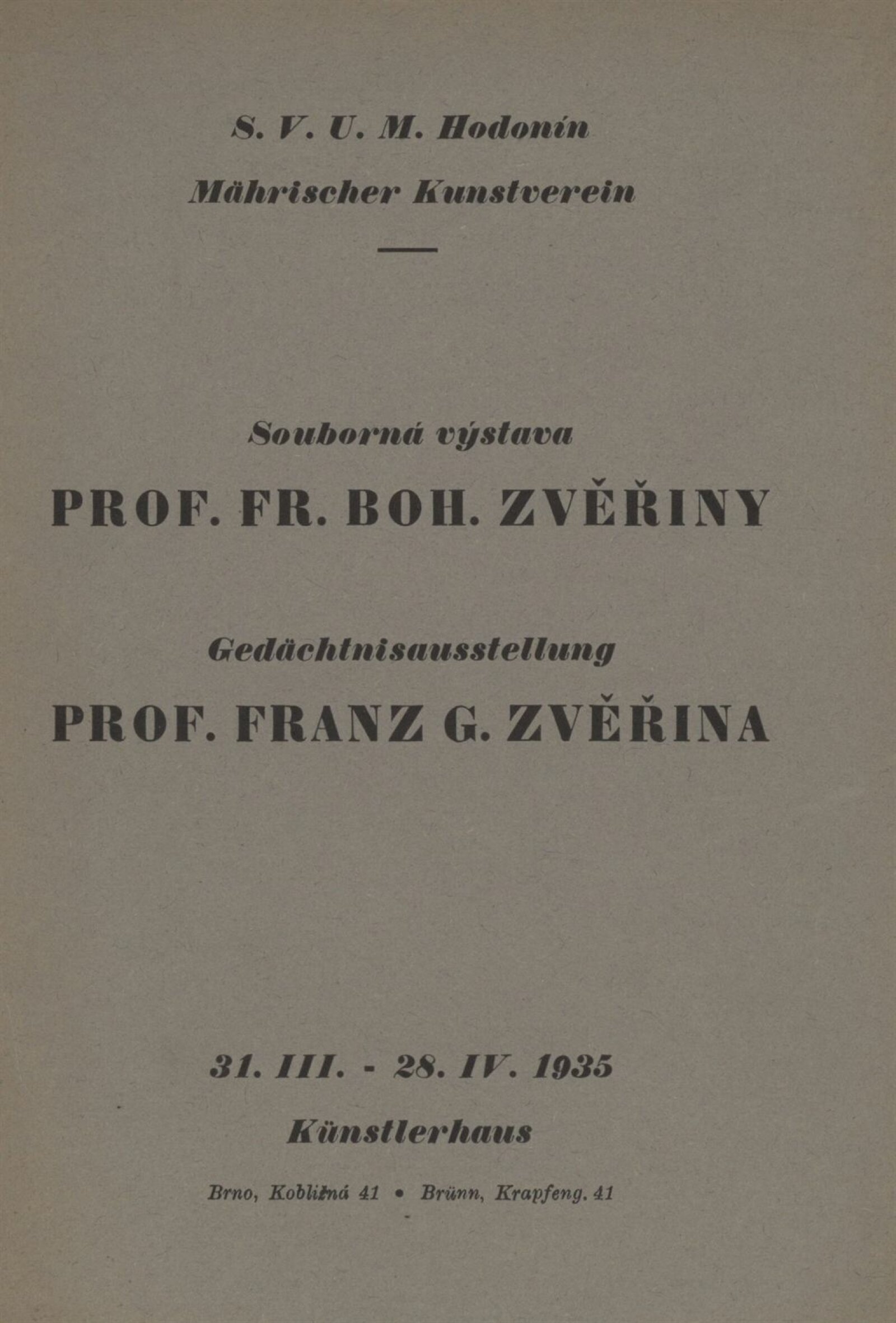 Souborná výstava Prof. Františka Boh. Zvěřiny: Künstlerhaus 31. 3. – 28. 4. 1935 / Texty: rys a V. Oppenheimer. – Brno: Mährischer Kunstverein, – 19 s. + ceník 4 s. Souběžný text německy Gedächtnisausstellung Prof. Franz B. Zvěřina 1835–1908: Brünn 31. 3. – 28. 4. 1935 / Brünn: Mährischer Kunstverein, 1935. – 14 l. – Kubíček 8021; MZK; MG