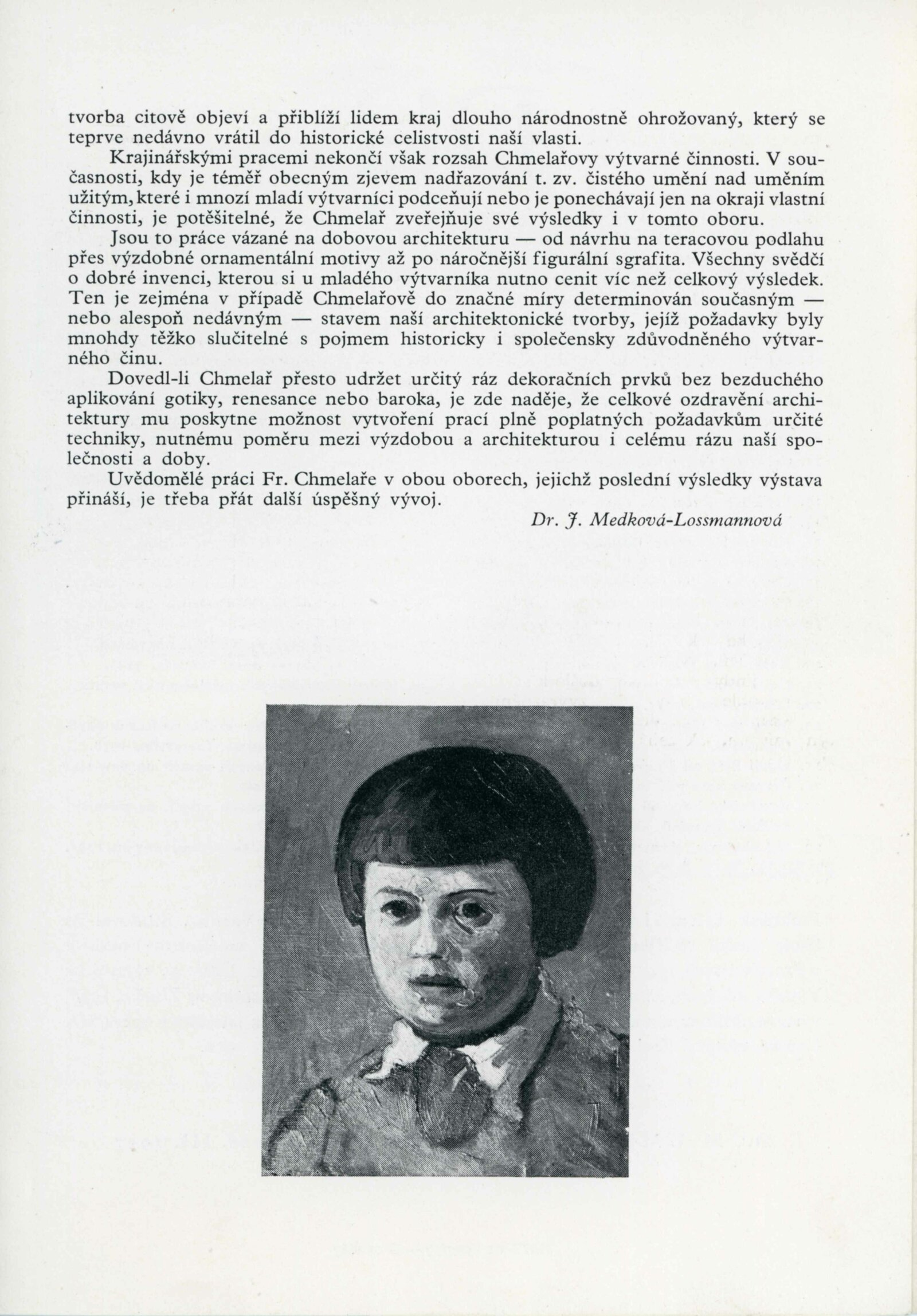 František Chmelař. Výstava prací z let 1954–1956: Dům umění města Brna, Malá galerie, 3. 3. – 28. 3. 1957 / Text: Jiřina Medková-Lossmannová. – Brno: DUmB, 1957. – 4 s., obr., životní data, DU 277. – MZK; MG; AMB; MMB