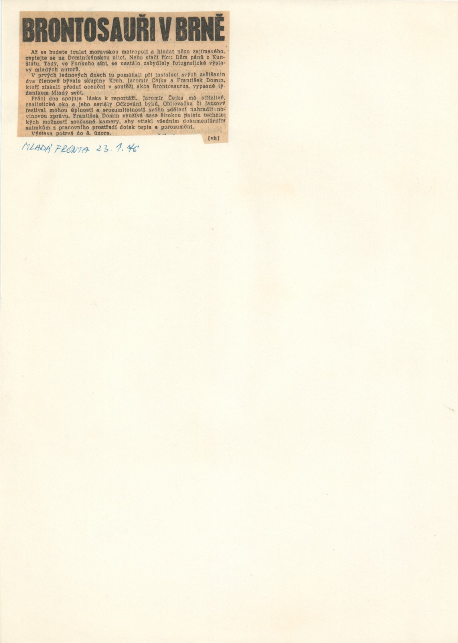 František Domin. Jaromír Čejka. Fotografie: Dům umění / Dům pánů z Kunštátu, Kabinet fotografie Jaromíra Funka, 9. 1. – 8. 2. 1976 / Text: Vladimír Remeš. – Brno: DUmB, 1976. – 12 s., obr., DPK 617. – MZK; MG
