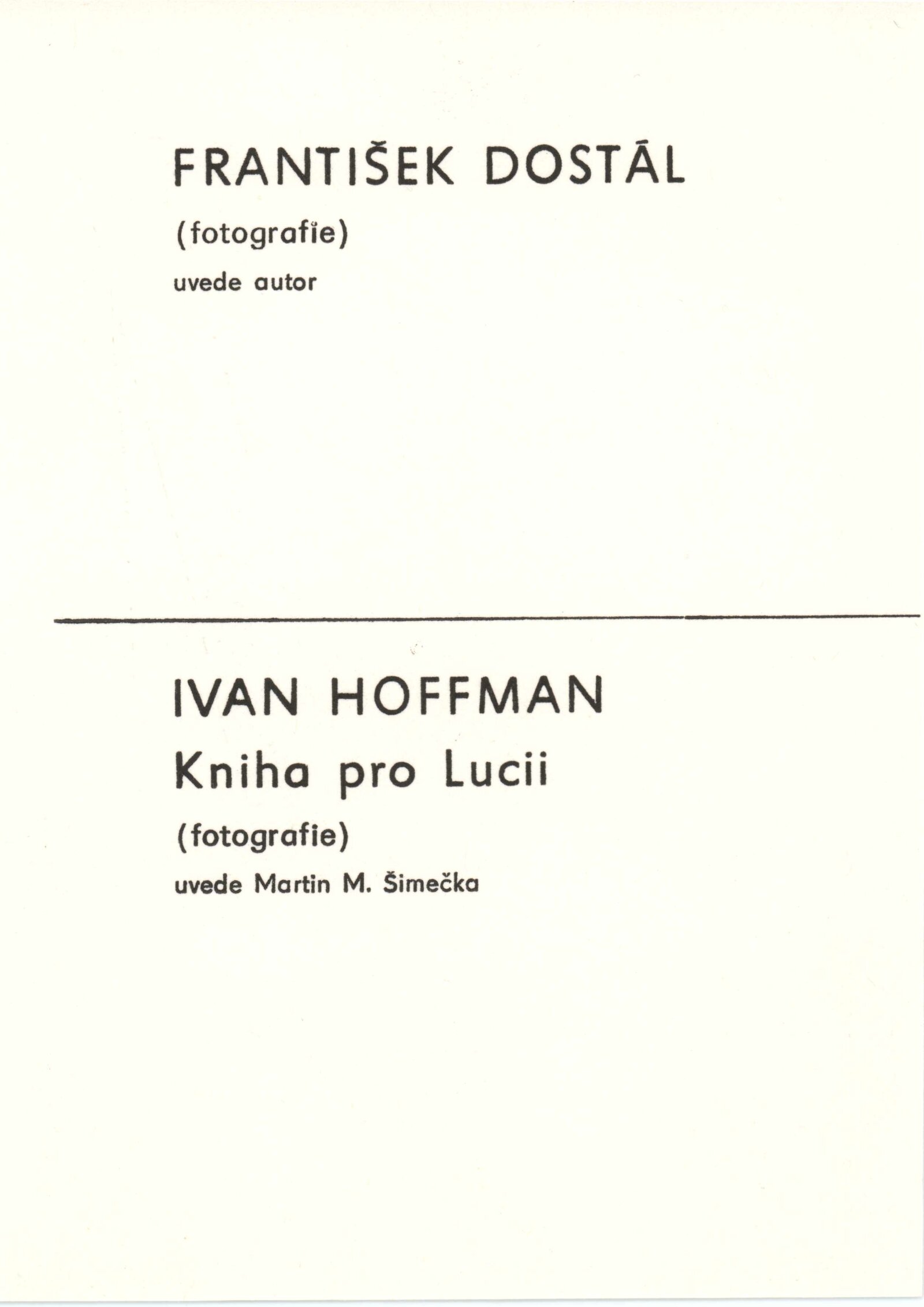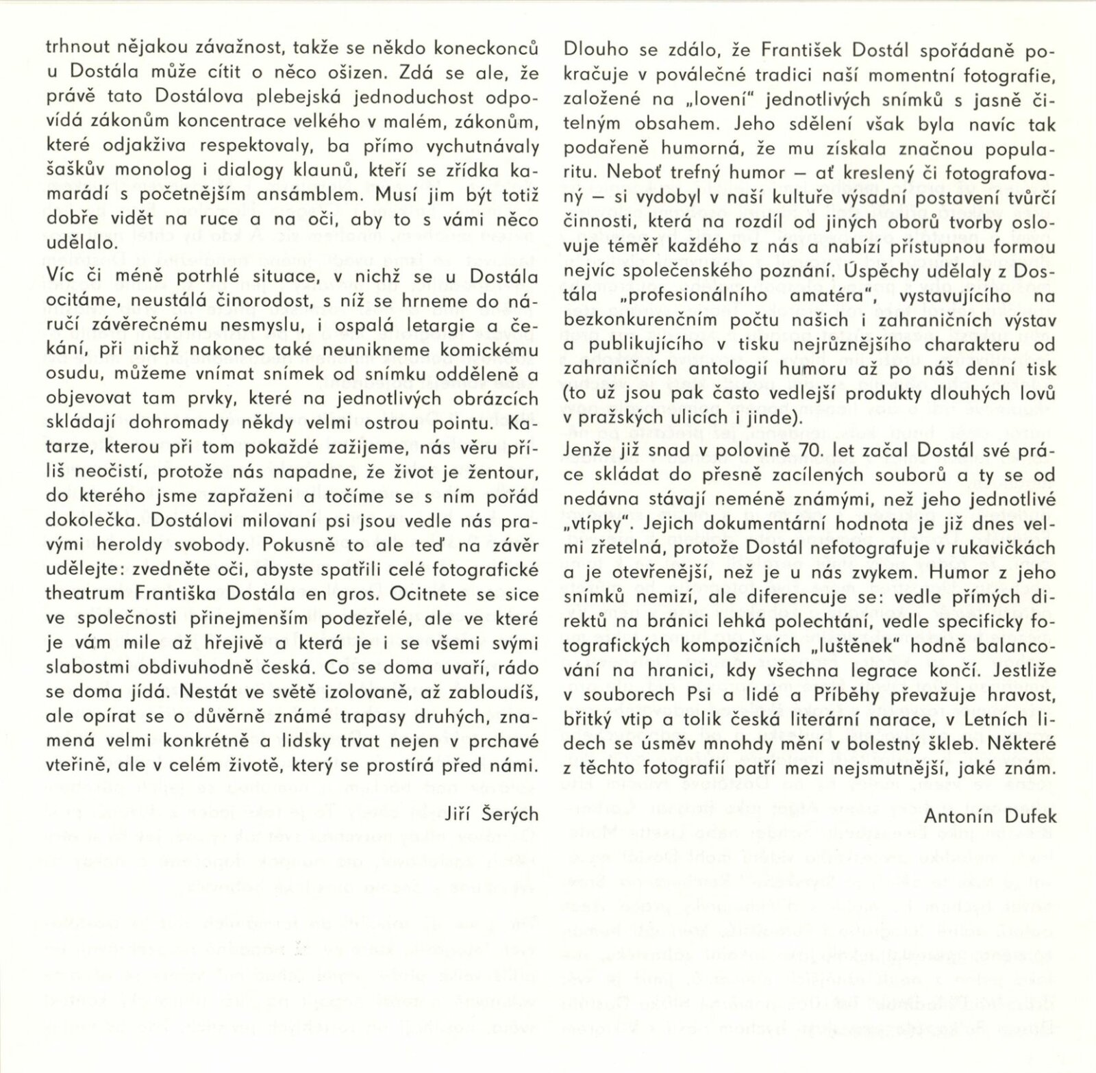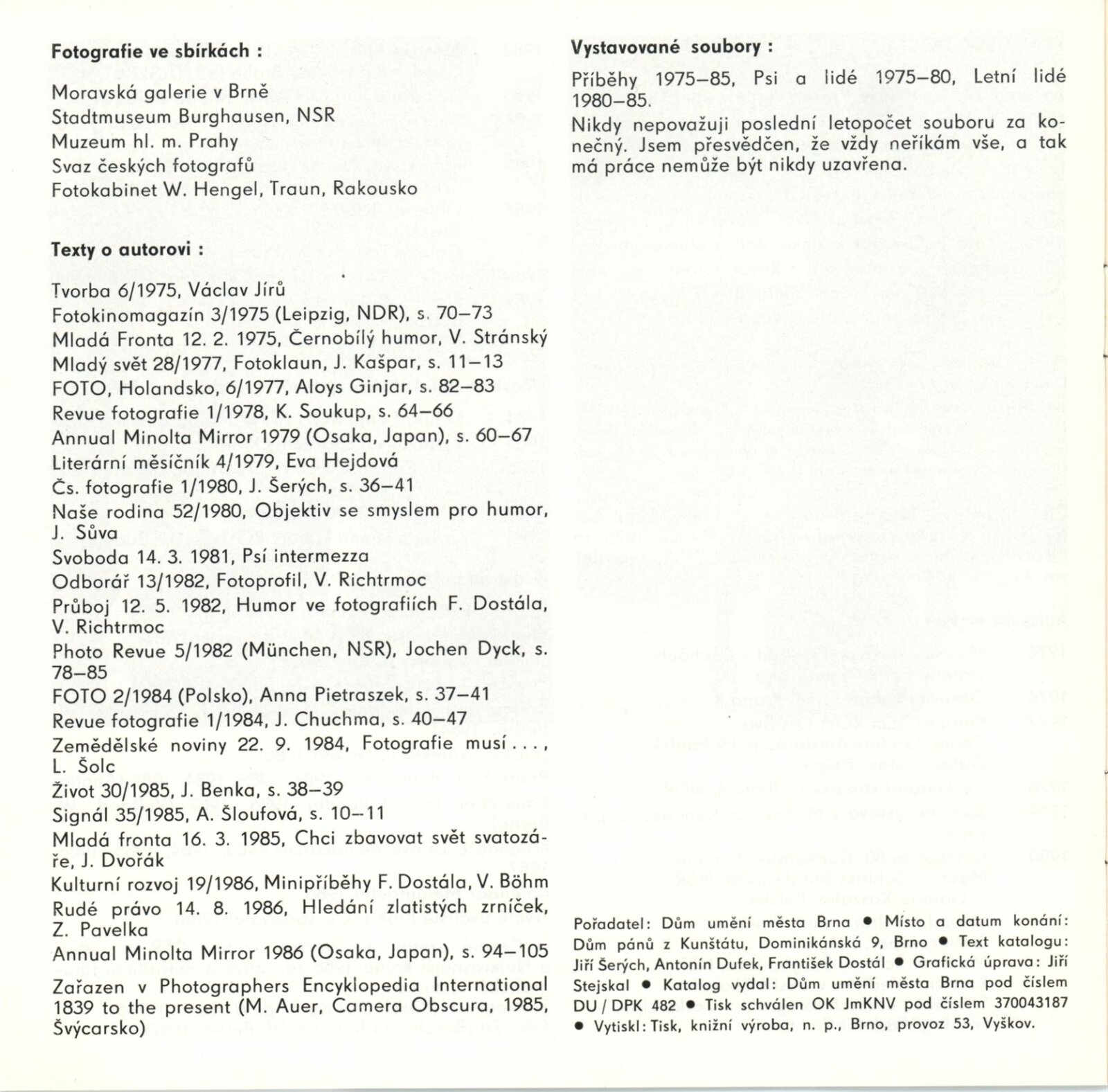 František Dostál. Fotografie: Dům pánů z Kunštátu [spr. Galerie Stará radnice, 17. 3. – 17. 4. 1988] / Texty: Jiří Šerých, Antonín Dufek, autor. – Brno: DUmB, 1988. – [12] s., obr., životní data, výstavy, účast na publikacích, bibliografie, GSR 21. – MZK; MG