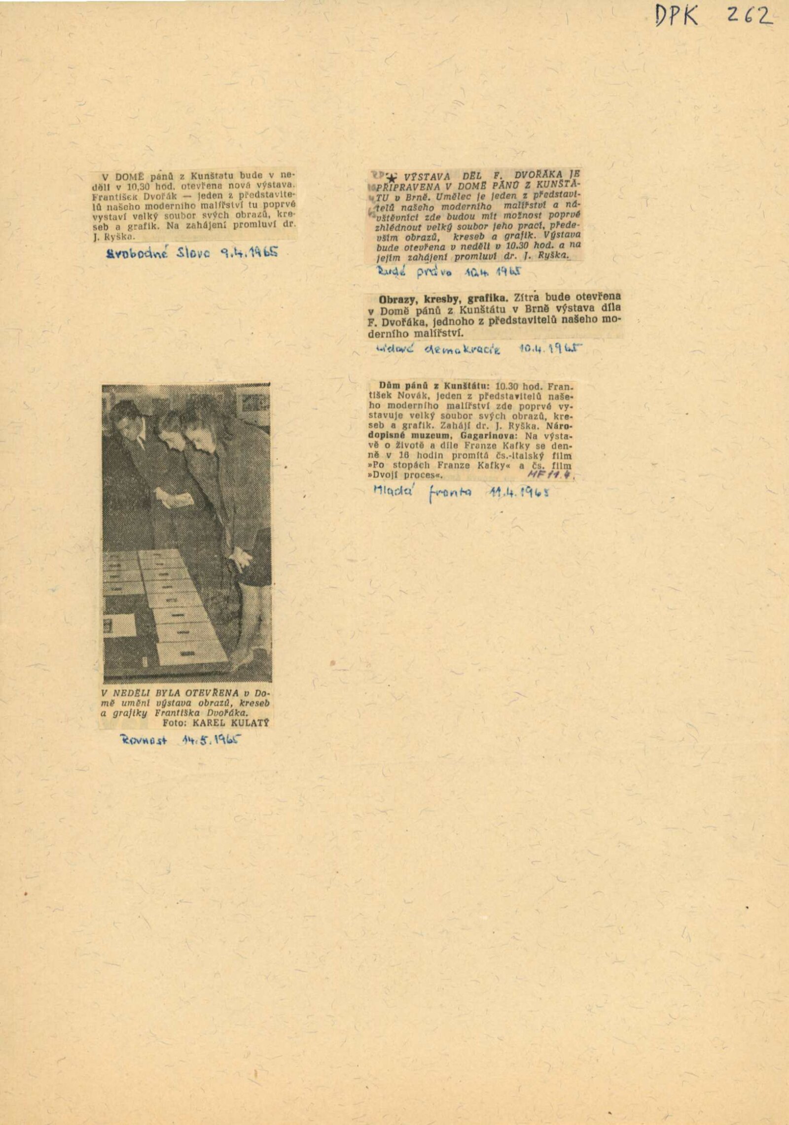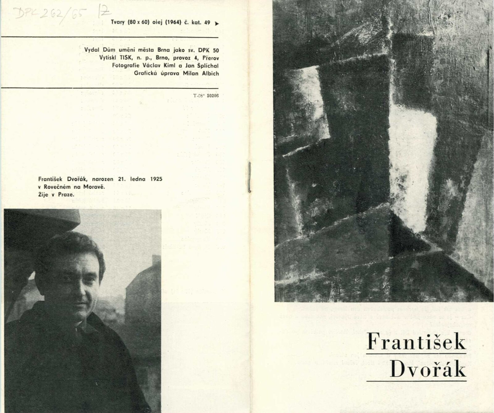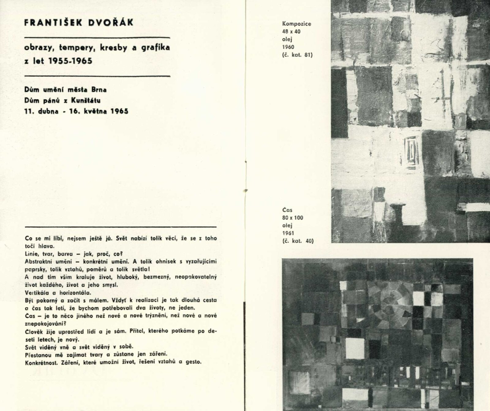František Dvořák. Obrazy, tempery, kresby a grafika z let 1955–1965: Dům umění města Brna / Dům pánů z Kunštátu, 1. patro, 11. 4. – 16. 5. 1965 / Text: autor. – Brno: DUmB, 1965. – 12 s., obr., portrét, životní data, DPK 262. – MZK; MG; MMB