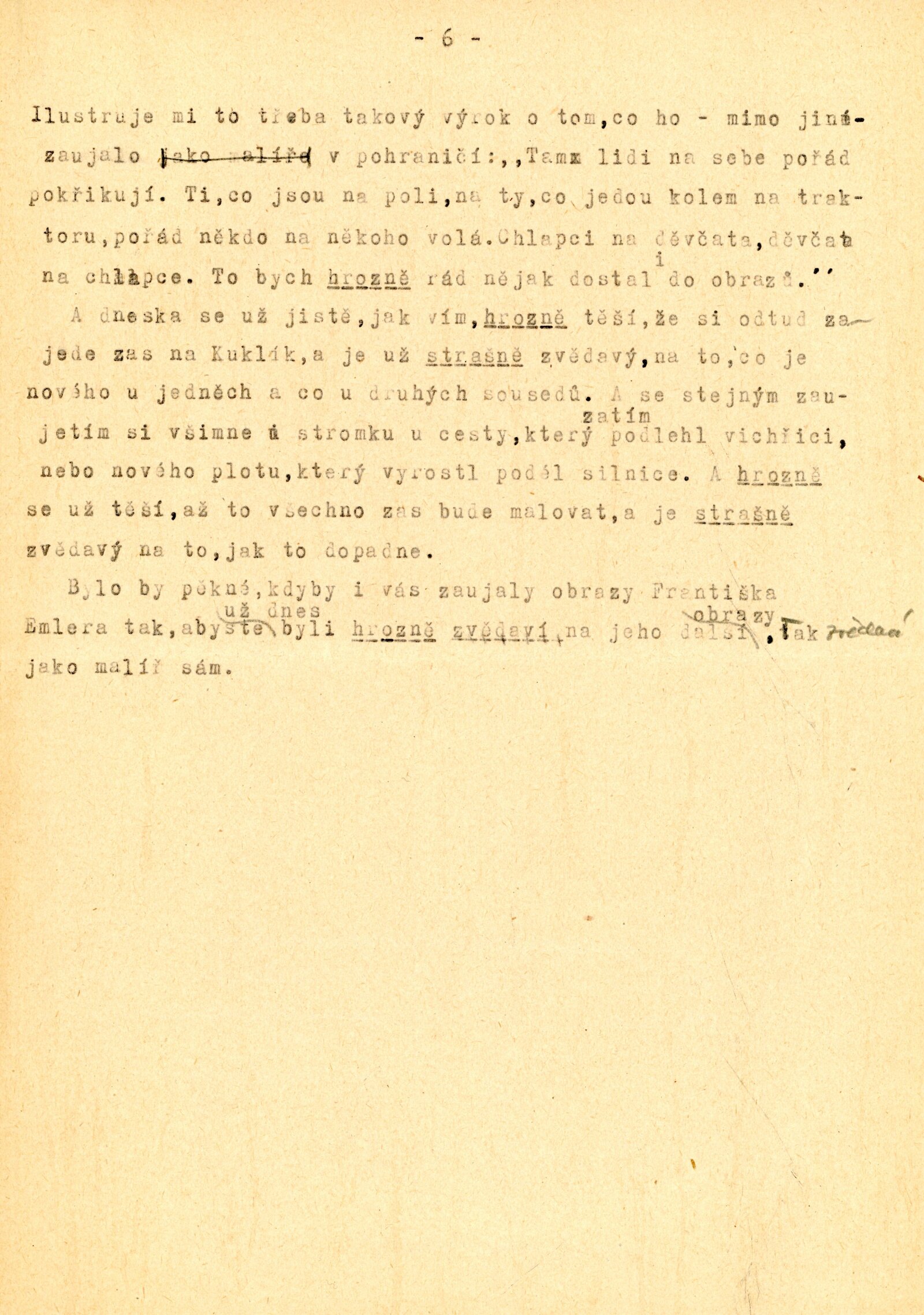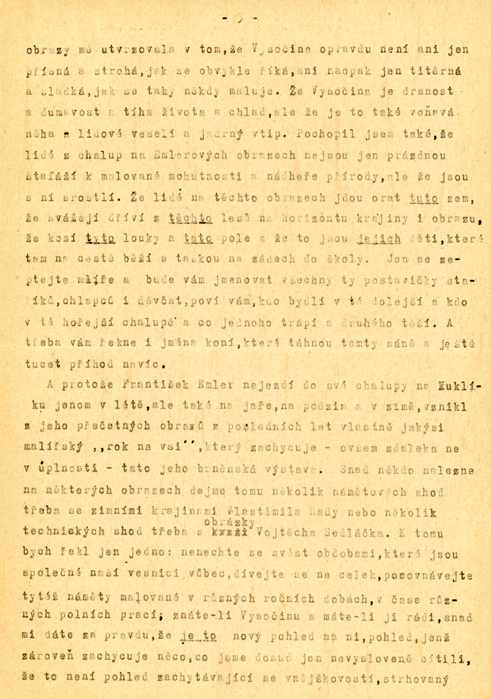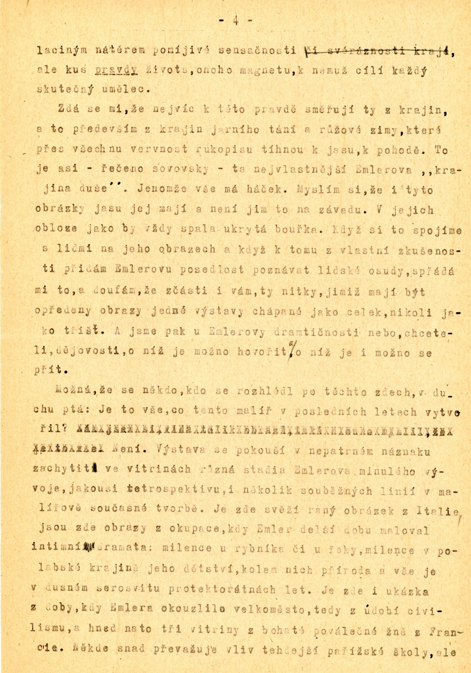 pozvánka, úvod vernisáže Adolfa Kroupy, projev Ludvíka Kundery při zahájení, pozvánka na besedu s malířem, korespondence (rukopisy dopisů Františka Emlera, provozní korespondence), katalog